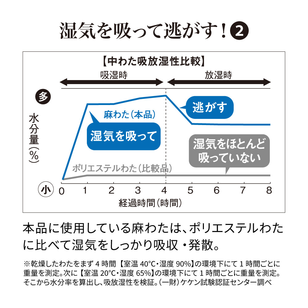 洗濯機で丸洗いOK(ネット使用) 麻わた入り製品はドライクリーニング指定が多い中、中わたに圧縮加工を施した本品はご自宅の洗濯機で洗えます。