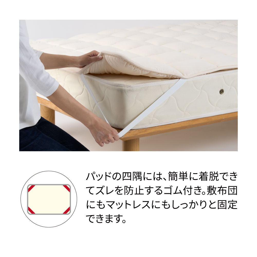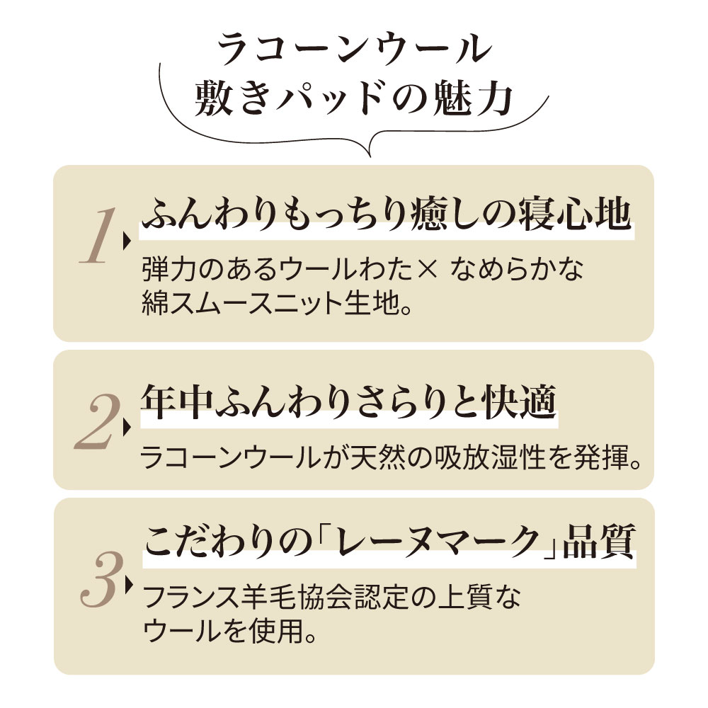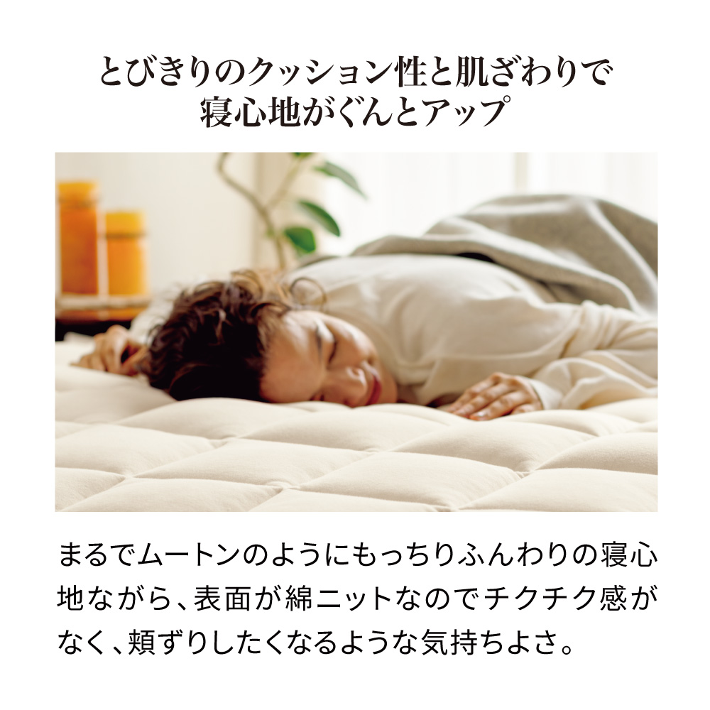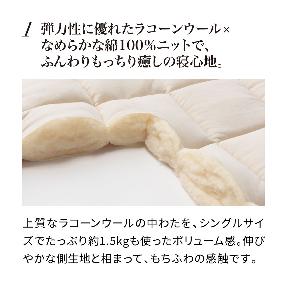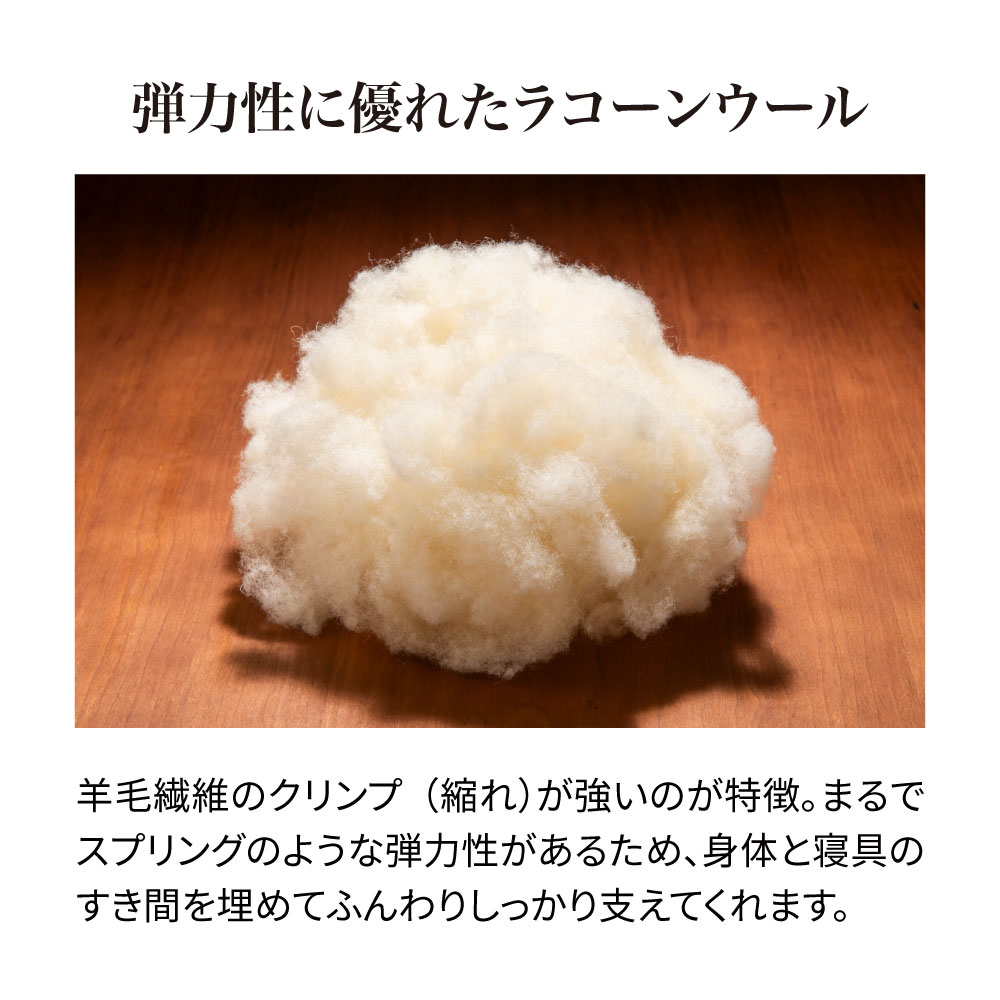 一日がんばった身体をもっちり癒しの感触でやさしく受け止め、しっかり支えながら包み込んでくれるウールの敷きパッドです。中わたに使った貴重なラコーンウールは、もっちりとした弾力性があり、さらに天然の吸放湿性で一年中サラリと快適。側生地は綿100%ニットのなめらかな肌ざわり。お手持ちの寝具にプラスするだけで、寝心地をぐんとアップデートできます。頼りがいのある癒し系に寝具バイヤーも“ひと寝惚れ”全身を支える、もっちもちの弾力感。心身ほぐれる、ふんわりサラリの寝心地。寝具バイヤーも“ひと寝惚れ”したやさしくてリッチな敷きパッドです。弾力のあるラコーンウール×綿100%ニットが生むもちふわ感上質なラコーンウールの中わたを、シングルサイズでたっぷり約1.5kgも使用。表面は肌着やベビー服にも使われる、なめらかな綿100%スムースニット。やわらかく伸びやかな側生地がウールの弾力とボリュームを引き立て、もっちりふんわりとした感触を生み出します。とびきりのクッション性と肌ざわりで寝心地がぐんとアップラコーンウールは羊毛繊維1本1本のクリンプ(縮れ)が強いのが特徴。スプリングのような弾力性があるため、身体をふんわりしっかり支えてくれます。まるでムートンのようにもっちりふんわりの寝心地ながら、表面が綿ニットなのでチクチク感がなく、頬ずりしたくなるような気持ちよさ。「レーヌマーク」品質のプレミアムなラコーンウール1頭当たりの産毛量が非常に少なく貴重なラコーンウール。中でも本品は冷え込みの強いフランス南部の山岳で大切に育てられたラコーン種の羊毛を使用。フランス羊毛協会が高品質と認定する「レーヌマーク」の中でも、プレミアム品質基準に適合した上質なウールを使用した製品です。一年中ふんわりさらりと快適なウールわた湿度の変化に敏感なウールが、天然の吸放湿性を発揮。蒸し暑い夏は湿気を逃して爽やかに、乾燥する冬は湿気と暖気を取り込み暖かく、布団内を快適な睡眠環境に調整してくれます。腰部分は中わた増量で全身をバランスよく支えますパッドの中央部分はウールわたを増量し、よりサポート力を高めた仕様に。沈み込みやすい腰をしっかり支えて、身体に負担の少ない寝姿勢に導きます。四隅ゴムで着脱簡単。ベッドパッドとしてシーツ下に使うのもおすすめ!パッドの四隅には、敷布団にもマットレスにも簡単に着脱できてズレを防止するゴム付き。本品の上に直接寝ることもできますが、上からシーツをかけてマットレスや敷布団と一体化させてお使いいただくのもおすすめ。お洗濯の頻度も減らせます。日本国内の老舗羊毛布団メーカーで1枚1枚丁寧に仕立てています。京都・宇治にある羊毛布団の老舗大恵ウールが、素材の良さを十二分に引き出しながら、1枚1枚丁寧に仕立てました。■大恵ウール株式会社 西岡さん「ウールは天然素材の中でも吸放湿性に優れており、”寝床内湿度をコントロールすることで快適な眠りを届けたい”という思いから、長年ウールふとんに特化した商品づくりを行ってきました。高温多湿の季節が長く、寝床内の不快な蒸れを感じやすい日本特有の気候において、湿度のコントロールが得意なウールは、寝具にぴったりな素材なのです。眠りの質にこだわりたい方、年齢を重ねて眠りに関する悩みが増えてきた方に、是非使っていただきたい商品です。」