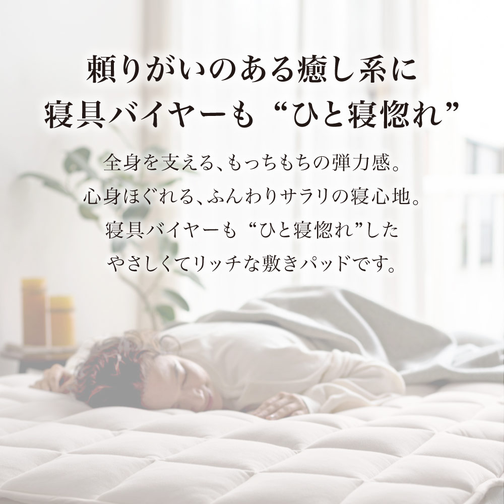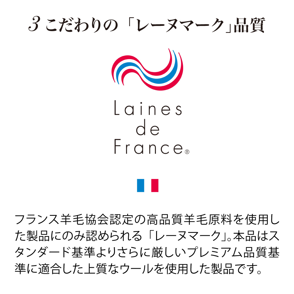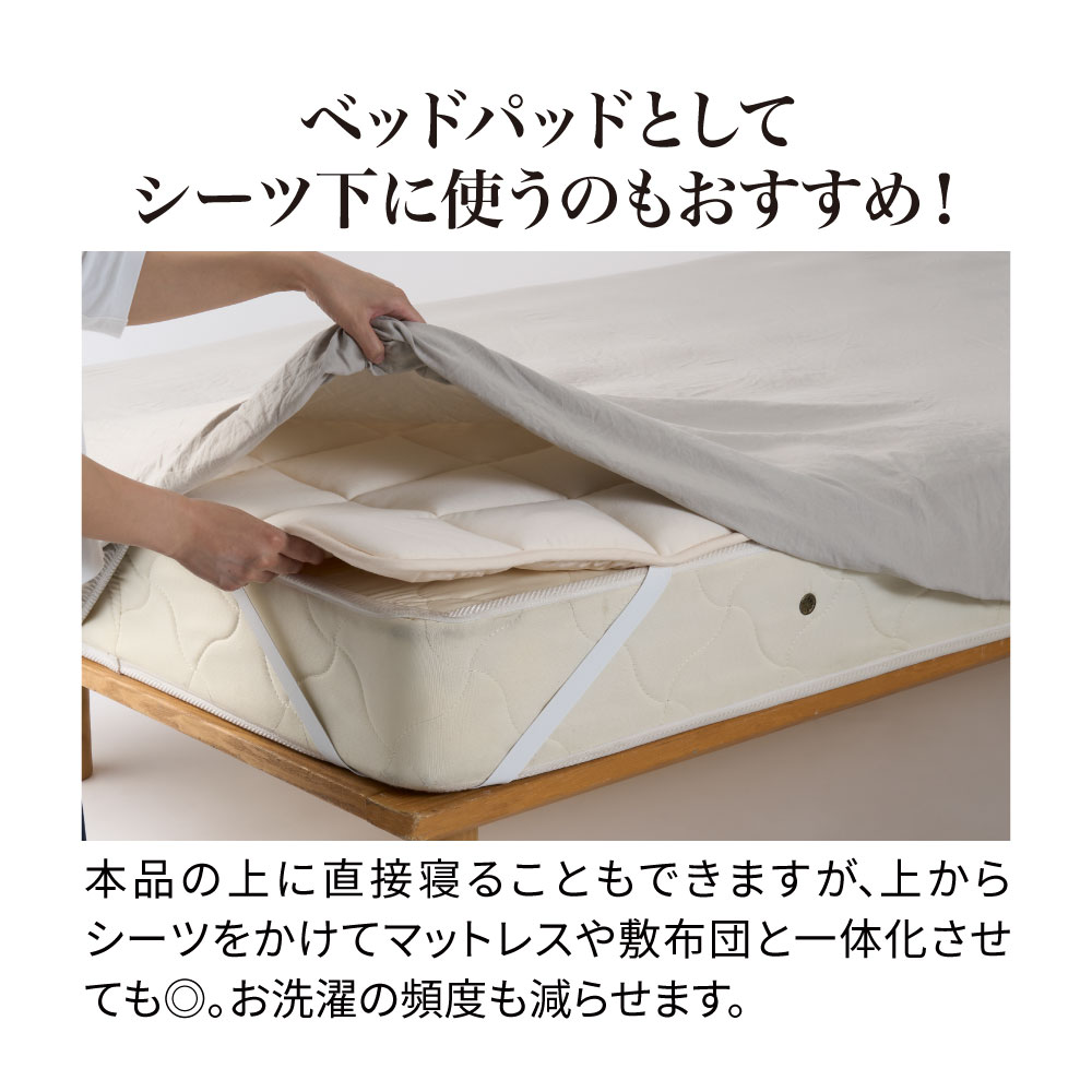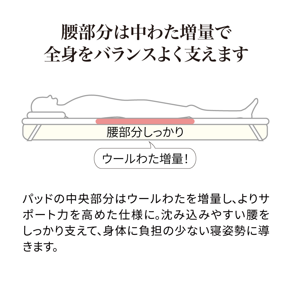 一日がんばった身体をもっちり癒しの感触でやさしく受け止め、しっかり支えながら包み込んでくれるウールの敷きパッドです。中わたに使った貴重なラコーンウールは、もっちりとした弾力性があり、さらに天然の吸放湿性で一年中サラリと快適。側生地は綿100%ニットのなめらかな肌ざわり。お手持ちの寝具にプラスするだけで、寝心地をぐんとアップデートできます。頼りがいのある癒し系に寝具バイヤーも“ひと寝惚れ”全身を支える、もっちもちの弾力感。心身ほぐれる、ふんわりサラリの寝心地。寝具バイヤーも“ひと寝惚れ”したやさしくてリッチな敷きパッドです。弾力のあるラコーンウール×綿100%ニットが生むもちふわ感上質なラコーンウールの中わたを、シングルサイズでたっぷり約1.5kgも使用。表面は肌着やベビー服にも使われる、なめらかな綿100%スムースニット。やわらかく伸びやかな側生地がウールの弾力とボリュームを引き立て、もっちりふんわりとした感触を生み出します。とびきりのクッション性と肌ざわりで寝心地がぐんとアップラコーンウールは羊毛繊維1本1本のクリンプ(縮れ)が強いのが特徴。スプリングのような弾力性があるため、身体をふんわりしっかり支えてくれます。まるでムートンのようにもっちりふんわりの寝心地ながら、表面が綿ニットなのでチクチク感がなく、頬ずりしたくなるような気持ちよさ。「レーヌマーク」品質のプレミアムなラコーンウール1頭当たりの産毛量が非常に少なく貴重なラコーンウール。中でも本品は冷え込みの強いフランス南部の山岳で大切に育てられたラコーン種の羊毛を使用。フランス羊毛協会が高品質と認定する「レーヌマーク」の中でも、プレミアム品質基準に適合した上質なウールを使用した製品です。一年中ふんわりさらりと快適なウールわた湿度の変化に敏感なウールが、天然の吸放湿性を発揮。蒸し暑い夏は湿気を逃して爽やかに、乾燥する冬は湿気と暖気を取り込み暖かく、布団内を快適な睡眠環境に調整してくれます。腰部分は中わた増量で全身をバランスよく支えますパッドの中央部分はウールわたを増量し、よりサポート力を高めた仕様に。沈み込みやすい腰をしっかり支えて、身体に負担の少ない寝姿勢に導きます。四隅ゴムで着脱簡単。ベッドパッドとしてシーツ下に使うのもおすすめ!パッドの四隅には、敷布団にもマットレスにも簡単に着脱できてズレを防止するゴム付き。本品の上に直接寝ることもできますが、上からシーツをかけてマットレスや敷布団と一体化させてお使いいただくのもおすすめ。お洗濯の頻度も減らせます。日本国内の老舗羊毛布団メーカーで1枚1枚丁寧に仕立てています。京都・宇治にある羊毛布団の老舗大恵ウールが、素材の良さを十二分に引き出しながら、1枚1枚丁寧に仕立てました。■大恵ウール株式会社 西岡さん「ウールは天然素材の中でも吸放湿性に優れており、”寝床内湿度をコントロールすることで快適な眠りを届けたい”という思いから、長年ウールふとんに特化した商品づくりを行ってきました。高温多湿の季節が長く、寝床内の不快な蒸れを感じやすい日本特有の気候において、湿度のコントロールが得意なウールは、寝具にぴったりな素材なのです。眠りの質にこだわりたい方、年齢を重ねて眠りに関する悩みが増えてきた方に、是非使っていただきたい商品です。」