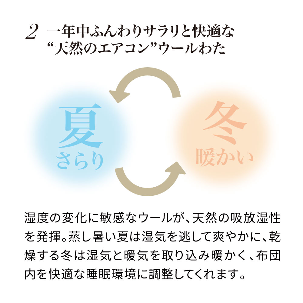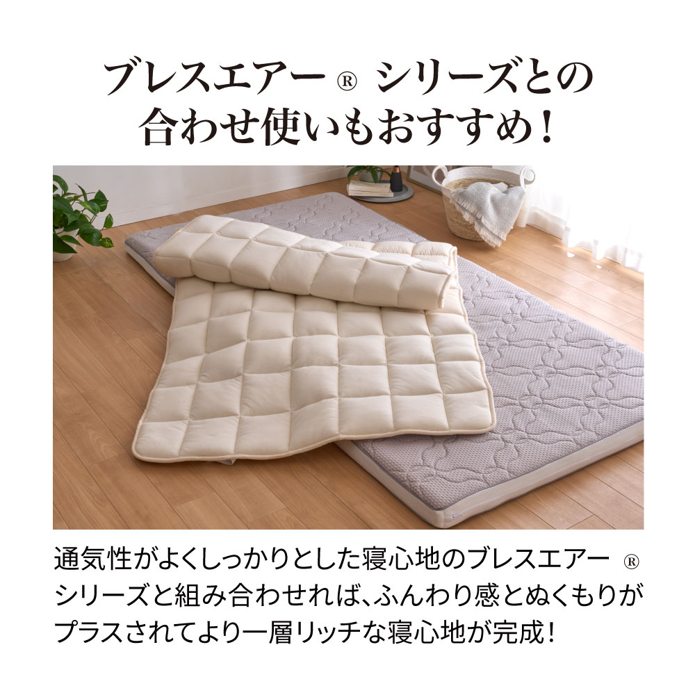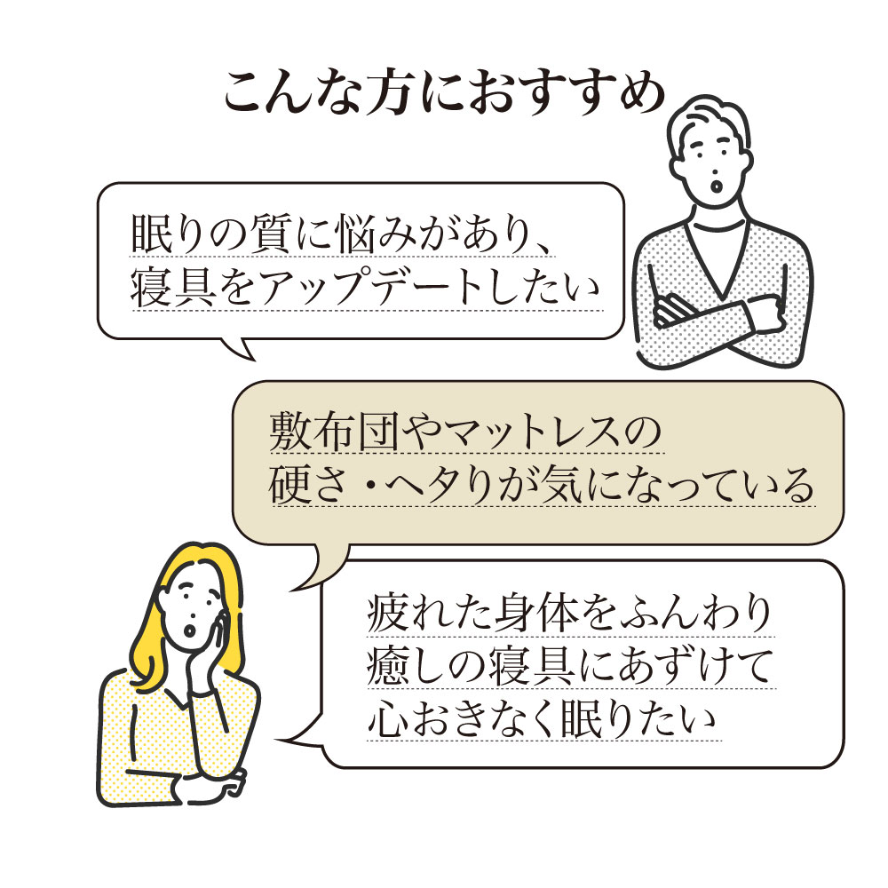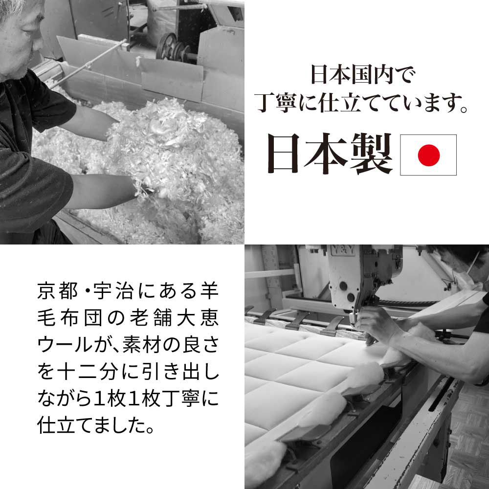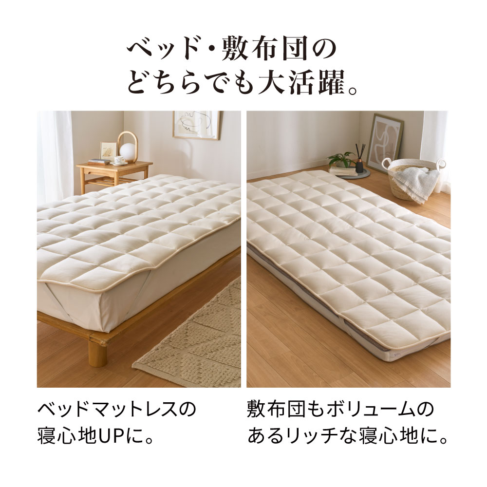 一日がんばった身体をもっちり癒しの感触でやさしく受け止め、しっかり支えながら包み込んでくれるウールの敷きパッドです。中わたに使った貴重なラコーンウールは、もっちりとした弾力性があり、さらに天然の吸放湿性で一年中サラリと快適。側生地は綿100%ニットのなめらかな肌ざわり。お手持ちの寝具にプラスするだけで、寝心地をぐんとアップデートできます。頼りがいのある癒し系に寝具バイヤーも“ひと寝惚れ”全身を支える、もっちもちの弾力感。心身ほぐれる、ふんわりサラリの寝心地。寝具バイヤーも“ひと寝惚れ”したやさしくてリッチな敷きパッドです。弾力のあるラコーンウール×綿100%ニットが生むもちふわ感上質なラコーンウールの中わたを、シングルサイズでたっぷり約1.5kgも使用。表面は肌着やベビー服にも使われる、なめらかな綿100%スムースニット。やわらかく伸びやかな側生地がウールの弾力とボリュームを引き立て、もっちりふんわりとした感触を生み出します。とびきりのクッション性と肌ざわりで寝心地がぐんとアップラコーンウールは羊毛繊維1本1本のクリンプ(縮れ)が強いのが特徴。スプリングのような弾力性があるため、身体をふんわりしっかり支えてくれます。まるでムートンのようにもっちりふんわりの寝心地ながら、表面が綿ニットなのでチクチク感がなく、頬ずりしたくなるような気持ちよさ。「レーヌマーク」品質のプレミアムなラコーンウール1頭当たりの産毛量が非常に少なく貴重なラコーンウール。中でも本品は冷え込みの強いフランス南部の山岳で大切に育てられたラコーン種の羊毛を使用。フランス羊毛協会が高品質と認定する「レーヌマーク」の中でも、プレミアム品質基準に適合した上質なウールを使用した製品です。一年中ふんわりさらりと快適なウールわた湿度の変化に敏感なウールが、天然の吸放湿性を発揮。蒸し暑い夏は湿気を逃して爽やかに、乾燥する冬は湿気と暖気を取り込み暖かく、布団内を快適な睡眠環境に調整してくれます。腰部分は中わた増量で全身をバランスよく支えますパッドの中央部分はウールわたを増量し、よりサポート力を高めた仕様に。沈み込みやすい腰をしっかり支えて、身体に負担の少ない寝姿勢に導きます。四隅ゴムで着脱簡単。ベッドパッドとしてシーツ下に使うのもおすすめ!パッドの四隅には、敷布団にもマットレスにも簡単に着脱できてズレを防止するゴム付き。本品の上に直接寝ることもできますが、上からシーツをかけてマットレスや敷布団と一体化させてお使いいただくのもおすすめ。お洗濯の頻度も減らせます。日本国内の老舗羊毛布団メーカーで1枚1枚丁寧に仕立てています。京都・宇治にある羊毛布団の老舗大恵ウールが、素材の良さを十二分に引き出しながら、1枚1枚丁寧に仕立てました。■大恵ウール株式会社 西岡さん「ウールは天然素材の中でも吸放湿性に優れており、”寝床内湿度をコントロールすることで快適な眠りを届けたい”という思いから、長年ウールふとんに特化した商品づくりを行ってきました。高温多湿の季節が長く、寝床内の不快な蒸れを感じやすい日本特有の気候において、湿度のコントロールが得意なウールは、寝具にぴったりな素材なのです。眠りの質にこだわりたい方、年齢を重ねて眠りに関する悩みが増えてきた方に、是非使っていただきたい商品です。」