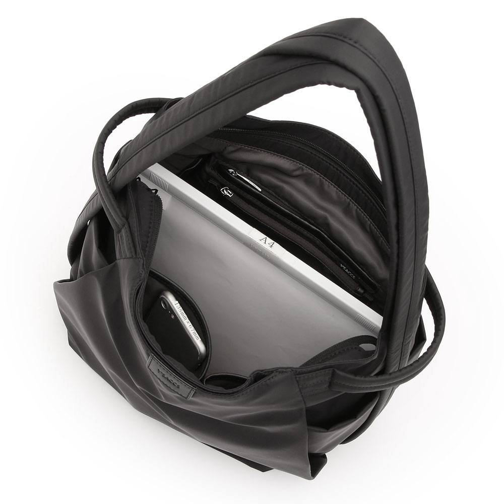 オープンポケットが3個、ファスナーポケットが2個つき、収納力たっぷり。A4サイズの大きさに対応。