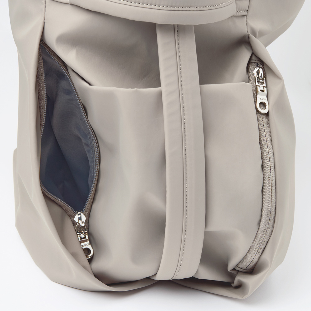 両サイドにファスナーポケットつき。背面ファスナーを開ければ、中身を取り出せる便利な仕様。