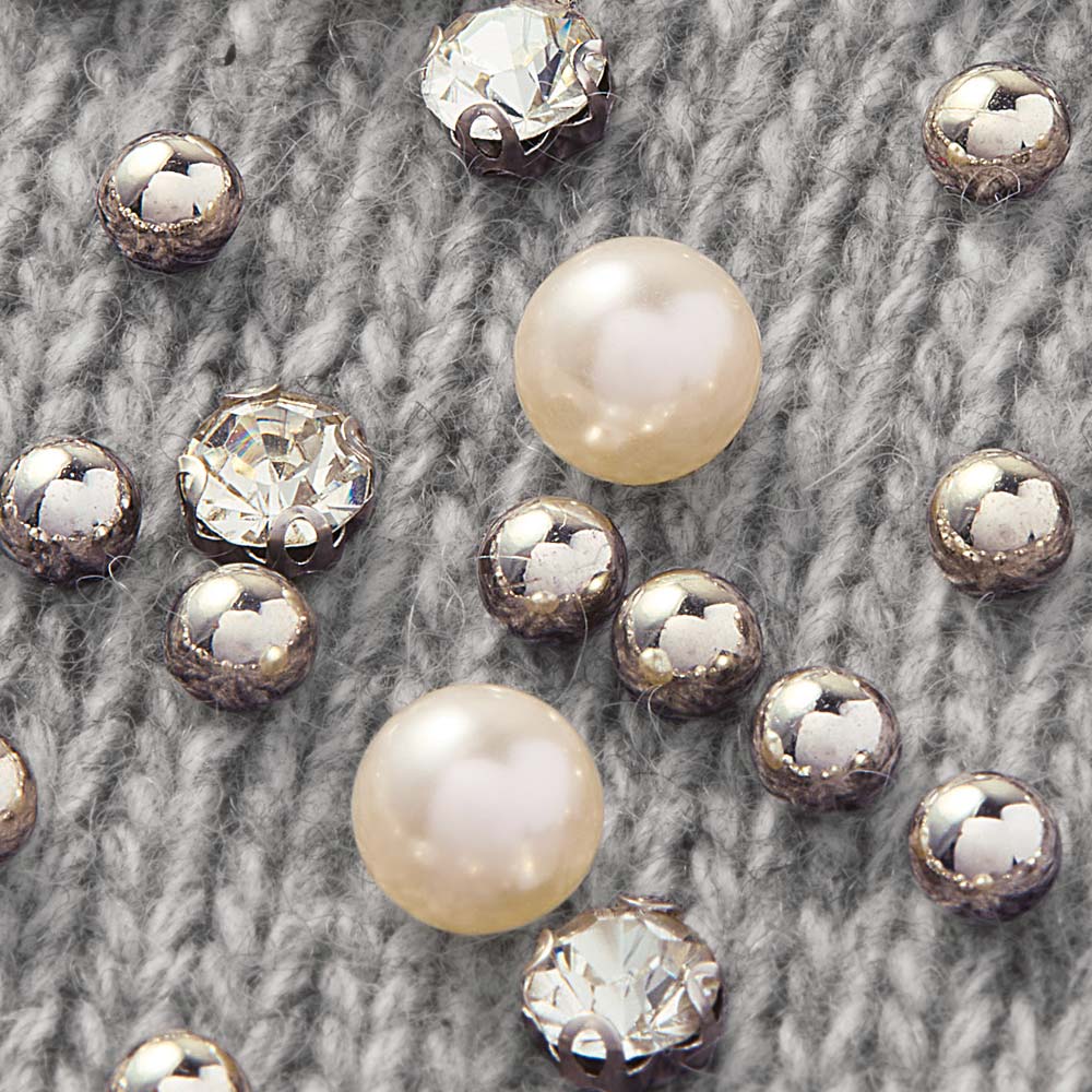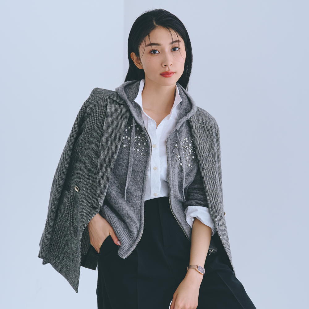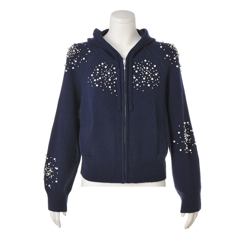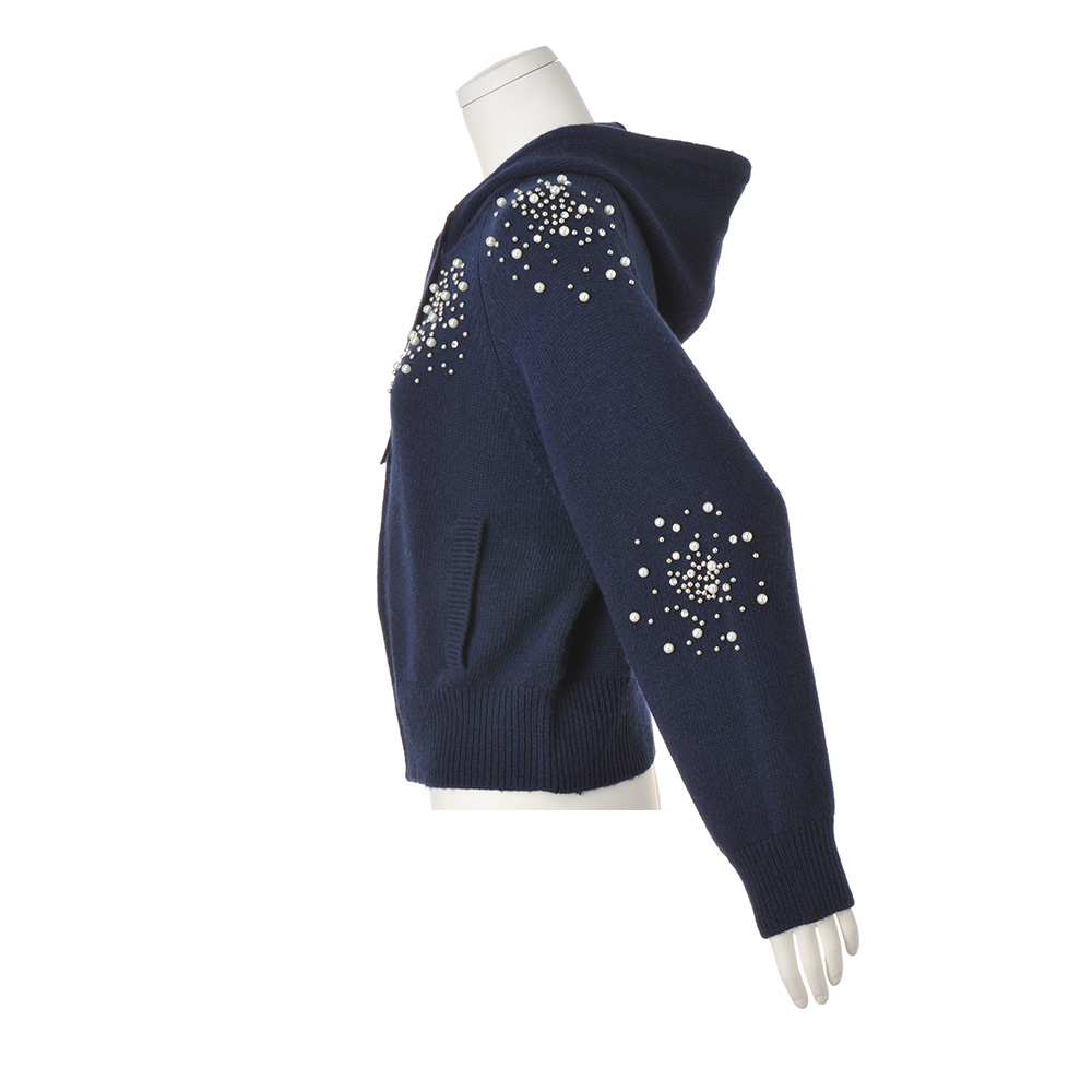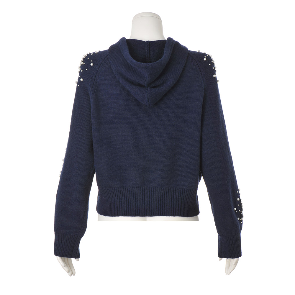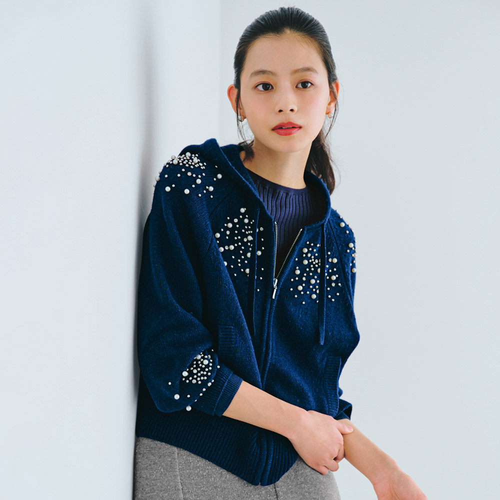 パールビジューパーカカジュアルなフーディにビジューの煌めきをトッピング。甘さと上品さを両立した、大人のための華やぎアイテムです。ウール混の糸を使用した、ぬくもりのあるニットフーディ。肩から胸元、袖にあしらったビジューがポイントで、袖は左右アシンメトリーに配置することで、こなれ感を演出。気負わず着られるラフなラグラン袖も魅力。エレガントになりすぎず、日常にも取り入れやすい一着です。