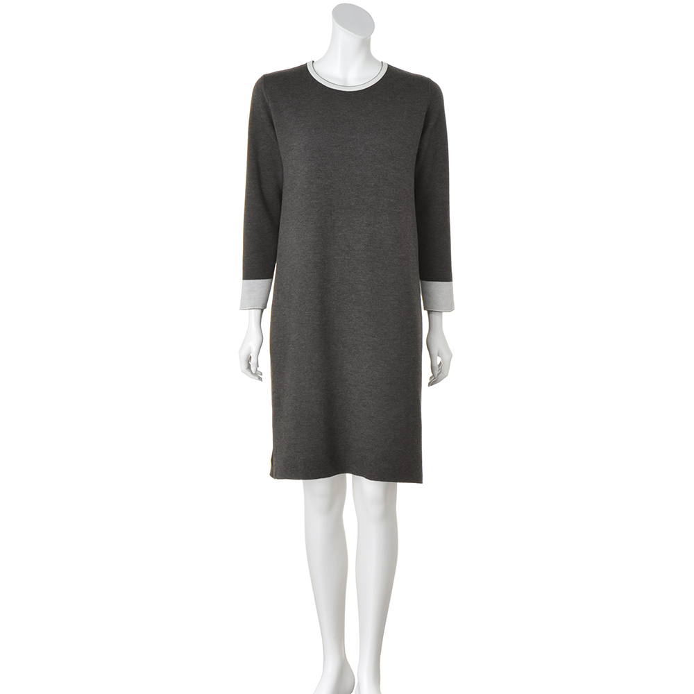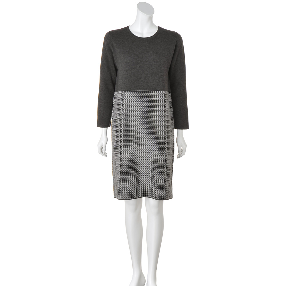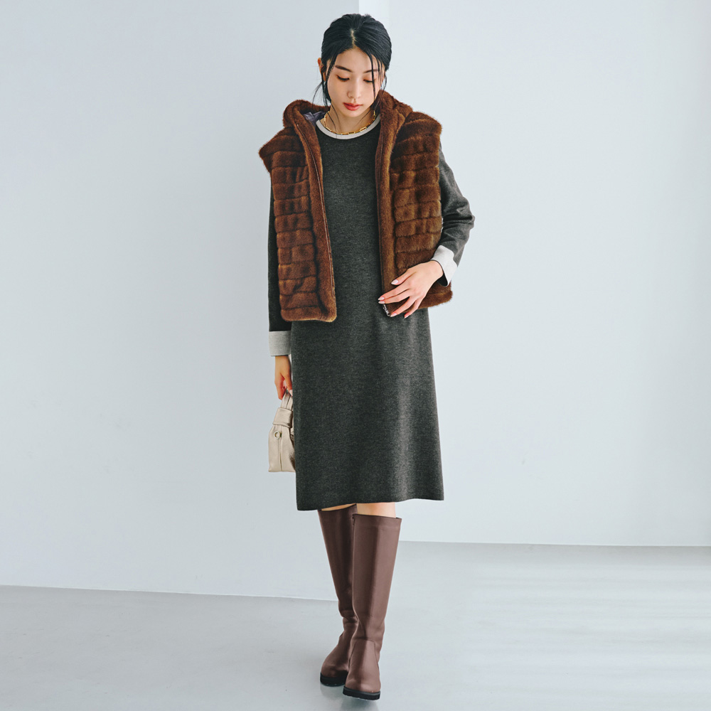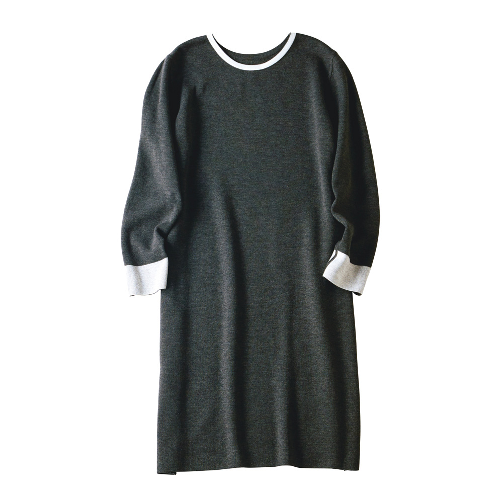 ニットワンピースの裏面は、シックに決まるグレー無地。襟ぐりと袖口の白配色で装いに程よい華やぎを。 コーディネート例
