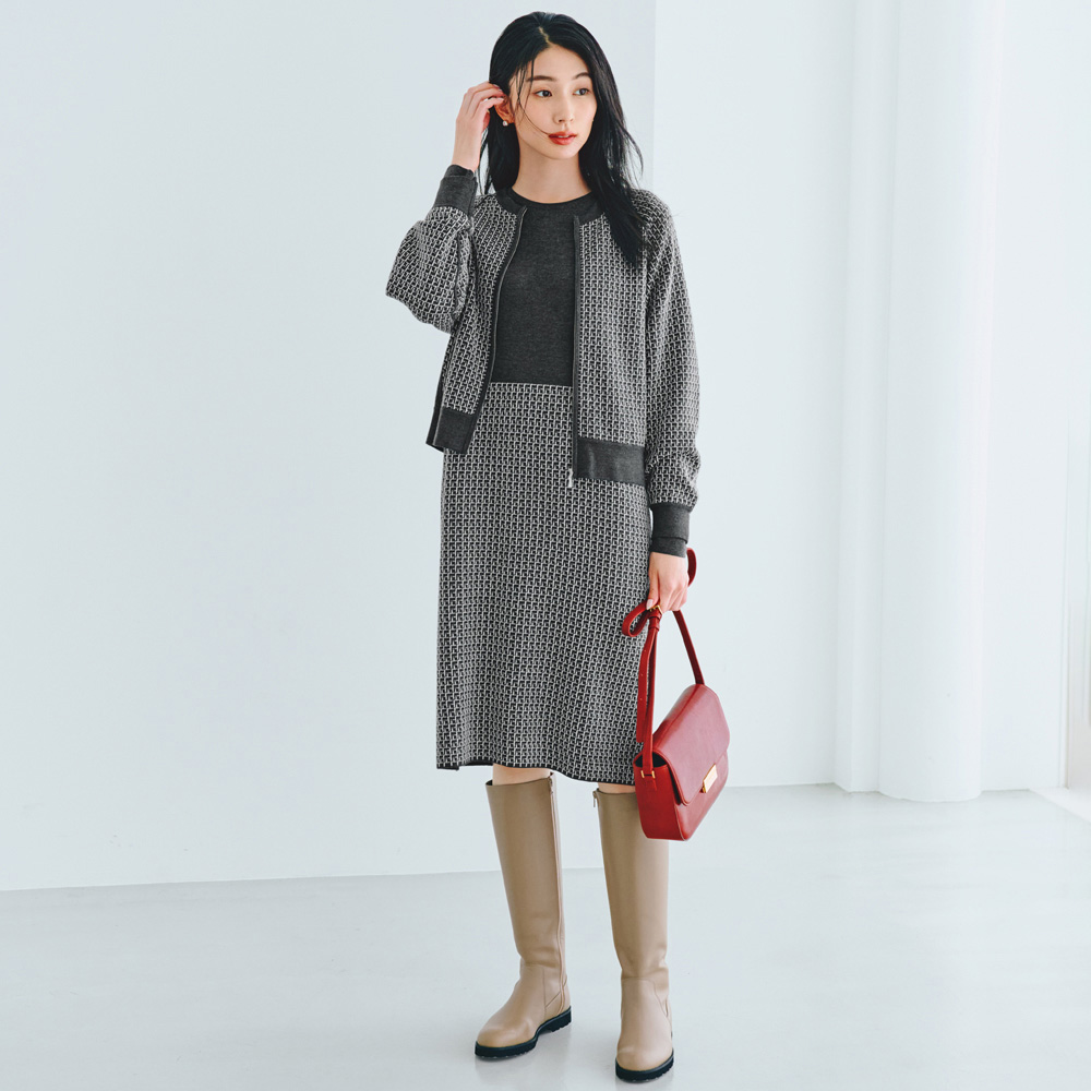 ダブルジャカードセットアップ幾何学柄のジャカード編みニットが華やかな表情を与える、ワンピースとブルゾン(商品番号:119601)が登場。程よい存在感で、シンプルな着こなしをぐっと印象深く。ウール混の糸を使ったジャカード編みで、立体的な幾何学柄を表現。裏面に無地をあしらい、リバーシブルで楽しめるワンピースをご用意しました。洗練されたシャープな配色で、装いを品よく引き立てます。