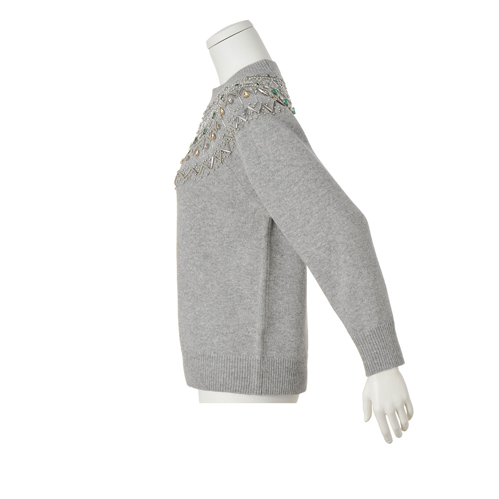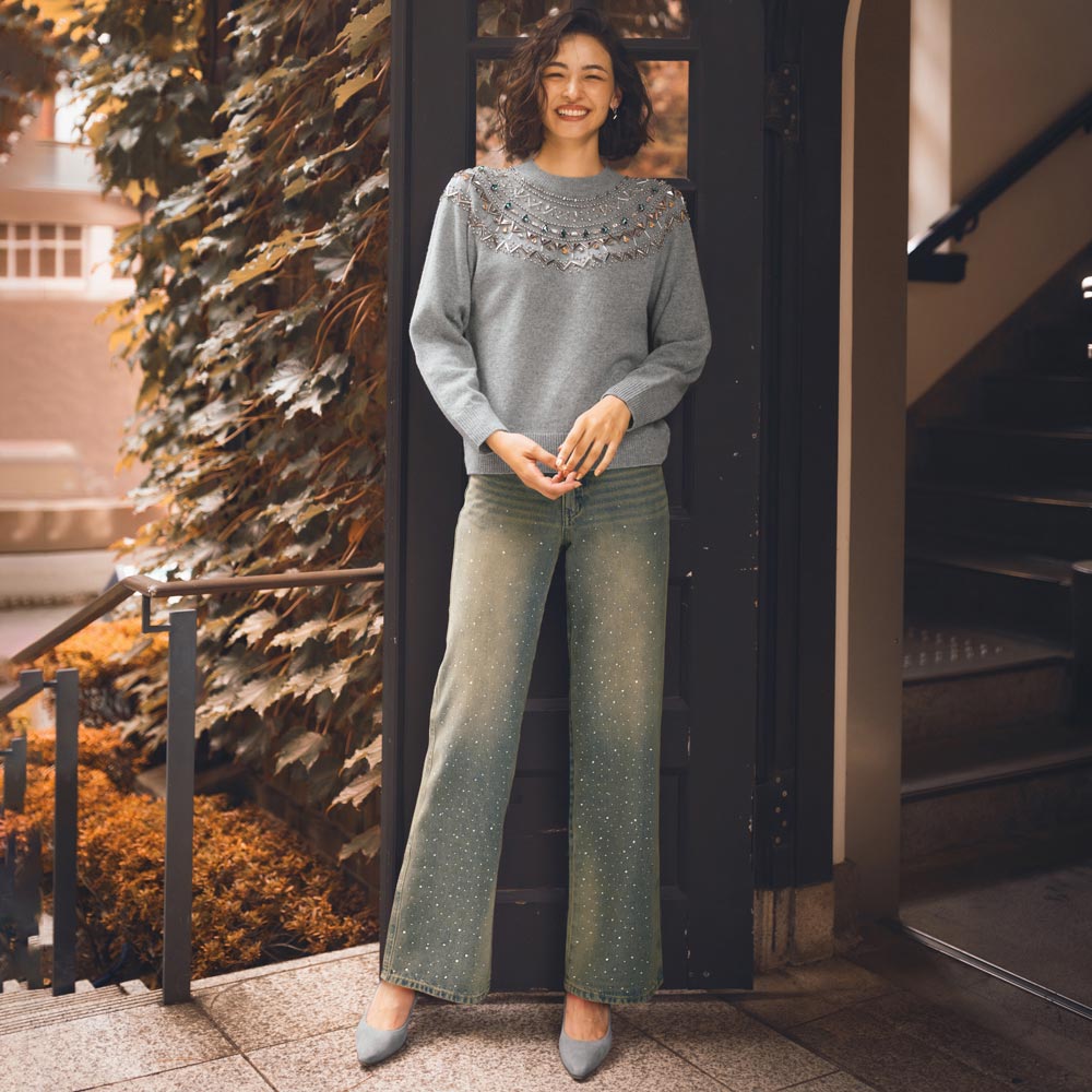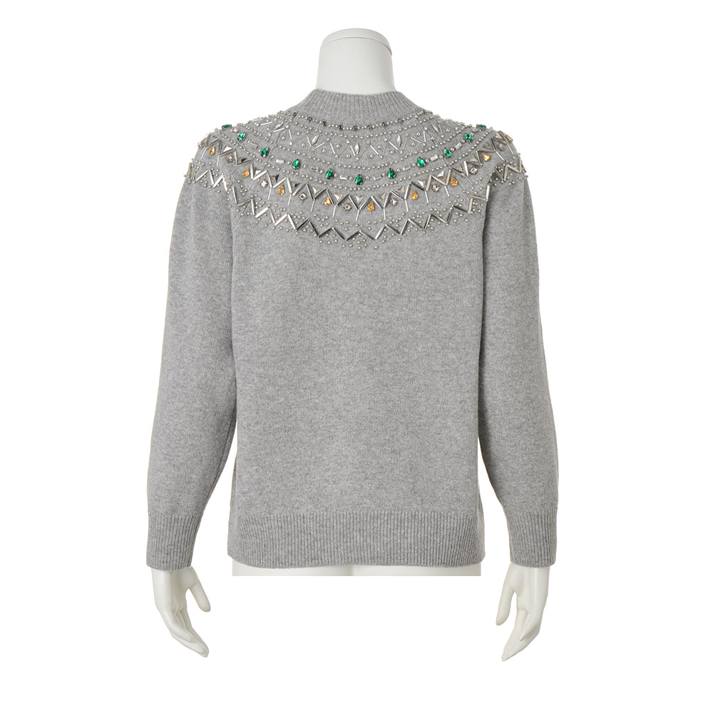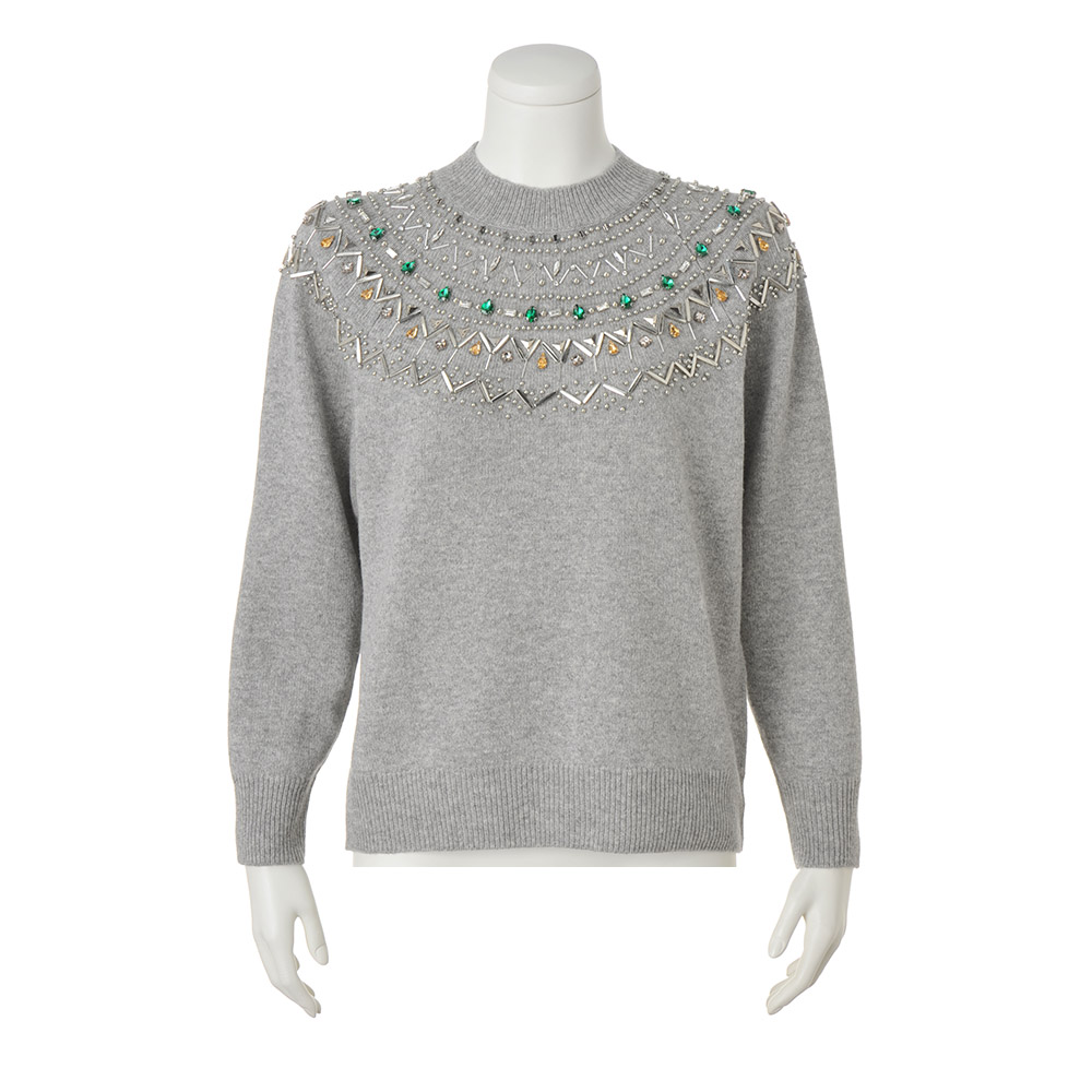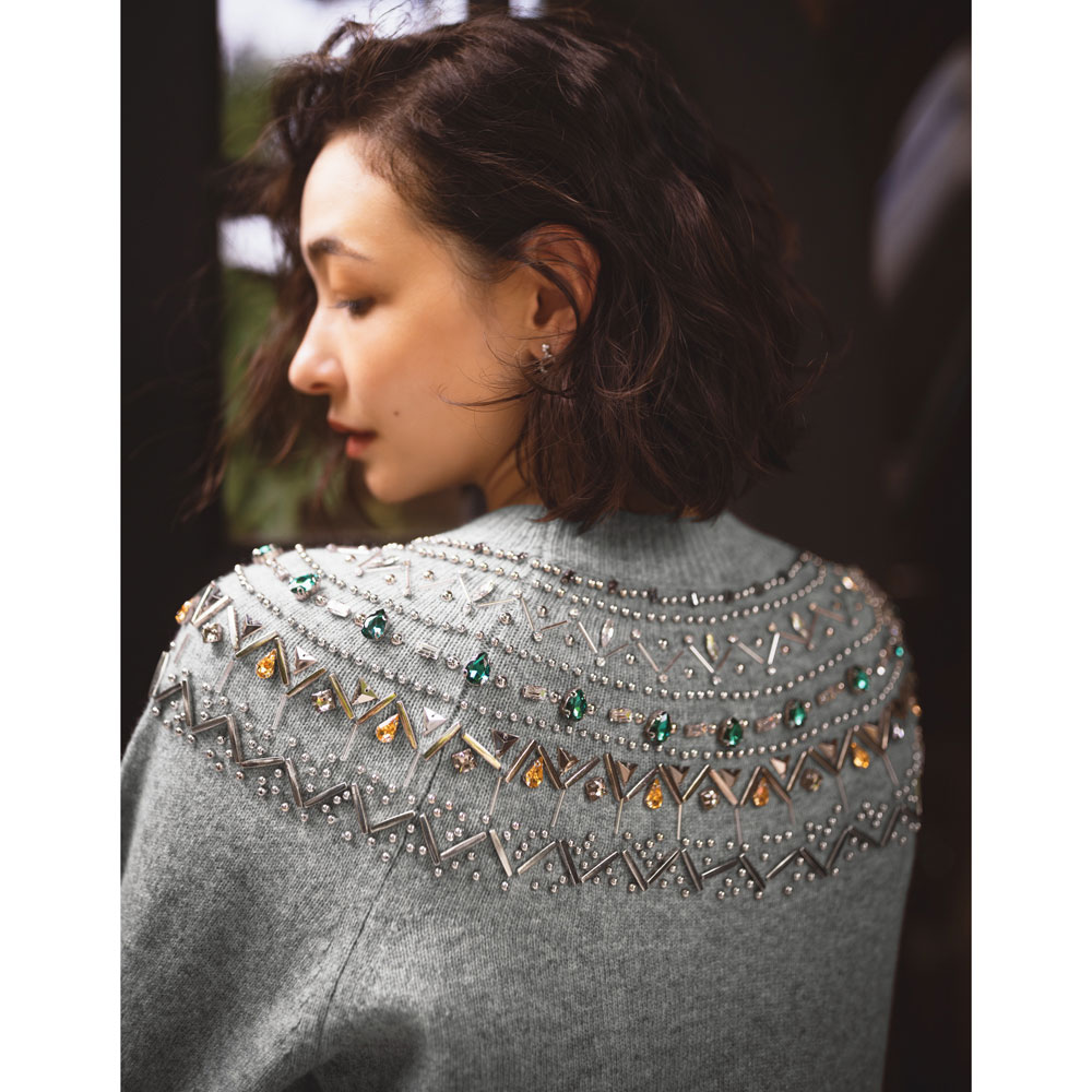 Winter Holiday楽しみなイベントが満載な季節が到来!ワクワクするシーンを迎えるべく、どこか特別感のある着こなしでファッションをアップデートしませんか?100%ウールをミドルゲージで風合いよく編み上げ、ノルディック柄をカラフルなビジュー使いで都会的な印象に。クラシカルな雰囲気と洗練された現代的なデザインが融合したニットです。首元を彩るビジューがデコルテを華やかに演出し、アクセサリーいらずで着映えする一着に。