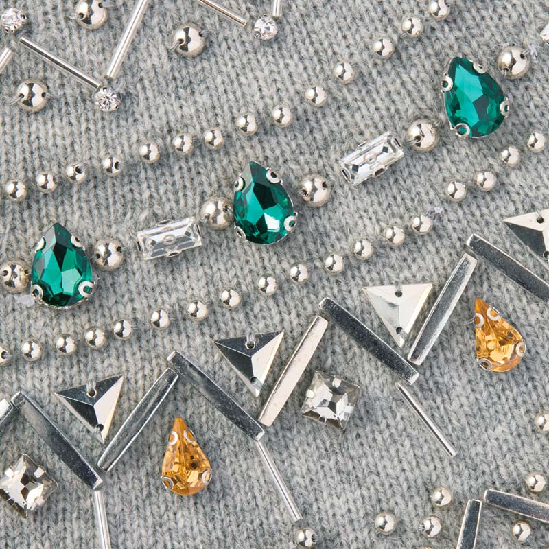 ひとつひとつ手刺しゅうでほどこしたビジューが華やかでモダンな表情に。
