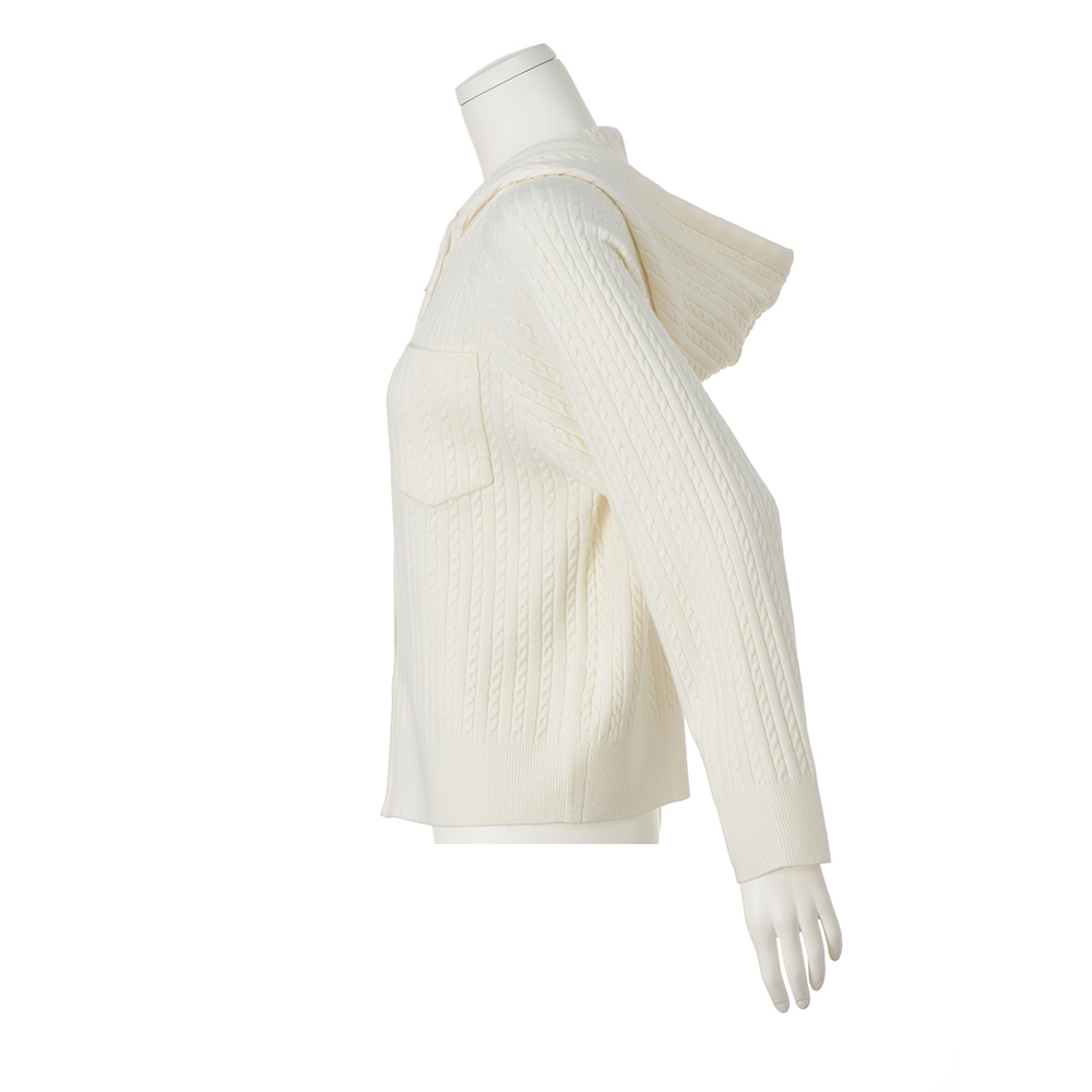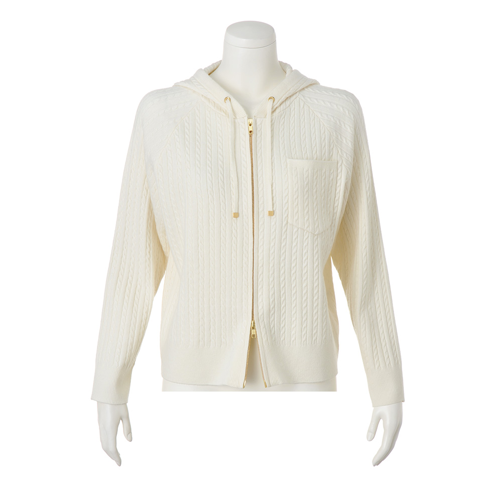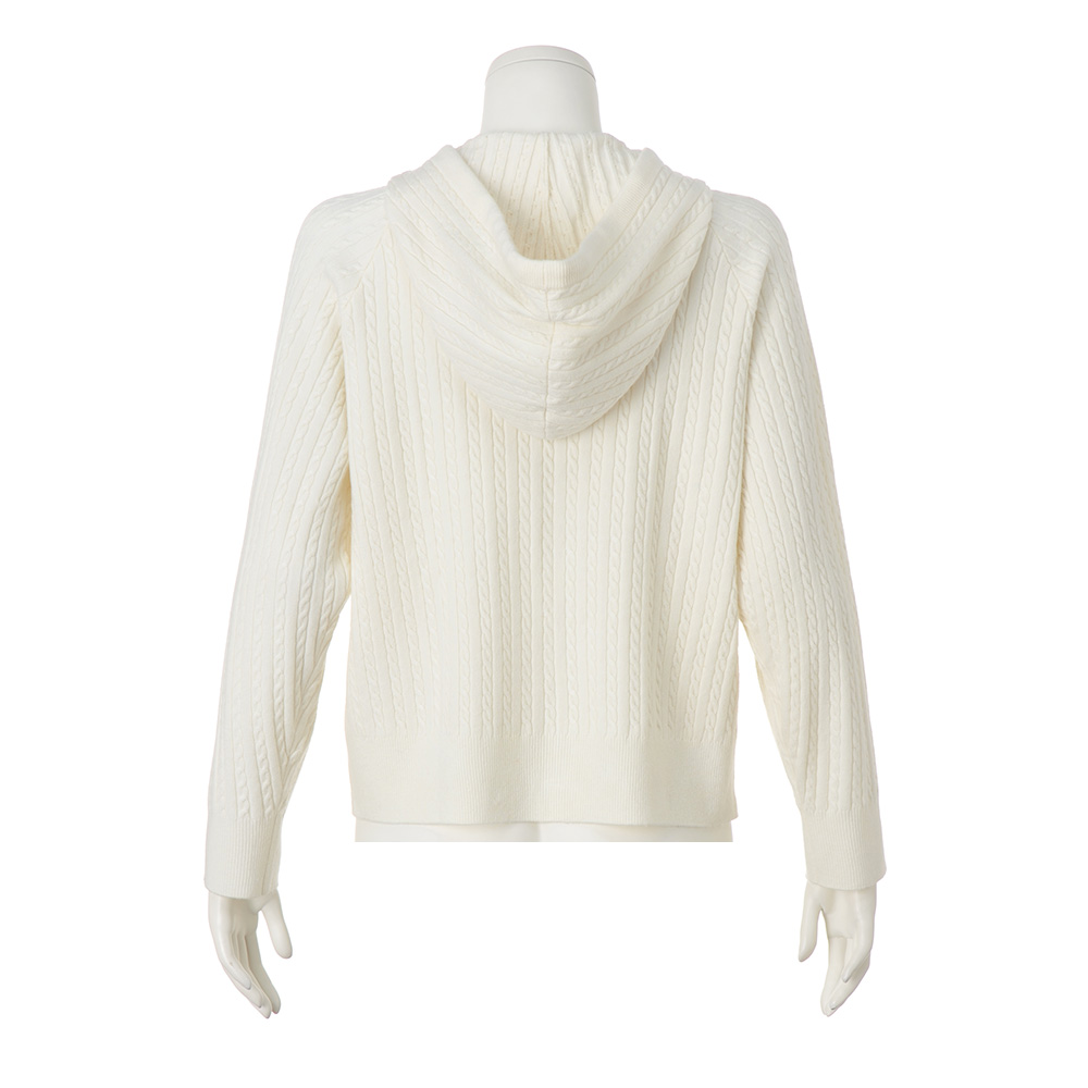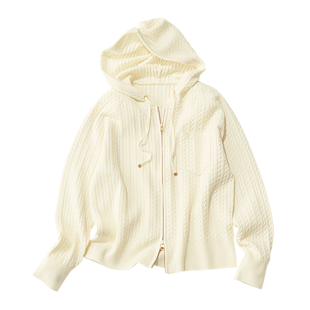 女性らしさがまとえるオフホワイト。繊細なケーブル編みが縦ラインを強調し、カジュアルアイテムなのにきちんと見える仕上がり。厚すぎない素材感に、からだのラインを拾いすぎない絶妙なシルエットで細見え効果も。