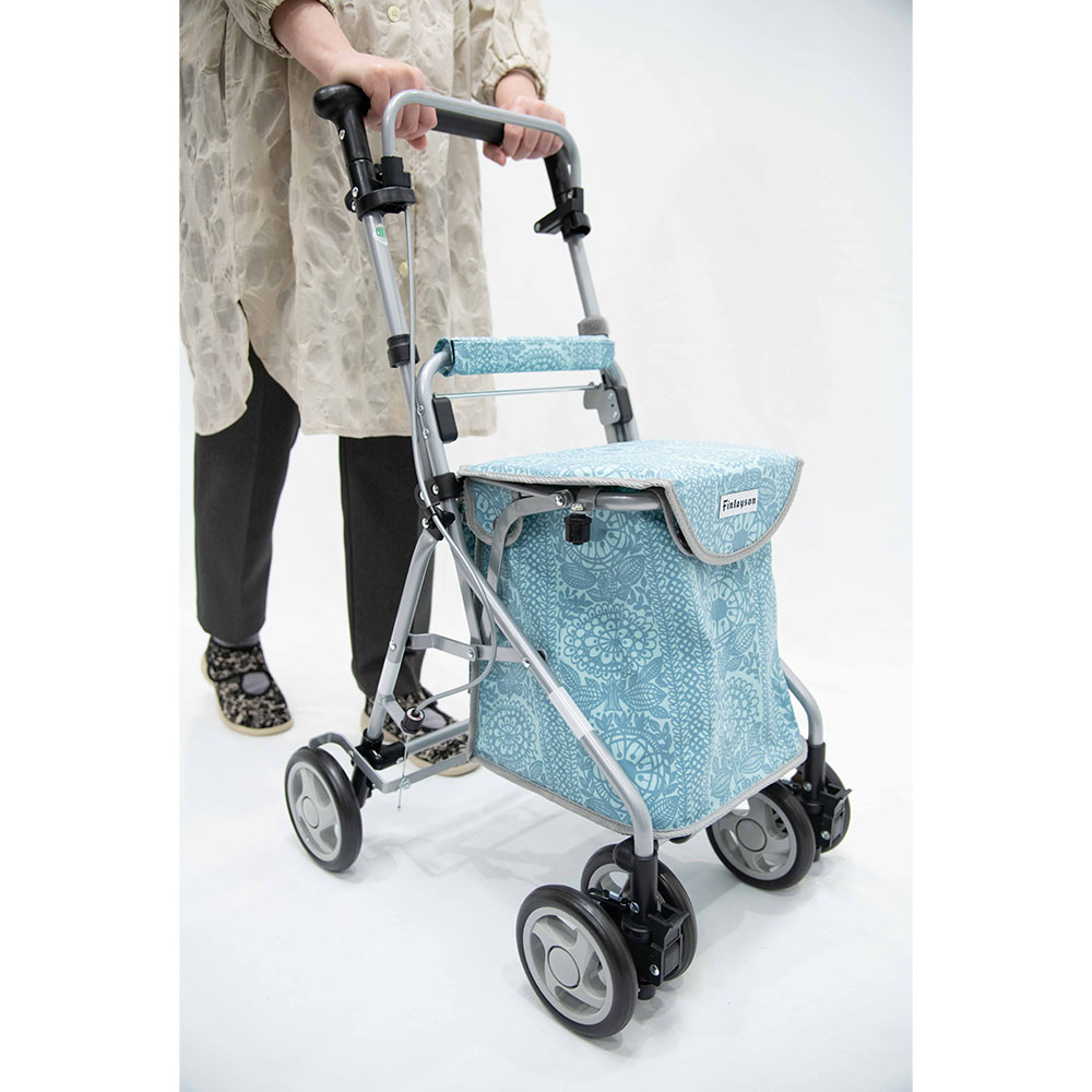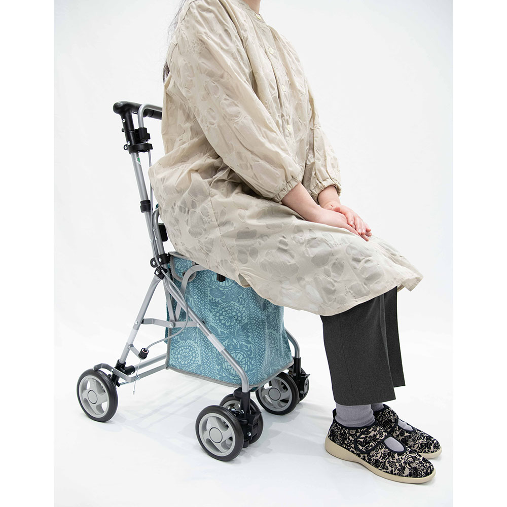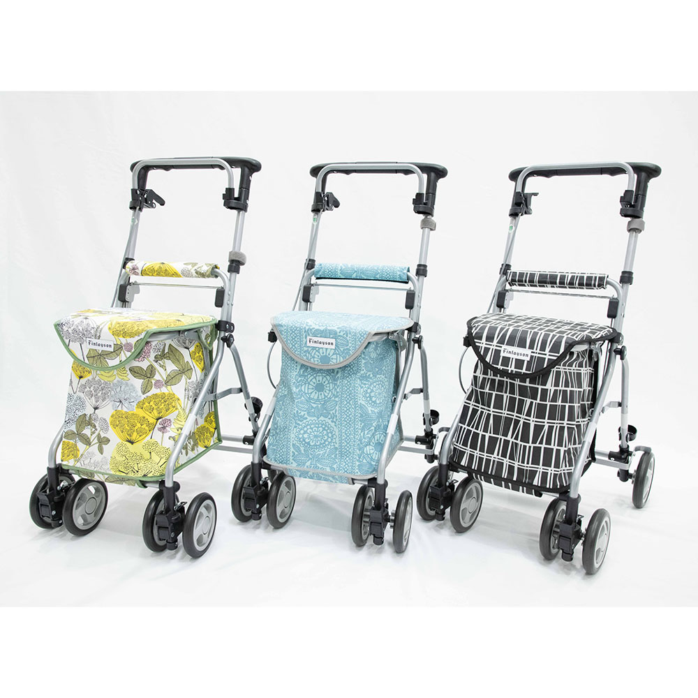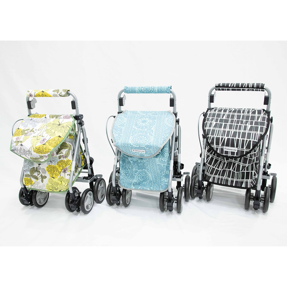 北欧フィンランドのテキスタイルメーカー「フィンレイソン」の柄を使用したカート。コンパクトに折りたたみができ、荷物を入れるバッグも使いやすい大きさです。北欧デザイン〈フィンレイソン〉の歴史ある柄がとってもおしゃれ!買ったものを運んだり、疲れたら椅子になったりする便利なウォーキングカーです。いつものお出かけを快適にサポートします。抜群の収納力!座面カバーを開くと大きな収納。10kgまで荷物を入れられるので、お出かけや買い物にとっても便利。買い物カゴ受け付きで、スーパーではショッピングカートに早変わり!さらに後ろ側にも大きめポケット付き。よく使うものもサッと取り出せます。杖・傘立て、レインカバーも付いているので、雨の日対策もバッチリ。軽量・コンパクト本体はアルミ製パイプを使用しているので4.4kgと軽量のため、移動がスイスイ!ハンドル(持ち手)部からワンタッチで折りたためてコンパクトになるので持ち運びや収納にも便利。「SGマーク」取得製品なので、軽量でも強度はしっかり。思いやりのある設計持ち手の高さは3段階に設定可能。身長に合わせて調整できます。前輪は直進固定と、方向転換もスムーズな左右60度の2段階切替。手元には坂道や急な時にスピードを制御できるブレーキの他、駐車時に後輪をロックできるストッパー付き。夜道でも車や自転車から視認しやすいよう、見えやすい位置に反射テープが付いています。おしゃれな北欧デザイン北欧フィンランドの歴史あるテキスタイルメーカー「フィンレイソン」の柄を使用。幾何学柄でスタイリッシュなデザインのブラック系(コロナ柄)と、愛らしく昔懐かしさを呼び起こすブルー系(タイミ柄)と、植物柄のホワイト系(ニッティポルク)からお選びいただけます。【コロナ柄】1950年代の典型的なパターン。幾何学的でシンプルなクラッシックデザインで、「毎日の生活に美を」という当時のキャッチフレーズを象徴した、スタイリッシュなパターンです。【タイミ柄】タイミとは「小さな植物」という意味。フィンレイソンのクラシックデザインのひとつであるこのパターンは、愛らしく、昔の懐かしい記憶を呼び起こす。1961年アイニ・ヴァーリによるデザイン。【ニッティポルク柄】ニッティポルクとは「草原の小道」という意味。木々はフィンランドの夏のミッドサマーのお祭りを活気づけます。ノラニンジン、クローバー、シダそして忘れな草が咲き乱れ、伝統的なミッドサマーの魔力がそこに宿ります。家の中は夏のすがすがしさであふれ、ベッドに置かれた花々が夢を繰り広げます。アヌ・カネルヴォによるデザイン。−フィンレイソン−フィンレイソン(Finlayson)は、1830年に創業された、北欧フィンランド最古のテキスタイルメーカーです。1820年、タンペレ(フィンランド)に設立した紡績工場の敷地内には、学校や図書館、教会などの各施設が作られ、フィンランド最大の工業都市として発展を遂げました。1951年にはフィンランドで最も早く自社内にデザインアトリエを設立。1950年代(CORONNA)、1960年代(TAIMI、ELEFANTTI)に生まれた何十年もの間親しまれている人気のクラシック柄と、そのシーズンのトレンドカラーやモチーフをとらえた魅力的な新柄による豊富なバリエーションは、国内外で広く親しまれています。−お買い上げいただく前に−本商品(シルバーカー)は、主として自立歩行ができる高齢者の方がより安定して歩行できるように補助的に使用していただくものです。手すり等固定されたものにつかまらなければ歩行できない方や介助が必要な方の使用には適しません。最大使用者体重は80kgまでです。体重が80kg以下の方に限ります。