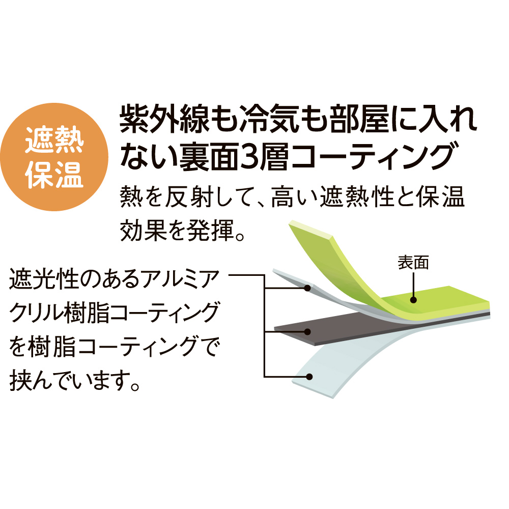 まぶしすぎる朝日や西日のお部屋には1級遮光カーテンがおすすめ!遮熱・保温効果もあり冬は暖かく、夏は涼しく冷暖房効果を高めます。一年を快適にコントロール!エコ上手な遮熱カーテンで始める省エネ。遮熱効果があるので、冷暖房効率のアップも期待できます。省エネ生活の快適度を簡単にアップさせたい方におすすめなのが、このカーテン。裏面に施したコーティングにより、室外からの光をさえぎるのはもちろん室内からの光も漏れにくくなるので防犯に役立ちます。さらに遮熱、保温、防音、効果で一年中快適。シンプルで風合いのある生地と、コーディネートしやすい色合いで、どんなお部屋にもすっきりマッチ。既製品はぴったりが見つかりやすい、17サイズ展開(100cm幅14サイズ、200cm幅3サイズ)です。●強い日差しを遮る「1級遮光」裏面に3層のコーティングを施した1級遮光カーテンです。まぶしい朝日や強い西日を遮ることができる、99.99%以上の遮光率。※表生地+3層コーティング・・・遮光性のあるアルミアクリルコーティングを樹脂コーティングで挟み込んでいます。表生地をプラスした4層構造でも柔らかく薄くしなやかな風合いです。●遮熱・保温効果繊維の隙間が出来ないように樹脂がコーティングされているため、室内の熱を逃がさず冬場は断熱効果を高めることができます。また、日差しが強く、夏場サウナ状態になってしまうようなお部屋の場合は、昼間お出かけの時にカーテンを閉めておけば、暑さを遮ることもできます。●防音タイプで気になる音対策も道路に面したお部屋や外の音が気になるとき、また、家の中の音を外に漏らしたくないなど、プライバシーを守るためにもこちらのカーテンがおすすめ。より効果を高めるには、防音効果のあるレースカーテンなどの併用もおすすめです。