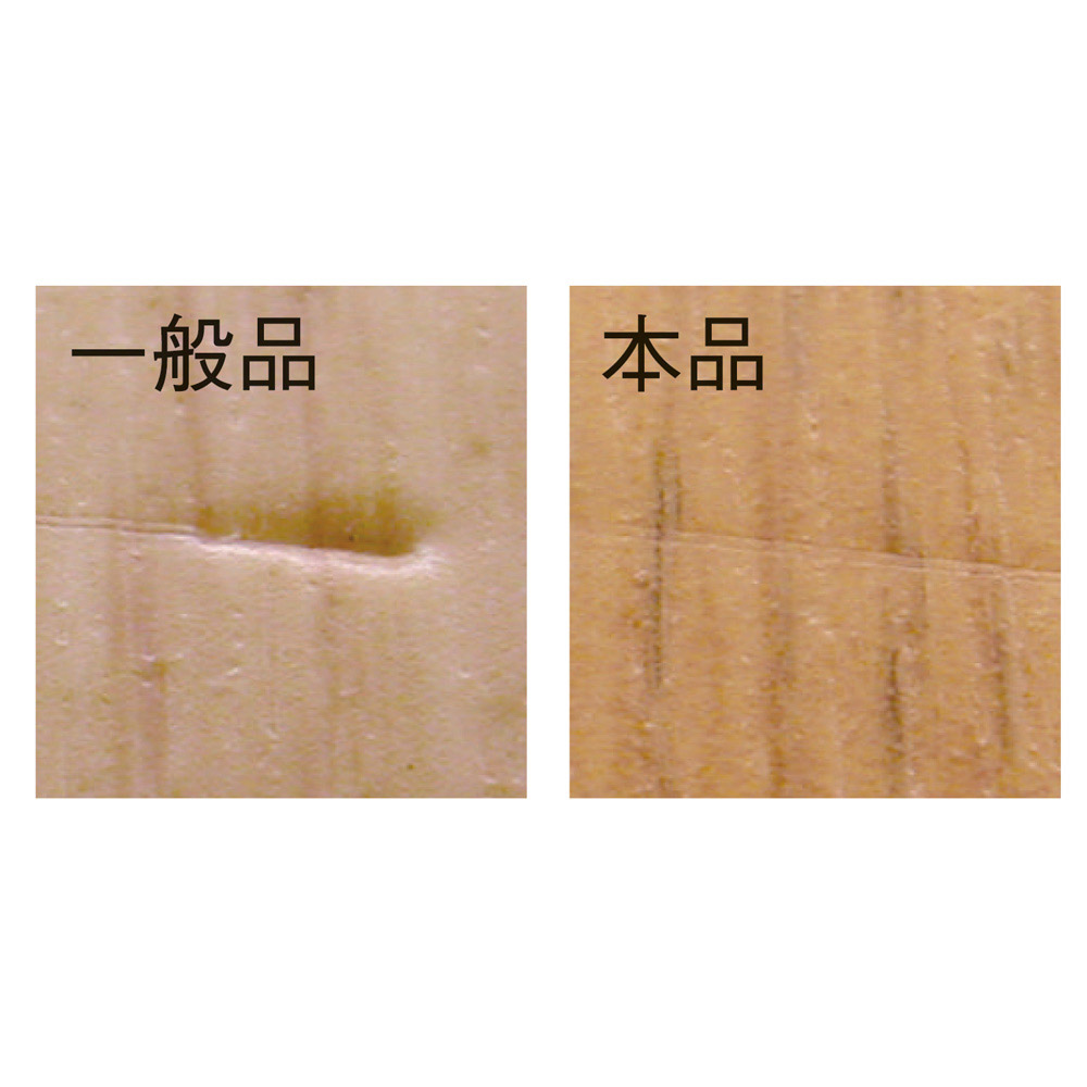 一般住宅用と比較して、本品は表層が厚いため、傷がつきにくいことが分かります。 [試験方法・条件]120gの重りをつけた角の尖った鋭利な鉄板を、角度60度に取り付けた試験片の上に落下させる。高さを変えて傷の付き具合を比較する。
