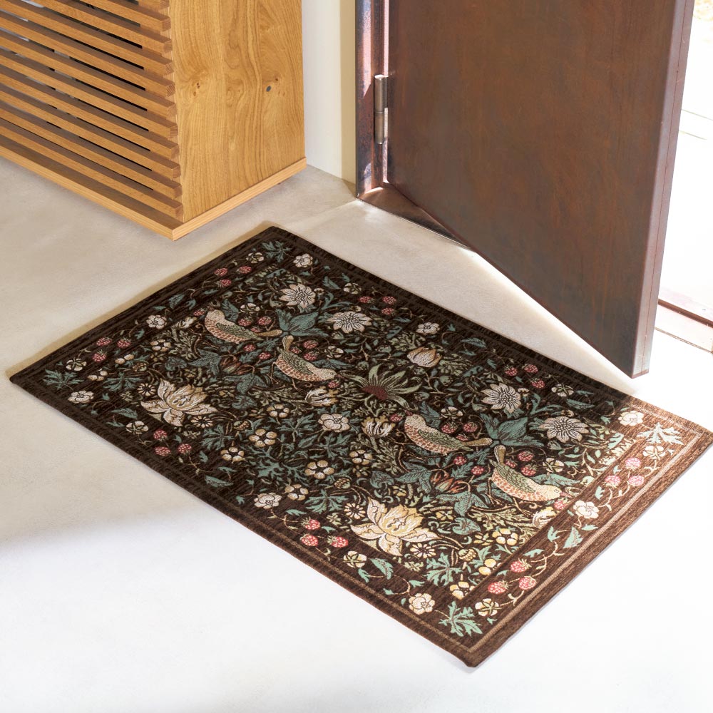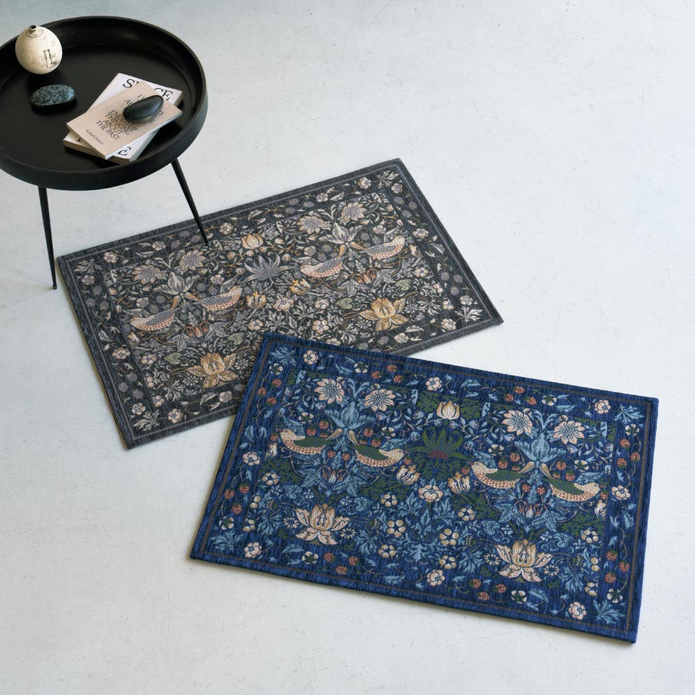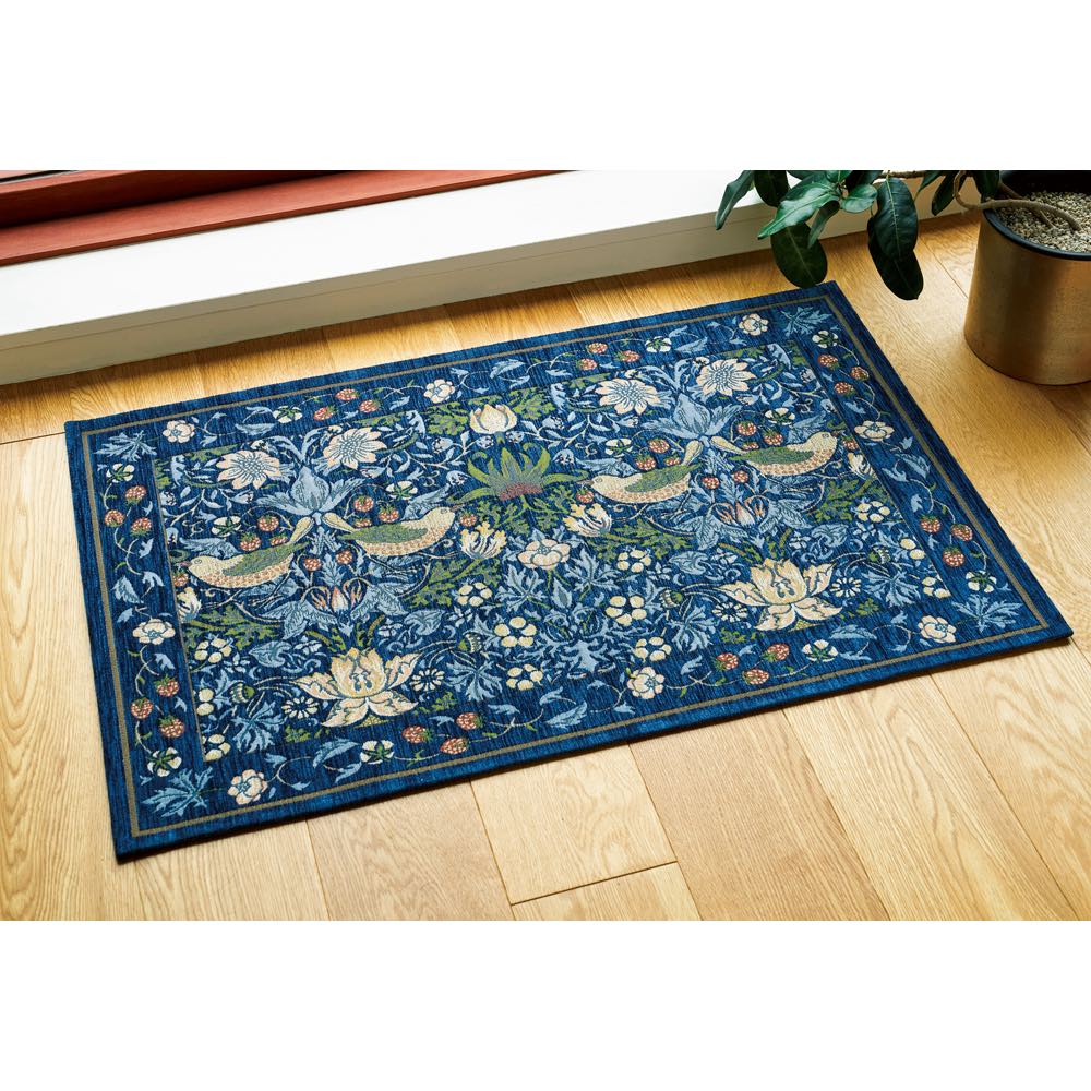 「暮らしの中にアートを」。その第一歩をモリスのマットで実現。モチーフはモリスデザインの中でも人気の高い「いちご泥棒」。19世紀の英国で活躍したウィリアム・モリスは、日常の暮らしの中でこそ美しいものを使うことを提案した芸術家。そのデザインは今なお、多くの人を魅了します。そんなモリスのあでやかなデザインを、繊細な表現を可能にするゴブラン織りで再現しました。織物のため比較的薄手なので、玄関マットとしてはもちろん、ドア前に置いても開閉の邪魔になにくく、リビングやベッドサイドマットにしてもおすすめです。ビロード状の毛羽があるシェニール糸をふんだんに使用しているため高級感があります。●ゴブラン織りとは織物の一種。絵模様を織り出したヨーロッパの「綴れ織り(つづれおり)」のことで、多色の糸を使用できるため、タペストリーのような繊細な表現ができる織物の一般名称になっています。名前の成り立ちは、15世紀にゴブラン一家がパリで作った染色工場の場所に、17世紀にタペストリーの国立工房が作られ発展したことにゴブランの名の由来があります。【ウィリアム・モリスのテキスタイルデザイン】160年の年月を経て愛され続ける、モリスのテキスタイルデザイン「家の中に、役に立たないもの、美しいと思えないものを置いてはならない」という言葉を残しているウィリアム・モリスは、絵画や彫刻など、美術館で鑑賞する装飾芸術品のことを「大芸術」、日常の暮らしや身のまわりの物を美しく彩る芸術品のことを、親しみを込めて「小芸術(レッサー・アーツ)」と呼びました。モリスが生涯をかけて取り組んだのはまさにこの「小芸術」。人生の細部に宿り楽しみや幸福感を大切にするための芸術です。62年の生涯で10人分の仕事をしたと言われるほど、精力的に仕事に励んだモリス。デザインの表現の追求のために、刺しゅうや染色、織物の技術も必ず自身で研究した、職人気質の人でした。William Morris(1834〜1896年)19世紀後半、装飾デザインの分野で活躍した英国の芸術家。傑出したインテリアデザイナーであると同時に、画家、詩人、グラフィックデザイナー、出版人、社会主義活動家と多彩な顔を持ち、それぞれの分野で目覚ましい業績を残した。アーツ&クラフツ運動に影響を与え、近代デザインの父とも呼ばれる。