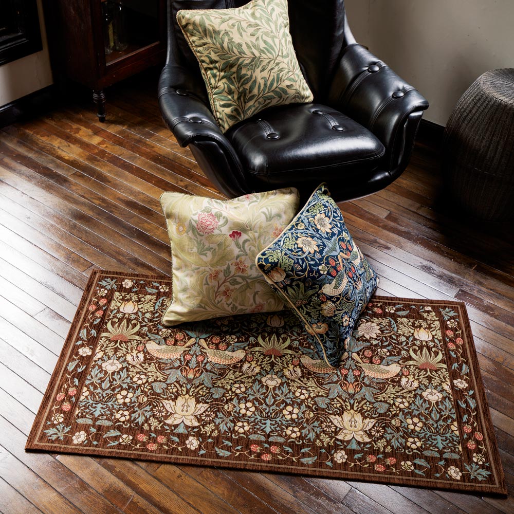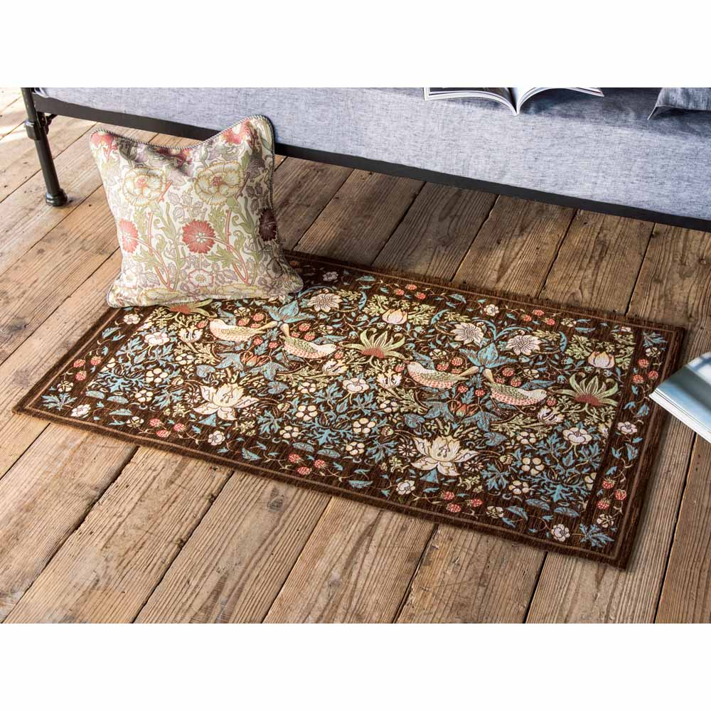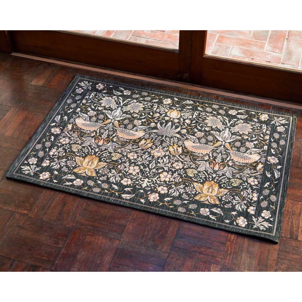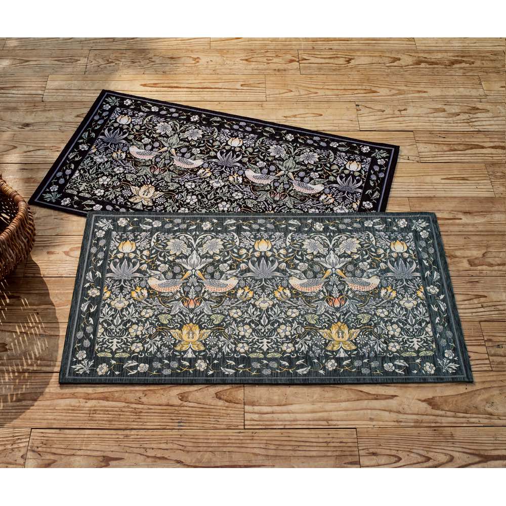 「暮らしの中にアートを」。その第一歩をモリスのマットで実現。モチーフはモリスデザインの中でも人気の高い「いちご泥棒」。19世紀の英国で活躍したウィリアム・モリスは、日常の暮らしの中でこそ美しいものを使うことを提案した芸術家。そのデザインは今なお、多くの人を魅了します。そんなモリスのあでやかなデザインを、繊細な表現を可能にするゴブラン織りで再現しました。織物のため比較的薄手なので、玄関マットとしてはもちろん、ドア前に置いても開閉の邪魔になにくく、リビングやベッドサイドマットにしてもおすすめです。ビロード状の毛羽があるシェニール糸をふんだんに使用しているため高級感があります。●ゴブラン織りとは織物の一種。絵模様を織り出したヨーロッパの「綴れ織り(つづれおり)」のことで、多色の糸を使用できるため、タペストリーのような繊細な表現ができる織物の一般名称になっています。名前の成り立ちは、15世紀にゴブラン一家がパリで作った染色工場の場所に、17世紀にタペストリーの国立工房が作られ発展したことにゴブランの名の由来があります。【ウィリアム・モリスのテキスタイルデザイン】160年の年月を経て愛され続ける、モリスのテキスタイルデザイン「家の中に、役に立たないもの、美しいと思えないものを置いてはならない」という言葉を残しているウィリアム・モリスは、絵画や彫刻など、美術館で鑑賞する装飾芸術品のことを「大芸術」、日常の暮らしや身のまわりの物を美しく彩る芸術品のことを、親しみを込めて「小芸術(レッサー・アーツ)」と呼びました。モリスが生涯をかけて取り組んだのはまさにこの「小芸術」。人生の細部に宿り楽しみや幸福感を大切にするための芸術です。62年の生涯で10人分の仕事をしたと言われるほど、精力的に仕事に励んだモリス。デザインの表現の追求のために、刺しゅうや染色、織物の技術も必ず自身で研究した、職人気質の人でした。William Morris(1834〜1896年)19世紀後半、装飾デザインの分野で活躍した英国の芸術家。傑出したインテリアデザイナーであると同時に、画家、詩人、グラフィックデザイナー、出版人、社会主義活動家と多彩な顔を持ち、それぞれの分野で目覚ましい業績を残した。アーツ&クラフツ運動に影響を与え、近代デザインの父とも呼ばれる。
