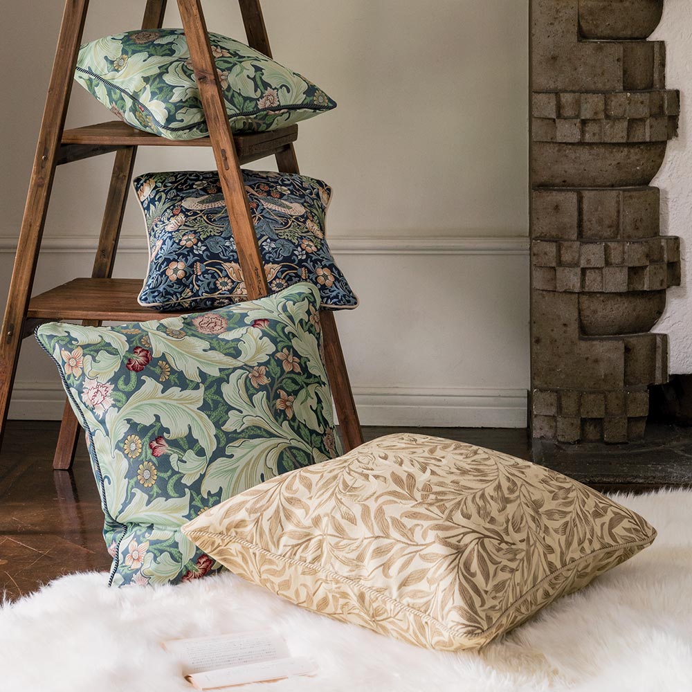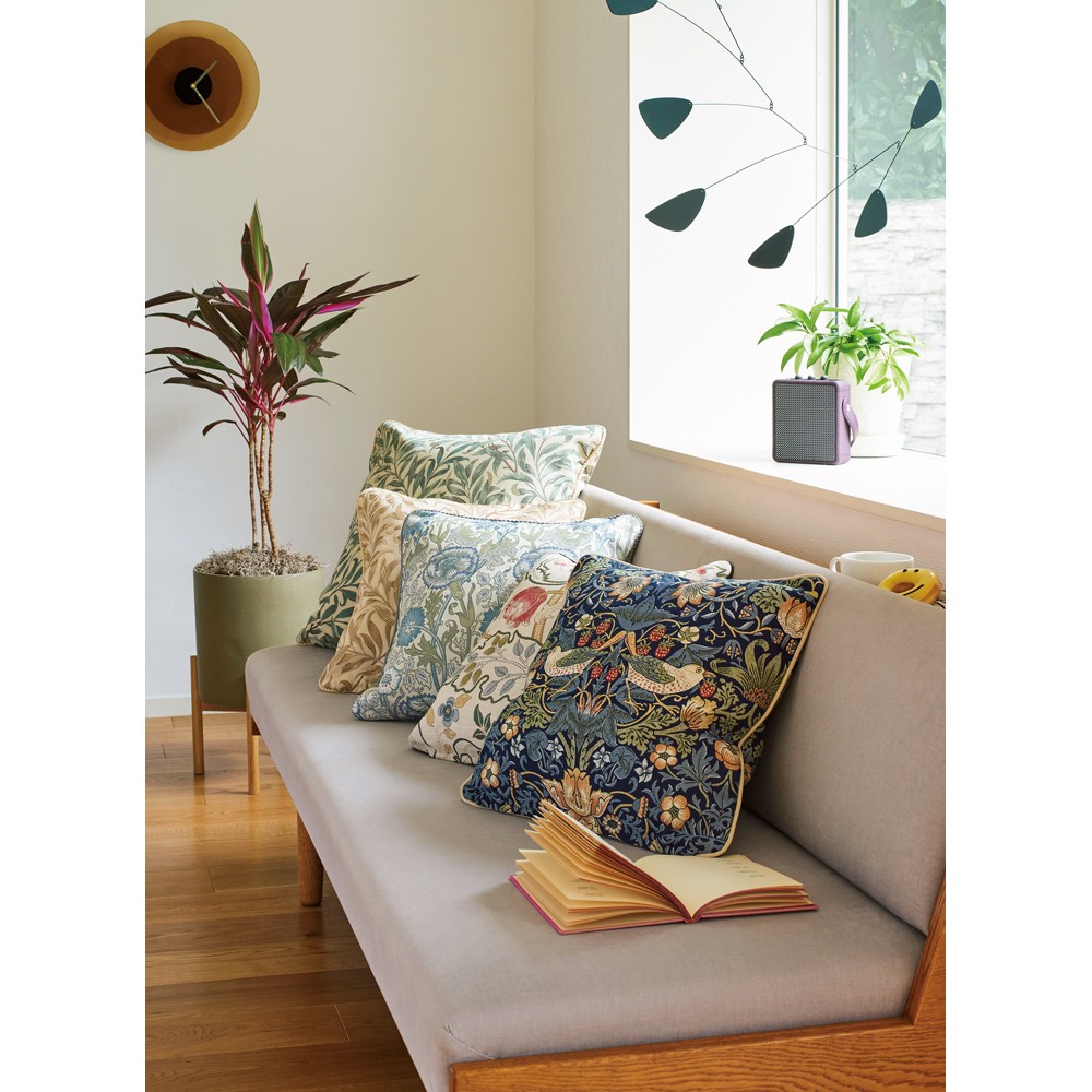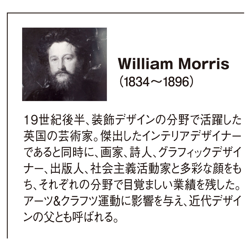 家具の上のモリスミュージアム。自然に触発されたボタニカル柄を、クッションカバーに。ウィリアムモリスのパターンは、壁紙やファブリックに多く使われていますが、気軽に取り入れられるといったら、クッションカバーやシートクッションでしょう。ジャカード織りの細かい柄表現は日本製ならでは。【ウィリアム・モリスのテキスタイルデザイン】160年の年月を経て愛され続ける、モリスのテキスタイルデザイン「家の中に、役に立たないもの、美しいと思えないものを置いてはならない」という言葉を残しているウィリアム・モリスは、絵画や彫刻など、美術館で鑑賞する装飾芸術品のことを「大芸術」、日常の暮らしや身のまわりの物を美しく彩る芸術品のことを、親しみを込めて「小芸術(レッサー・アーツ)」と呼びました。モリスが生涯をかけて取り組んだのはまさにこの「小芸術」。人生の細部に宿り楽しみや幸福感を大切にするための芸術です。62年の生涯で10人分の仕事をしたと言われるほど、精力的に仕事に励んだモリス。デザインの表現の追求のために、刺しゅうや染色、織物の技術も必ず自身で研究した、職人気質の人でした。William Morris(1834〜1896年)19世紀後半、装飾デザインの分野で活躍した英国の芸術家。傑出したインテリアデザイナーであると同時に、画家、詩人、グラフィックデザイナー、出版人、社会主義活動家と多彩な顔を持ち、それぞれの分野で目覚ましい業績を残した。アーツ&クラフツ運動に影響を与え、近代デザインの父とも呼ばれる。
