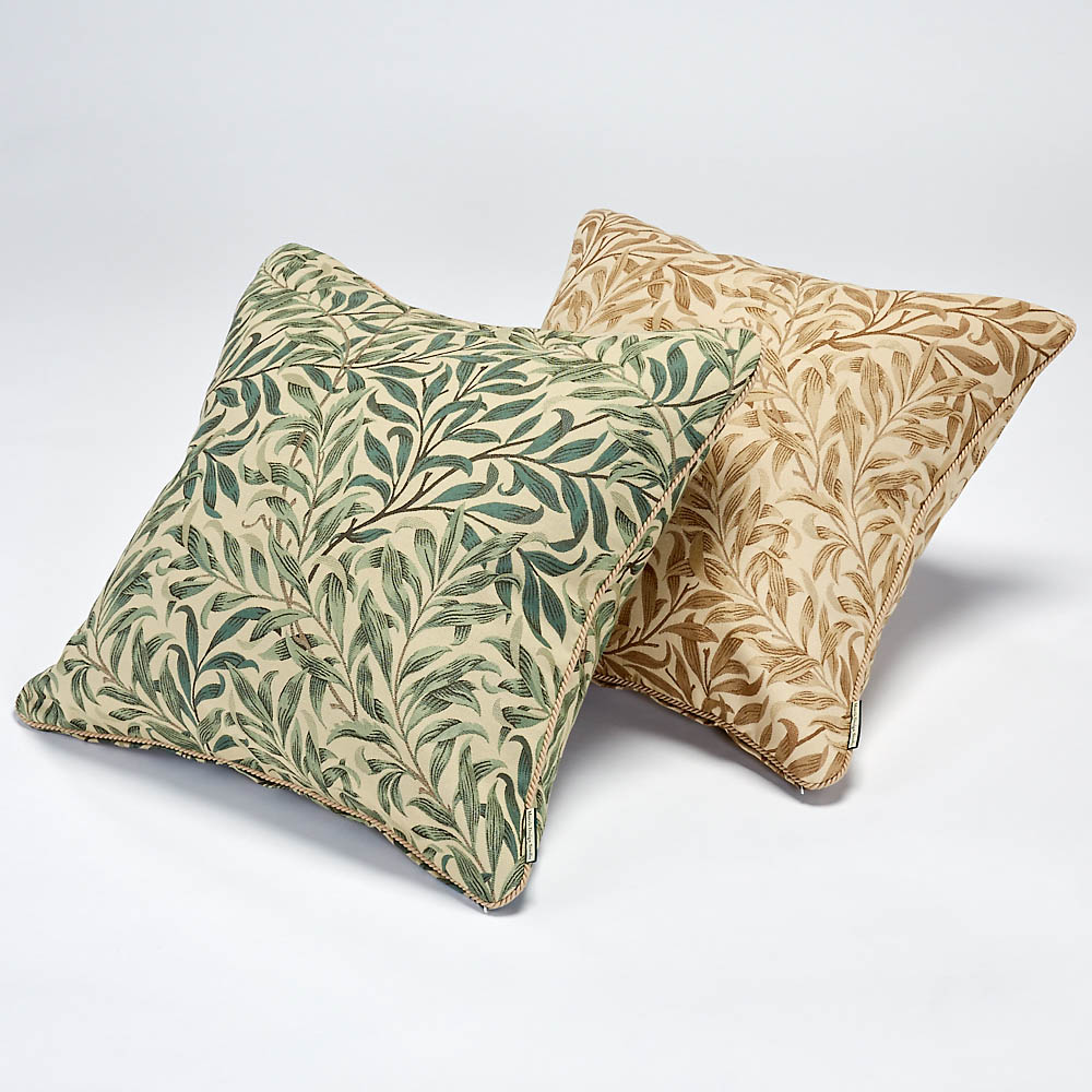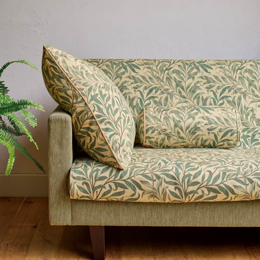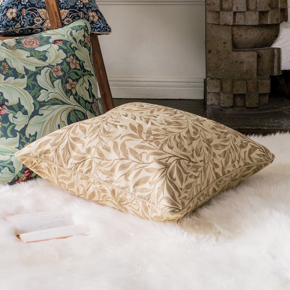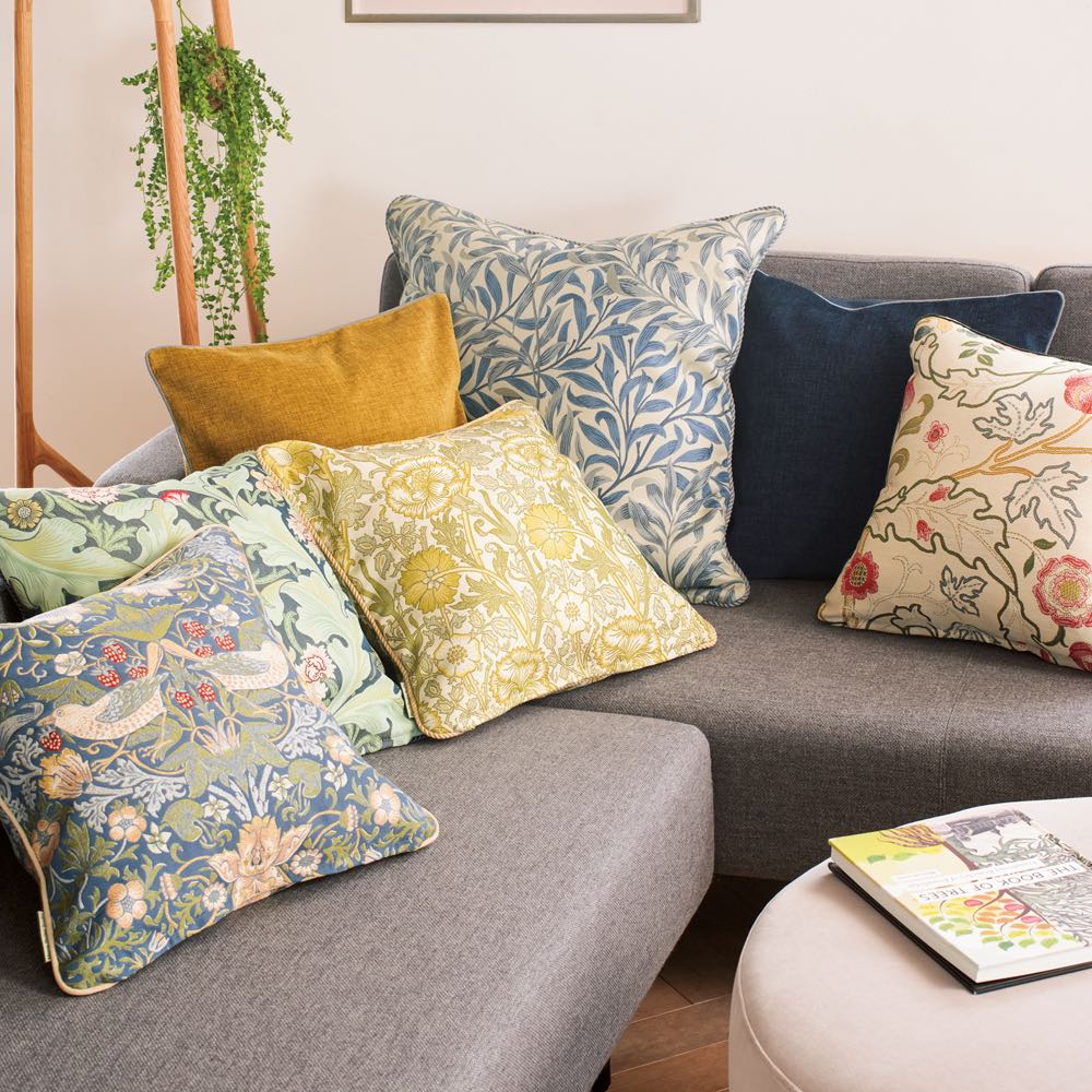家具の上のモリスミュージアム。自然に触発されたボタニカル柄を、クッションカバーに。ウィリアムモリスのパターンは、壁紙やファブリックに多く使われていますが、気軽に取り入れられるといったら、クッションカバーやシートクッションでしょう。ジャカード織りの細かい柄表現は日本製ならでは。【ウィリアム・モリスのテキスタイルデザイン】160年の年月を経て愛され続ける、モリスのテキスタイルデザイン「家の中に、役に立たないもの、美しいと思えないものを置いてはならない」という言葉を残しているウィリアム・モリスは、絵画や彫刻など、美術館で鑑賞する装飾芸術品のことを「大芸術」、日常の暮らしや身のまわりの物を美しく彩る芸術品のことを、親しみを込めて「小芸術(レッサー・アーツ)」と呼びました。モリスが生涯をかけて取り組んだのはまさにこの「小芸術」。人生の細部に宿り楽しみや幸福感を大切にするための芸術です。62年の生涯で10人分の仕事をしたと言われるほど、精力的に仕事に励んだモリス。デザインの表現の追求のために、刺しゅうや染色、織物の技術も必ず自身で研究した、職人気質の人でした。William Morris(1834〜1896年)19世紀後半、装飾デザインの分野で活躍した英国の芸術家。傑出したインテリアデザイナーであると同時に、画家、詩人、グラフィックデザイナー、出版人、社会主義活動家と多彩な顔を持ち、それぞれの分野で目覚ましい業績を残した。アーツ&クラフツ運動に影響を与え、近代デザインの父とも呼ばれる。