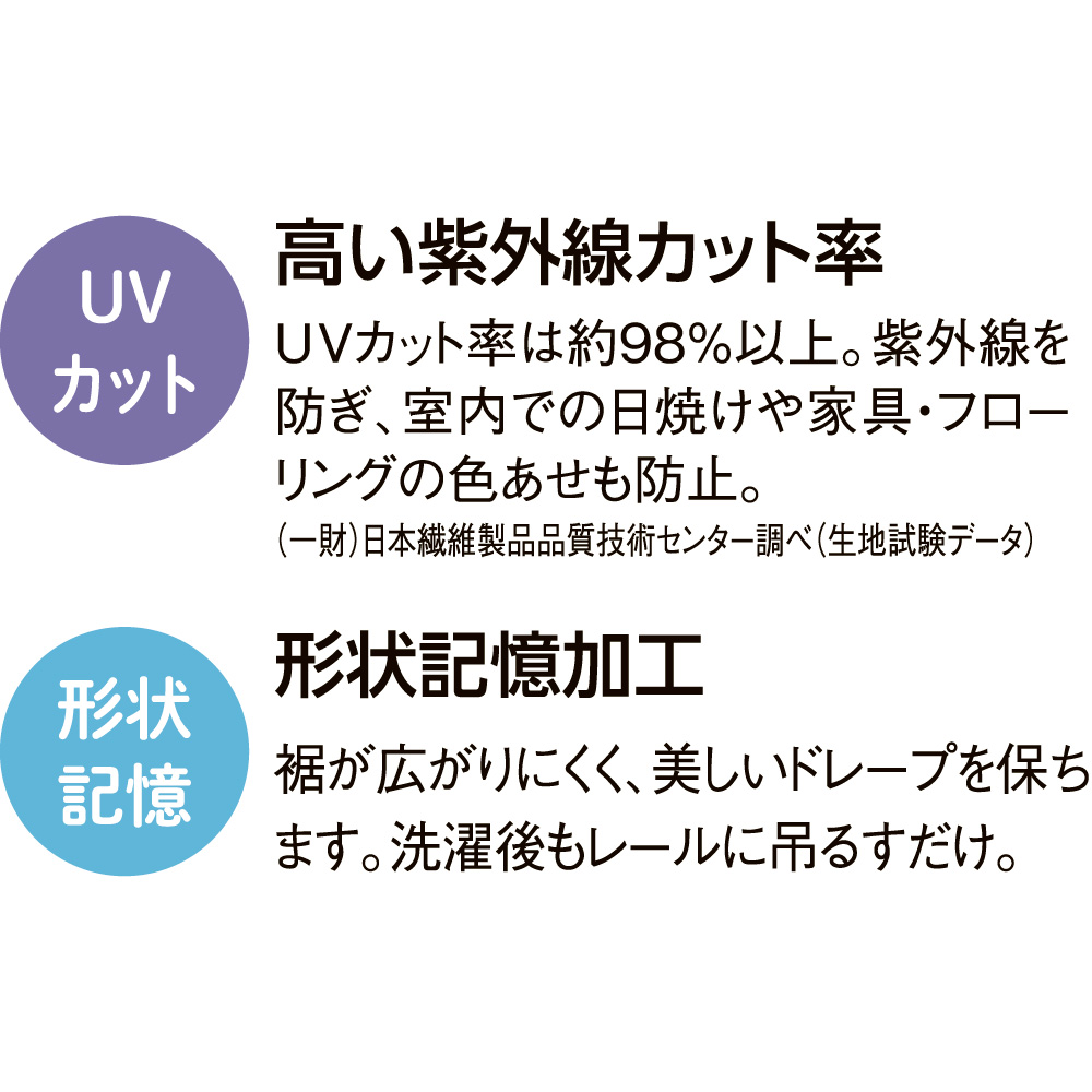 • UVカットで紫外線を防ぎ、室内での日焼けや家具・フローリングの色あせを防止。 (一財)日本繊維製品品質技術センター調べ(生地試験データ)