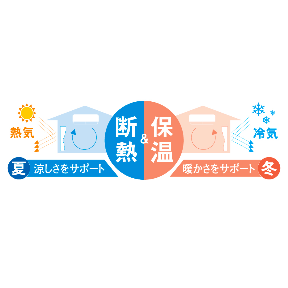●遮熱・保温効果で、夏涼しく、冬暖かく一年中快適です。高い遮熱・保温効果率で、夏は室内の温度の上昇を軽減し、冬は暖房効果をサポート。環境にもお財布にもエコ効果を発揮します。