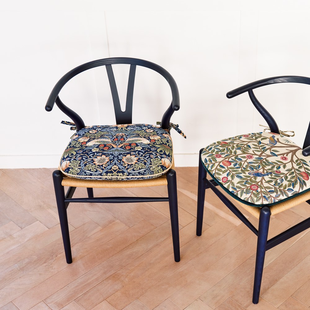 時代を超えて愛されるウィリアム・モリスの代表作のひとつ「いちご泥棒」の柄をジャガード織りで表現しました。美しさと座り心地を求めたシートクッションです。ダイニングや書斎のイスを和やかに彩ります。長時間座る方には、機能素材も。モリスのパターンは、壁紙やファブリックに多く使われていますが、気軽に取り入れられるといったら、クッションカバーやシートクッションでしょう。ゆったりサイズのシートクッション。「ノーマルタイプ」は固わた入りで底付き感を軽減し、ソフトな感触の低反発ウレタンと立ち上がりやすい高反発との二重構造の「機能素材タイプ」は長い時間座る方や、立ったり座ったりが多いアクティブな生活シーンにおすすめです。ジャカード織りの細かい柄表現は日本製ならでは。【ウィリアム・モリスのテキスタイルデザイン】150年の年月を経て愛され続ける、モリスのテキスタイルデザイン「家の中に、役に立たないもの、美しいと思えないものを置いてはならない」という言葉を残しているウィリアム・モリスは、絵画や彫刻など、美術館で鑑賞する装飾芸術品のことを「大芸術」、日常の暮らしや身のまわりの物を美しく彩る芸術品のことを、親しみを込めて「小芸術(レッサー・アーツ)」と呼びました。モリスが生涯をかけて取り組んだのはまさにこの「小芸術」。人生の細部に宿り楽しみや幸福感を大切にするための芸術です。62年の生涯で10人分の仕事をしたと言われるほど、精力的に仕事に励んだモリス。デザインの表現の追求のために、刺しゅうや染色、織物の技術も必ず自身で研究した、職人気質の人でした。William Morris(1834〜1896年)19世紀後半、装飾デザインの分野で活躍した英国の芸術家。傑出したインテリアデザイナーであると同時に、画家、詩人、グラフィックデザイナー、出版人、社会主義活動家と多彩な顔を持ち、それぞれの分野で目覚ましい業績を残した。アーツ&クラフツ運動に影響を与え、近代デザインの父とも呼ばれる。