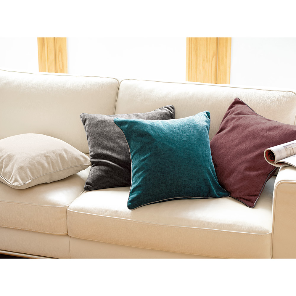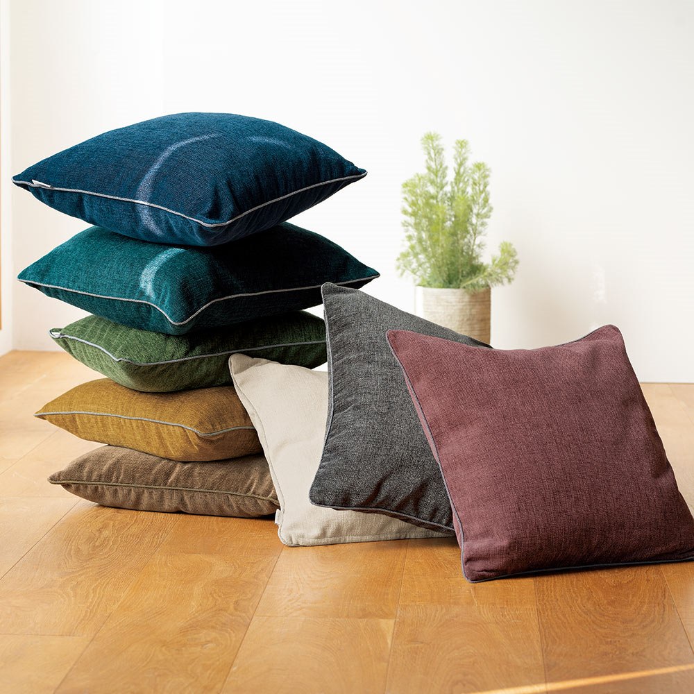 合わせやすい無地の上質な素材、こっくりと深い色合いが揃ったクッションカバーです。シンプルリッチな佇まいで空間のセンスアップ効果絶大。ベルベットのような艶のあるなめらかな生地に、シックなカラーのパイピングを施しました。シンプルだからこそ生地や仕立ての良さが感じられる、上品なクッションカバーです。