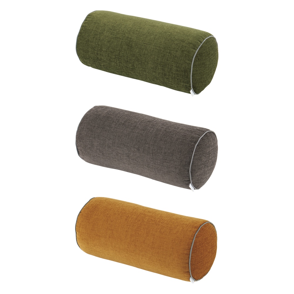 合わせやすい無地の上質な素材。こっくりと深い色合いが揃う。ベルベットのような艶のあるなめらかな生地にシックな色のパイピングを施した、生地と仕立ての良さが感じられる上品なボルスタークッション。