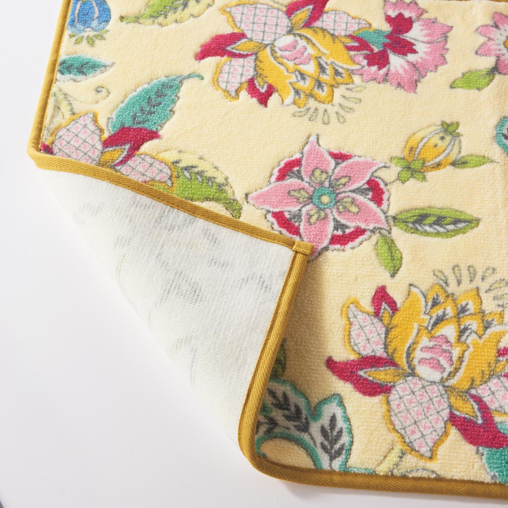 人気のMINTONハドンフラワーにモダンな大柄が登場。キッチンやリビングを華やかに。 生地もプリントも国産のマット。パイルの密度が高いため、快適な踏み心地です。ハドンフラワーを大ぶりの総柄で表現した存在感のあるデザイン。エレガントなMINTONワールドにモダンな印象が加わり、今までのファンの方だけでなく、あらたなお客様に幅広くお使いいただけるテイストに仕上がりました。夏にぴったりの爽やかなグリーン系とやさしいイエロー系が、キッチンやリビング、バスルーム・玄関の足もとを彩ってくれます。毛足約8ミリと短めのパイルですが、密度があるため心地よい踏み心地。SEK抗菌防臭、吸水速乾と機能も充実しています。ギフトにもぜひご利用ください。【ポイント1】立体感のある柄これまであまりなかった大ぶりのハドンフラワーの総柄。プリントしたあと、柄の一部にエンボス加工を施し立体感を持たせました。※商品により柄の出方が異なります。【ポイント2】清潔に使える抗菌防臭&吸水速乾機能抗菌防臭機能を持つ糸「東レ・セベリス」と吸水速乾機能を持つ糸「東レ・サミーナ」を使用。繊維上の細菌の増殖を抑制します。抗菌効果は、洗濯しても持続しやすくなっています。●SEKマーク付き繊維上の細菌の繁殖を抑制し、細菌の発生する臭いを抑制(防臭効果)することができ、「抗菌防臭加工繊維製品認定基準」をクリアした商品に表示できる、SEKマーク付きです。【ポイント3】裏面は滑りにくい加工裏面には滑りにくい加工が施されていますので、ズレにくく快適にご使用いただけます。【ポイント4】丸洗いOK洗濯機で丸洗いできますので、いつも清潔に使えます。※洗濯機でお洗濯する場合は必ずネットをご使用ください。※乾燥機・ドラム式洗濯機は使用できません。◆MINTON英国ボーンチャイナの窯元として18世紀末に創設以来、世界中で愛されてきた老舗ブランド。