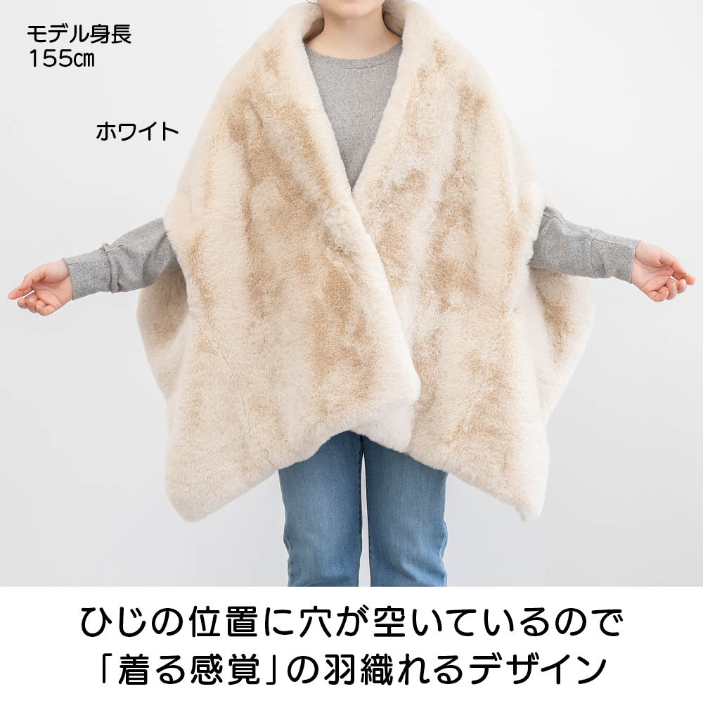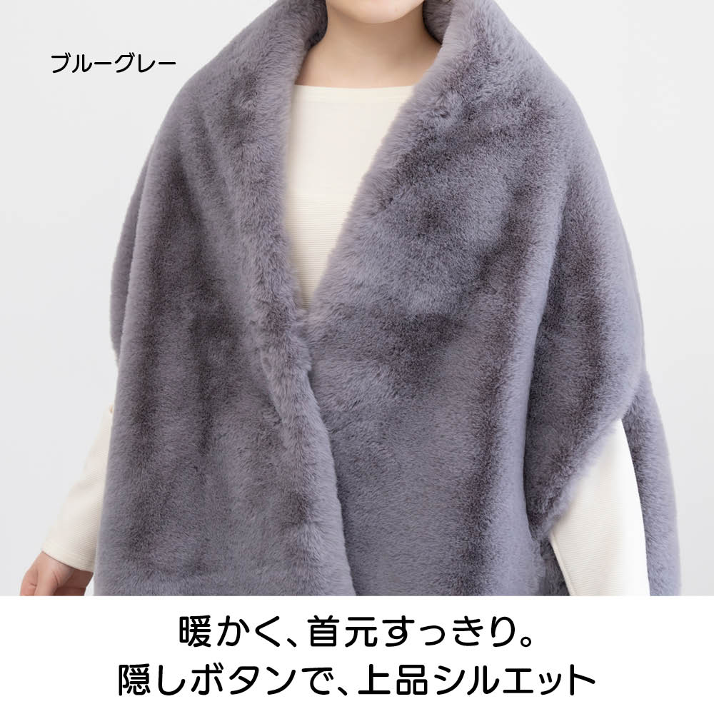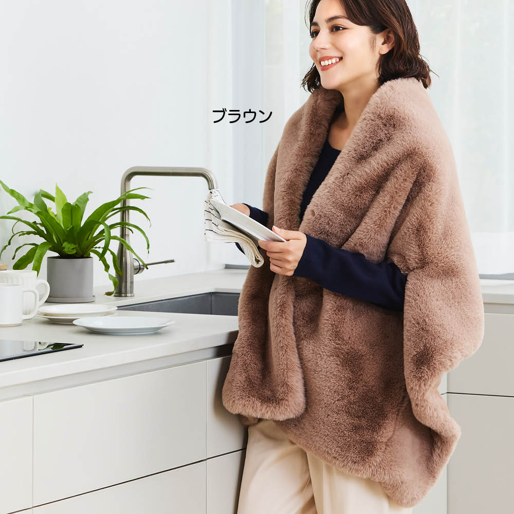 ふわっと軽やかで、まるでラビットファーのような贅沢な肌ざわり。ひじの位置に穴が空いていることで、羽織ったまま家事ができる機能的なブランケットです。首元まで暖かく、胸元はすっきりと上品に。隠しボタンで見た目もスマートに仕上げました。この上質感で5000円台は、まさに“お値段以上”の一枚です。くつろぎを羽織る。冬に嬉しい暖かさ羽織るだけでふんわり暖かく、くつろぎの時間を快適に。前は長め、後ろは短めのシルエットで、座った時に生地がじゃまにならないのも嬉しいポイント。部屋着の上からさっと羽織れて、見た目もおしゃれな優秀ブランケットです。すっきり羽織れるから、家事も暖かく快適に腕を通して着られるデザインで、着ぶくれせずに動きやすいのが特長。まるで毛布をまとっているような暖かさで、寒い季節の家事にもぴったりです。ひじ部分にスリットから手首が出るので、水仕事でもじゃまにならず快適にお使いいただけます。暖かく、首元すっきり。隠しボタンで、上品シルエット身体を暖かく包み込み、胸元はすっきりと開いた美しいシルエットに。前留めには隠しボタンを採用し、見た目もスマートに仕上げました。羽織るだけで、上品な雰囲気をまとえます。ずっと触れていたくなる、ふわっとやわらかな肌触りまるでラビットファーのようになめらかで、やさしい肌触り。羽織った瞬間から心地良いぬくもりに癒されます。ネットに入れて、まるごとお洗濯OK!汚れたらネットに入れて洗濯機で丸洗いできるので、いつでも清潔に保てます。「ちょっとそこまで買い物」にも使える、おしゃれな一枚室内はもちろん、近所のコンビニやゴミ出しなど、ちょっとした外出にもそのまま使える上品なデザイン。ケープのようにさっと羽織れる手軽さと、上質感のある素材、美しいシルエットが魅力です。