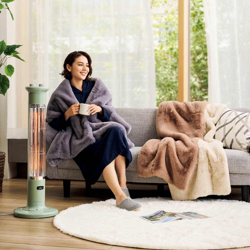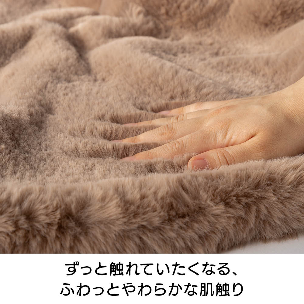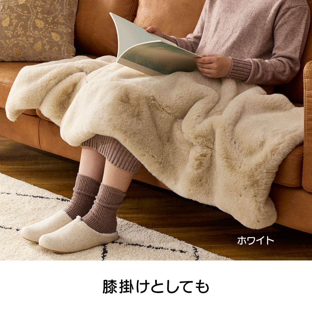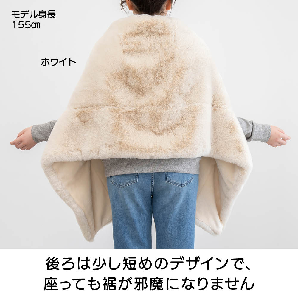 ふわっと軽やかで、まるでラビットファーのような贅沢な肌ざわり。ひじの位置に穴が空いていることで、羽織ったまま家事ができる機能的なブランケットです。首元まで暖かく、胸元はすっきりと上品に。隠しボタンで見た目もスマートに仕上げました。この上質感で5000円台は、まさに“お値段以上”の一枚です。くつろぎを羽織る。冬に嬉しい暖かさ羽織るだけでふんわり暖かく、くつろぎの時間を快適に。前は長め、後ろは短めのシルエットで、座った時に生地がじゃまにならないのも嬉しいポイント。部屋着の上からさっと羽織れて、見た目もおしゃれな優秀ブランケットです。すっきり羽織れるから、家事も暖かく快適に腕を通して着られるデザインで、着ぶくれせずに動きやすいのが特長。まるで毛布をまとっているような暖かさで、寒い季節の家事にもぴったりです。ひじ部分にスリットから手首が出るので、水仕事でもじゃまにならず快適にお使いいただけます。暖かく、首元すっきり。隠しボタンで、上品シルエット身体を暖かく包み込み、胸元はすっきりと開いた美しいシルエットに。前留めには隠しボタンを採用し、見た目もスマートに仕上げました。羽織るだけで、上品な雰囲気をまとえます。ずっと触れていたくなる、ふわっとやわらかな肌触りまるでラビットファーのようになめらかで、やさしい肌触り。羽織った瞬間から心地良いぬくもりに癒されます。ネットに入れて、まるごとお洗濯OK!汚れたらネットに入れて洗濯機で丸洗いできるので、いつでも清潔に保てます。「ちょっとそこまで買い物」にも使える、おしゃれな一枚室内はもちろん、近所のコンビニやゴミ出しなど、ちょっとした外出にもそのまま使える上品なデザイン。ケープのようにさっと羽織れる手軽さと、上質感のある素材、美しいシルエットが魅力です。