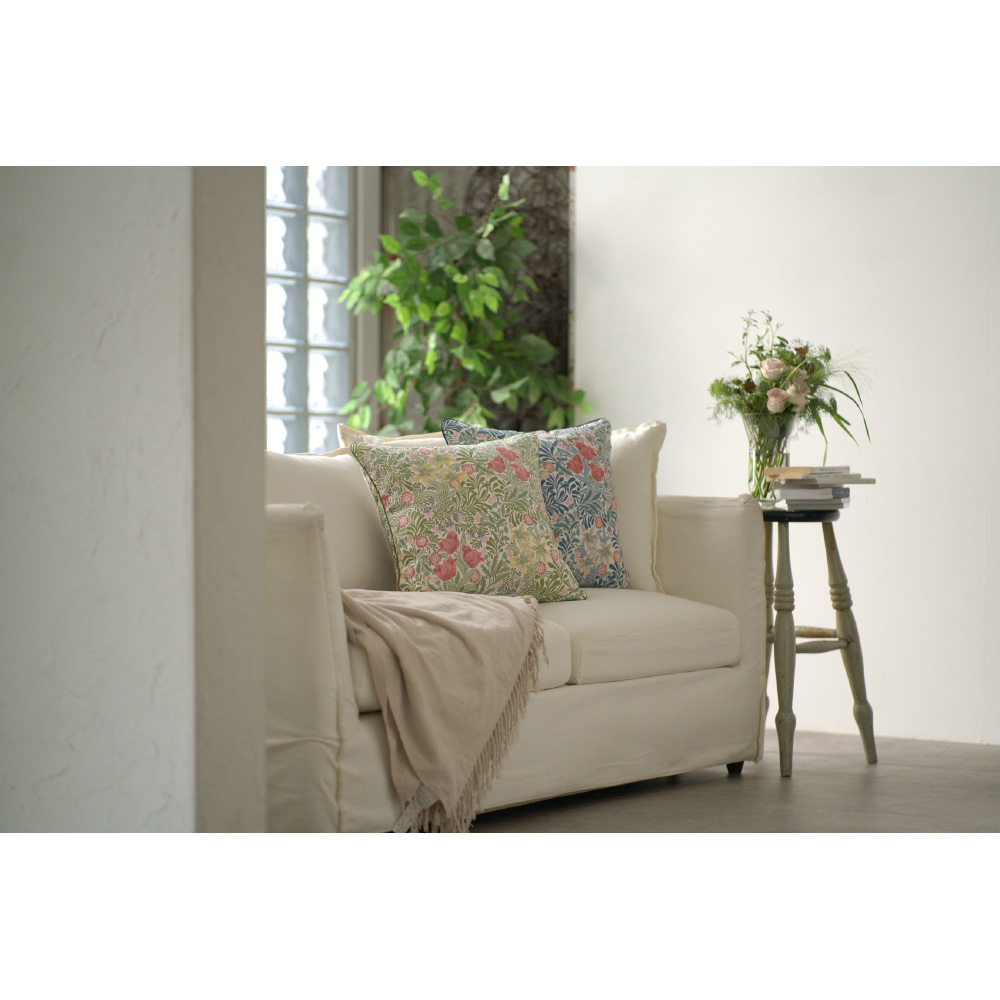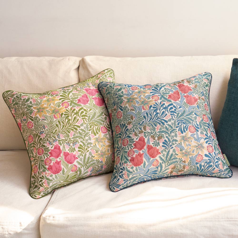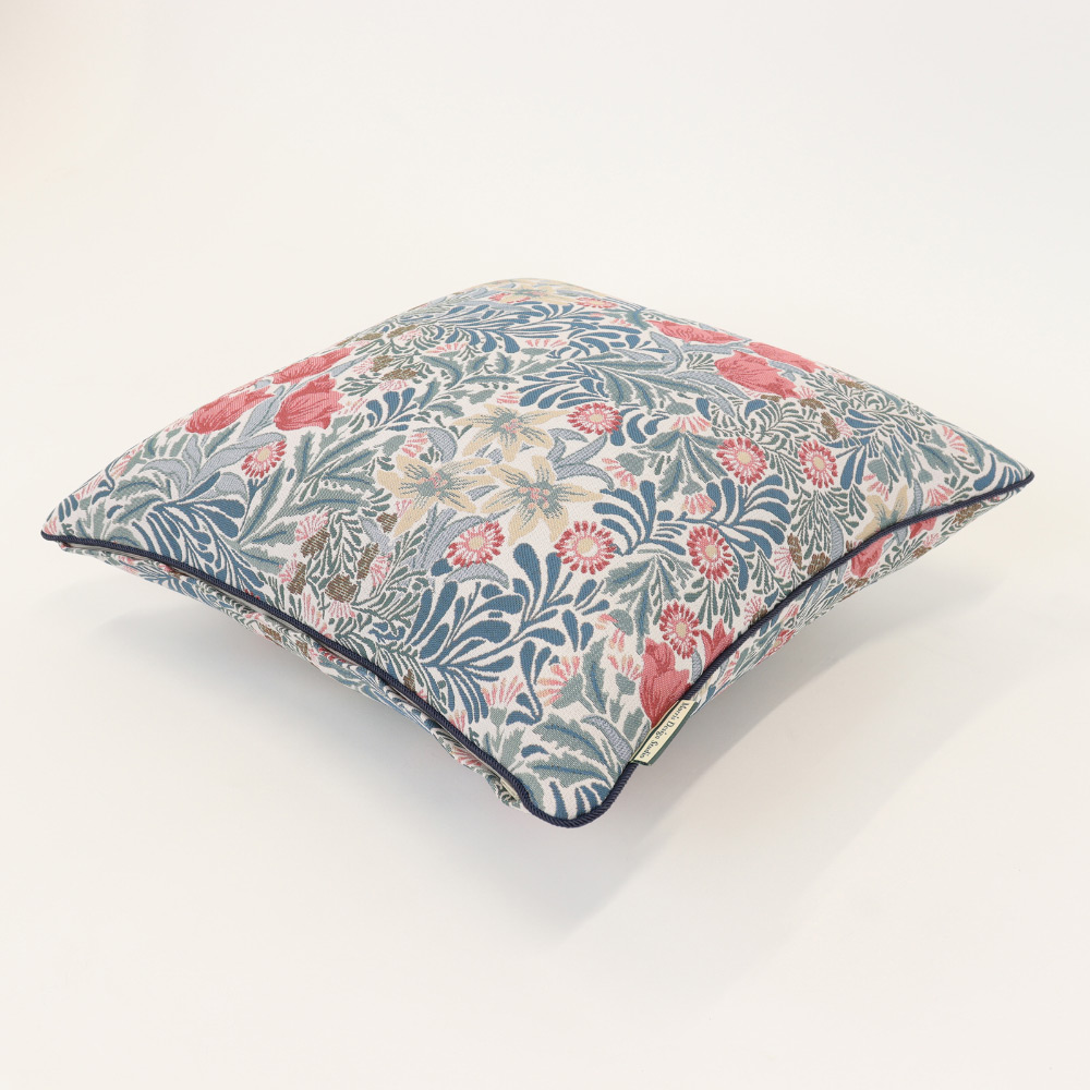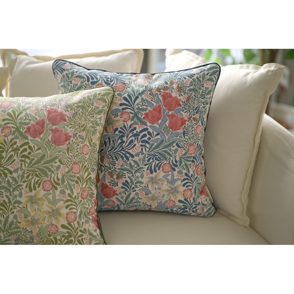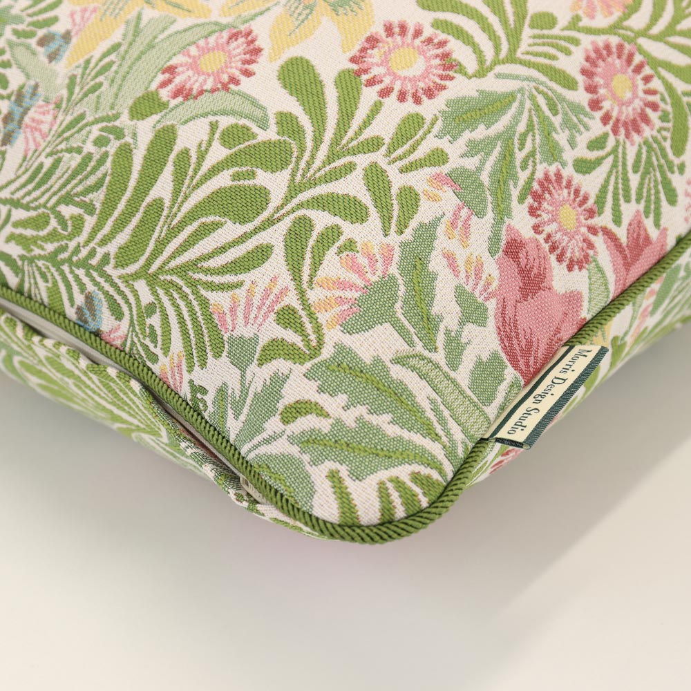 モリス柄のクッションが華やかなアクセントに。蔦や花々が咲き乱れる楽園を描いた、モリスのデザイン「バウアー」のクッションカバー。草花の立体感をジャカード織で表現。ウィリアムモリスのパターンは、壁紙やファブリックに多く使われていますが、気軽に取り入れられるといったら、クッションカバーやシートクッションでしょう。ジャカード織りの細かい柄表現は日本製ならでは。【ウィリアム・モリスのテキスタイルデザイン】160年の年月を経て愛され続ける、モリスのテキスタイルデザイン「家の中に、役に立たないもの、美しいと思えないものを置いてはならない」という言葉を残しているウィリアム・モリスは、絵画や彫刻など、美術館で鑑賞する装飾芸術品のことを「大芸術」、日常の暮らしや身のまわりの物を美しく彩る芸術品のことを、親しみを込めて「小芸術(レッサー・アーツ)」と呼びました。モリスが生涯をかけて取り組んだのはまさにこの「小芸術」。人生の細部に宿り楽しみや幸福感を大切にするための芸術です。62年の生涯で10人分の仕事をしたと言われるほど、精力的に仕事に励んだモリス。デザインの表現の追求のために、刺しゅうや染色、織物の技術も必ず自身で研究した、職人気質の人でした。William Morris(1834〜1896年)19世紀後半、装飾デザインの分野で活躍した英国の芸術家。傑出したインテリアデザイナーであると同時に、画家、詩人、グラフィックデザイナー、出版人、社会主義活動家と多彩な顔を持ち、それぞれの分野で目覚ましい業績を残した。アーツ&クラフツ運動に影響を与え、近代デザインの父とも呼ばれる。