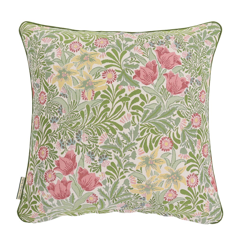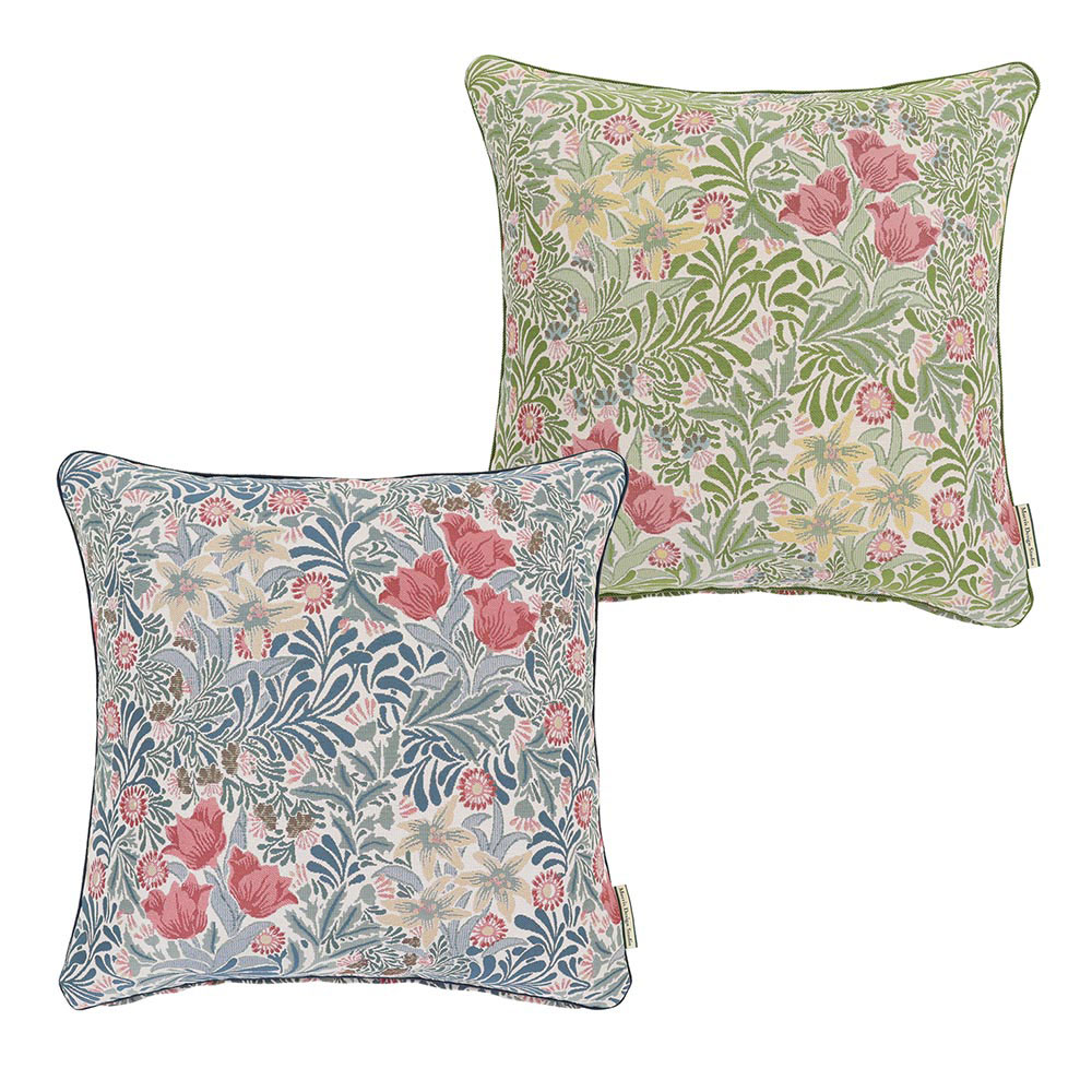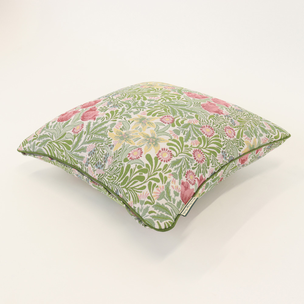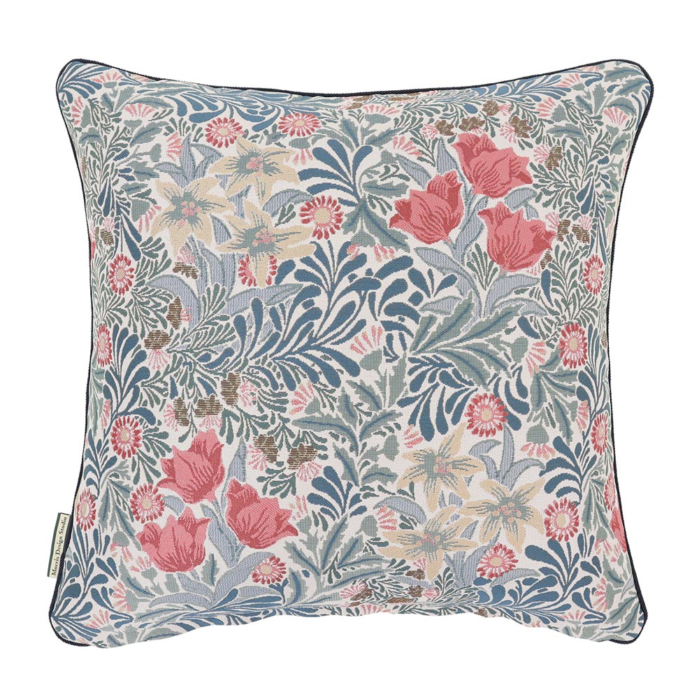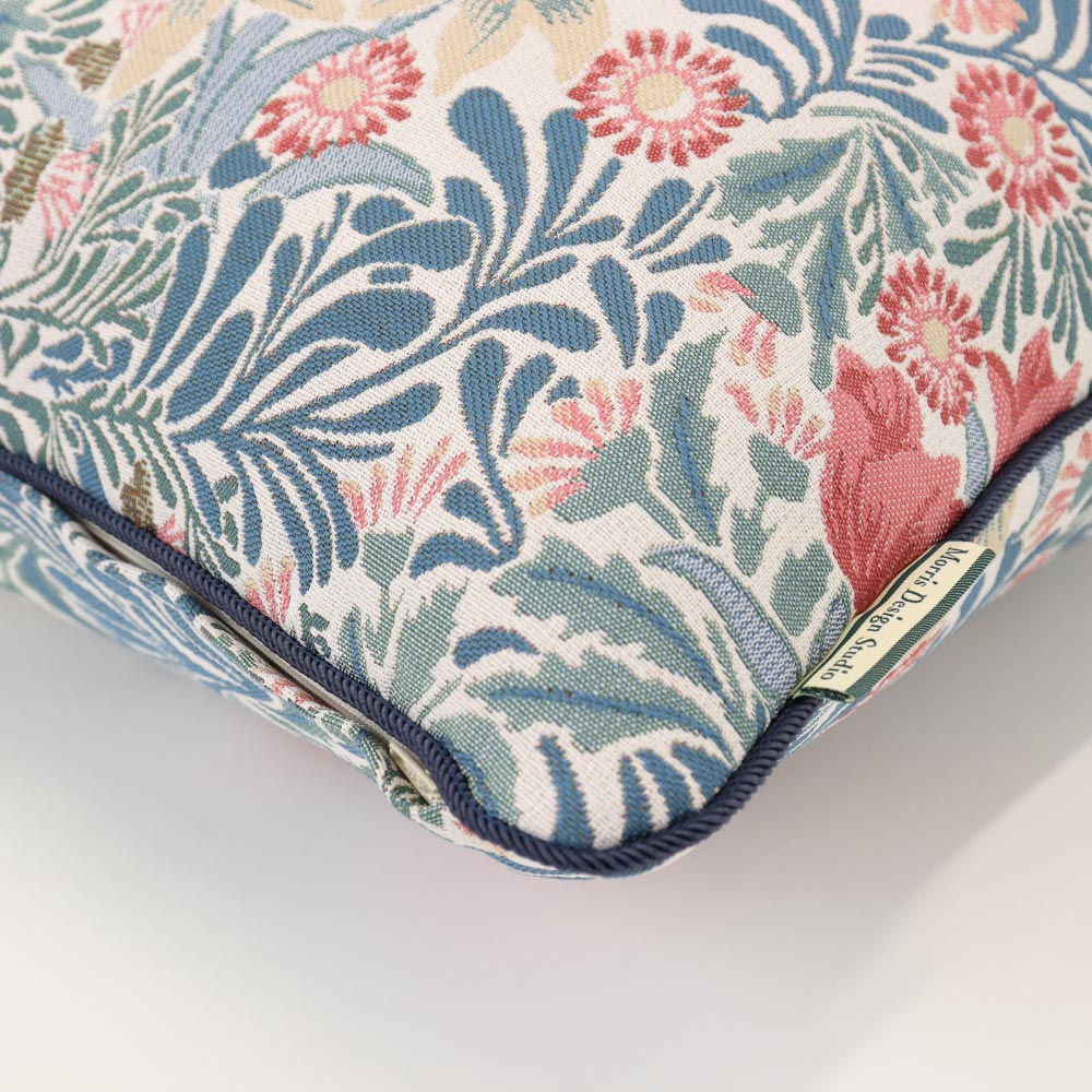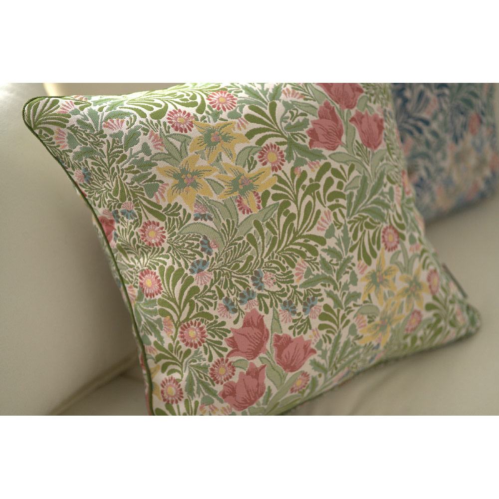 モリス柄のクッションが華やかなアクセントに。蔦や花々が咲き乱れる楽園を描いた、モリスのデザイン「バウアー」のクッションカバー。草花の立体感をジャカード織で表現。ウィリアムモリスのパターンは、壁紙やファブリックに多く使われていますが、気軽に取り入れられるといったら、クッションカバーやシートクッションでしょう。ジャカード織りの細かい柄表現は日本製ならでは。【ウィリアム・モリスのテキスタイルデザイン】160年の年月を経て愛され続ける、モリスのテキスタイルデザイン「家の中に、役に立たないもの、美しいと思えないものを置いてはならない」という言葉を残しているウィリアム・モリスは、絵画や彫刻など、美術館で鑑賞する装飾芸術品のことを「大芸術」、日常の暮らしや身のまわりの物を美しく彩る芸術品のことを、親しみを込めて「小芸術(レッサー・アーツ)」と呼びました。モリスが生涯をかけて取り組んだのはまさにこの「小芸術」。人生の細部に宿り楽しみや幸福感を大切にするための芸術です。62年の生涯で10人分の仕事をしたと言われるほど、精力的に仕事に励んだモリス。デザインの表現の追求のために、刺しゅうや染色、織物の技術も必ず自身で研究した、職人気質の人でした。William Morris(1834〜1896年)19世紀後半、装飾デザインの分野で活躍した英国の芸術家。傑出したインテリアデザイナーであると同時に、画家、詩人、グラフィックデザイナー、出版人、社会主義活動家と多彩な顔を持ち、それぞれの分野で目覚ましい業績を残した。アーツ&クラフツ運動に影響を与え、近代デザインの父とも呼ばれる。