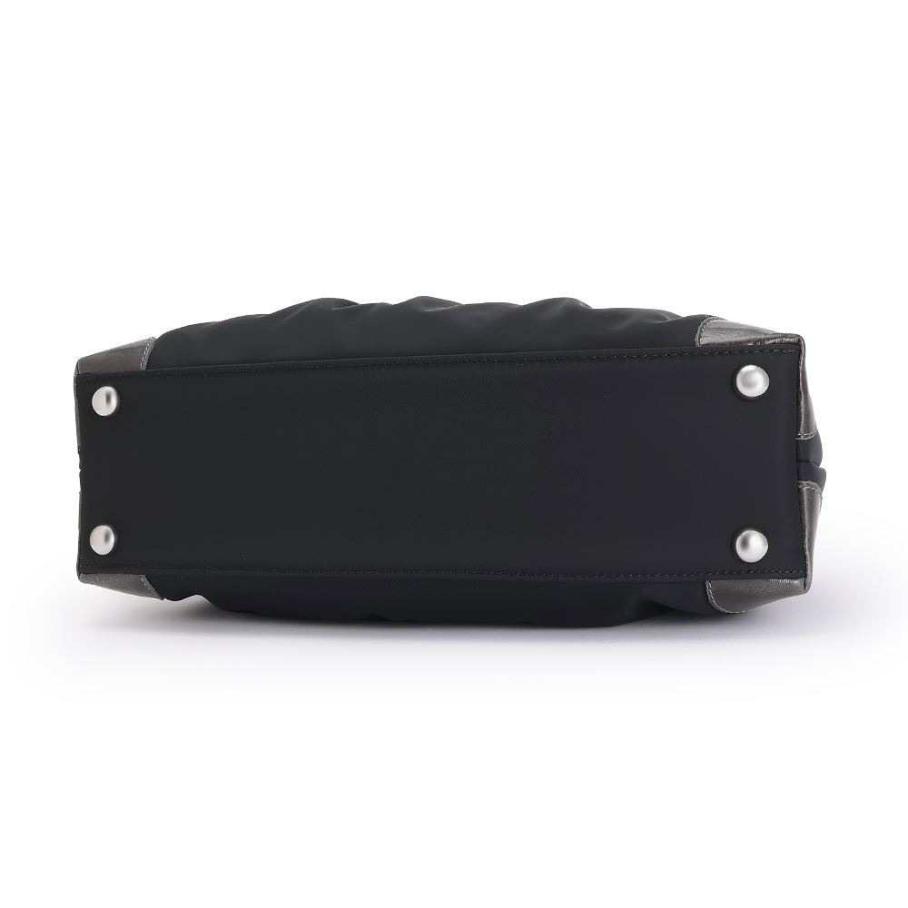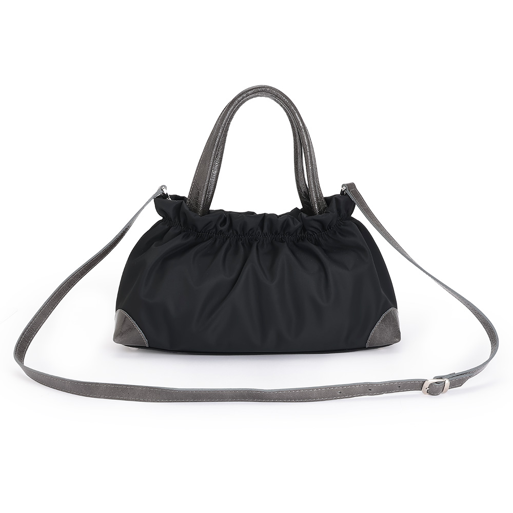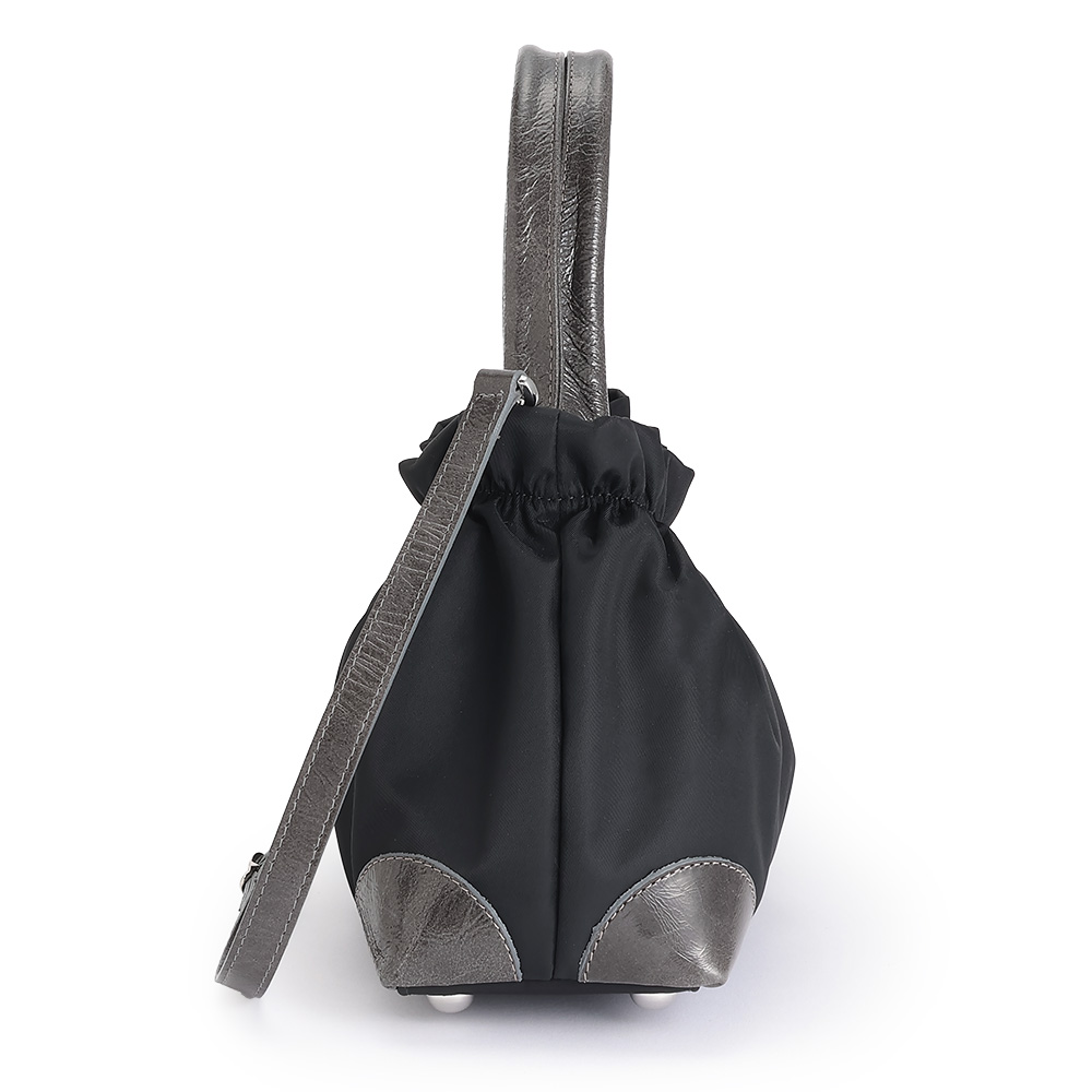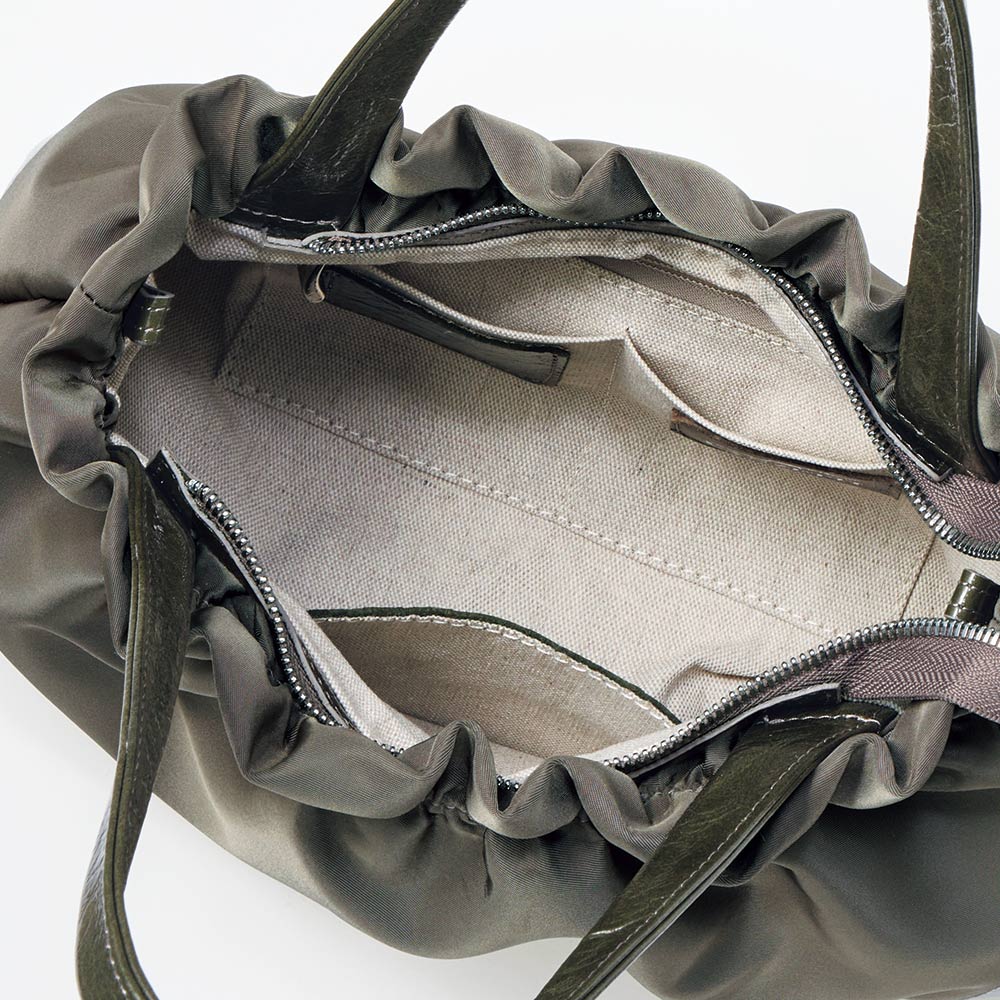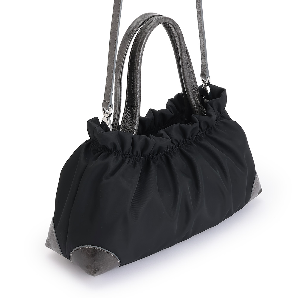 大人目線の“カジュアル”で印象をアップデートしてリュクスな素材使いや、熟練技が生み出すフォルム。大人の女性に満足していただける、新基準のカジュアルです。この冬の“itバッグ”を大人可愛くアレンジ。旬な横長バッグを巾着風に拵えた、洒脱なイタリア製バッグ。艶やかなナイロン素材がドレープを引き立てて、優美な持ち映えを誘います。持ち手とボディ四隅にはリンクルエナメルを配し、光沢とリッチ感を上乗せ。