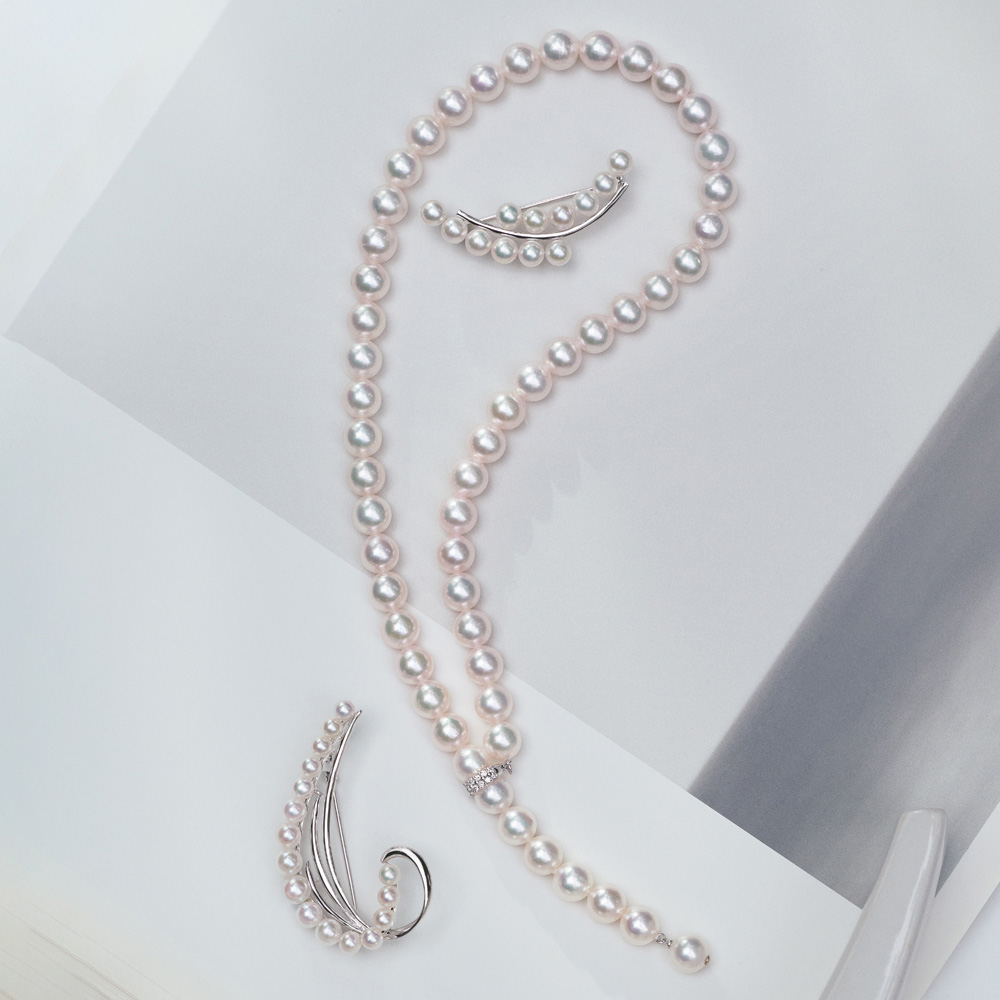 PRECIOUS RADIANCE普遍的な美との邂逅ジュエリーは、人生に喜びや楽しみをもたらす存在。それが、希少であればなおのこと心惹かれずにはいられません。自然環境の変化と共に出合いそのものが奇跡的になりつつある、普遍的な美しさを湛えたジュエリーをご紹介しましょう。レアにしてタイムレス…だからこそ、大切に受け継ぎたい。神戸の老舗真珠メーカーとディノスのコラボレート「エリタージュ」。長く愛し、洗練のメッセージとして次世代に受け継いでいくべき逸品をご用意しました。テリ・色・サイズを揃えて選別し、エアリーなフェザーを思わせるフォルムにセットしたブローチ。