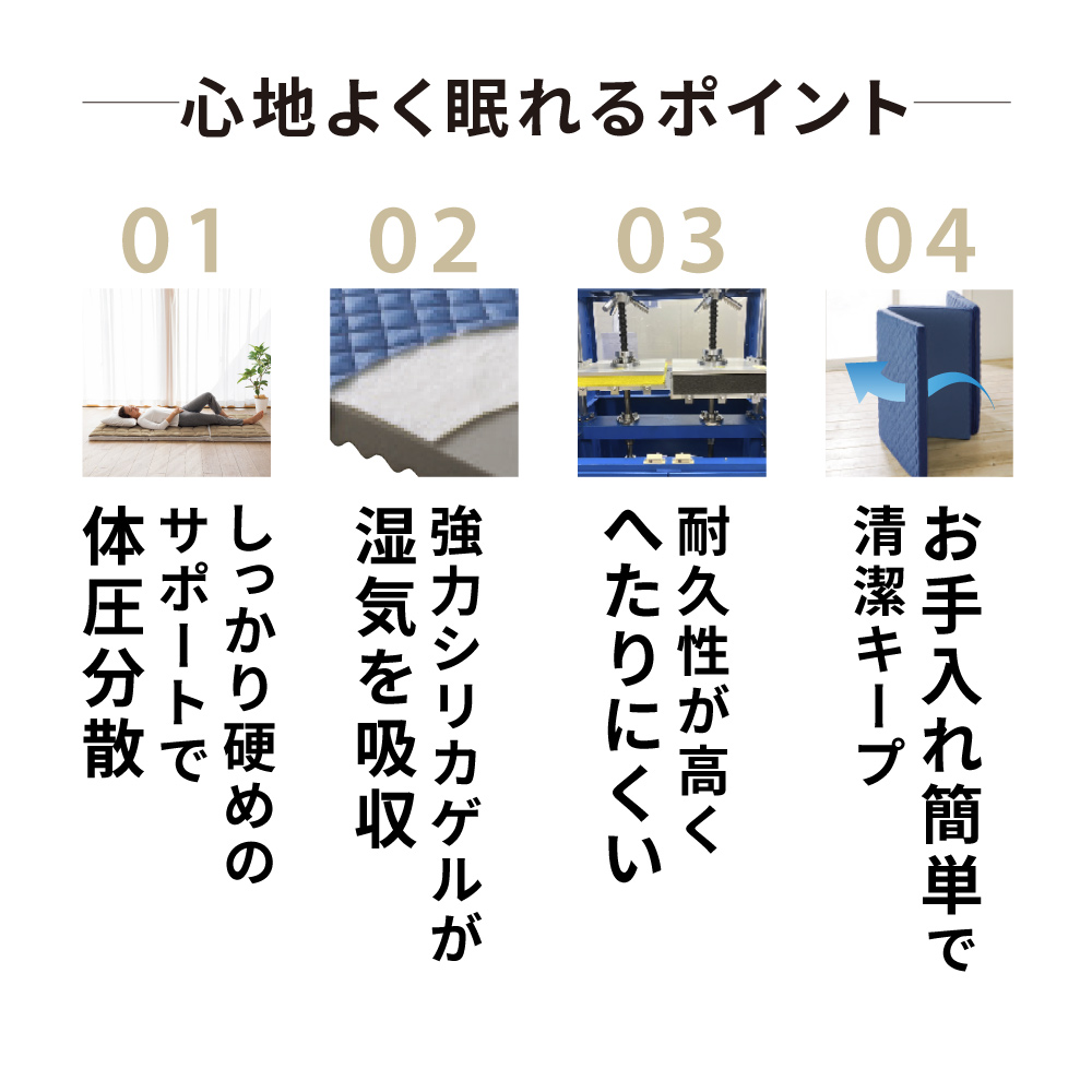「調湿くん(R)」の強力シリカゲルが汗や湿気をぐんぐん吸収し、汗臭・加齢臭を吸着。汗や湿気が気になる方におすすめです。さらに体圧分散性と耐久性の高さを実現した、コスパ◎のマットレスです。強力シリカゲルが湿気を撃退!寝心地もGOODなお手頃マットレス。「調湿くん(R)」の強力シリカゲルが汗や湿気をぐんぐん吸収し、汗臭・加齢臭を吸着。汗や湿気が気になる方におすすめです。さらに体圧分散性と耐久性の高さを実現した、コスパ◎のマットレスです。