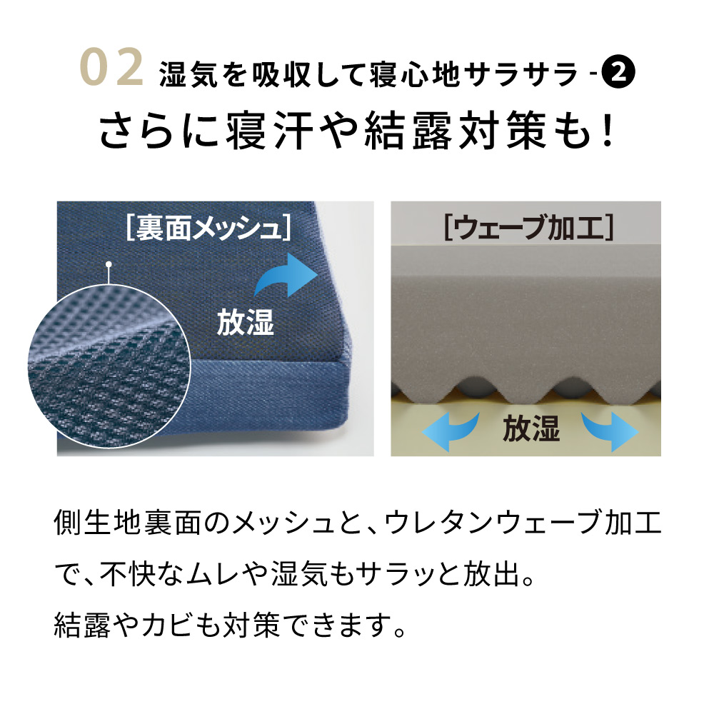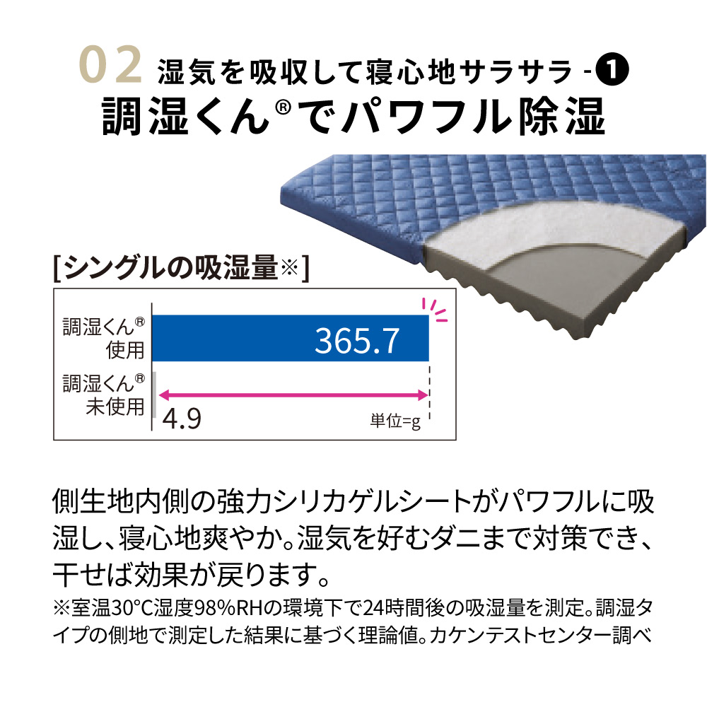 調湿タイプ(厚さ7cm・12cm)調湿くん(R)のシリカゲルが、汗臭や加齢臭の原因物質まで吸着。ジメジメやダニだけでなく、ニオイも防げるマットレスです。