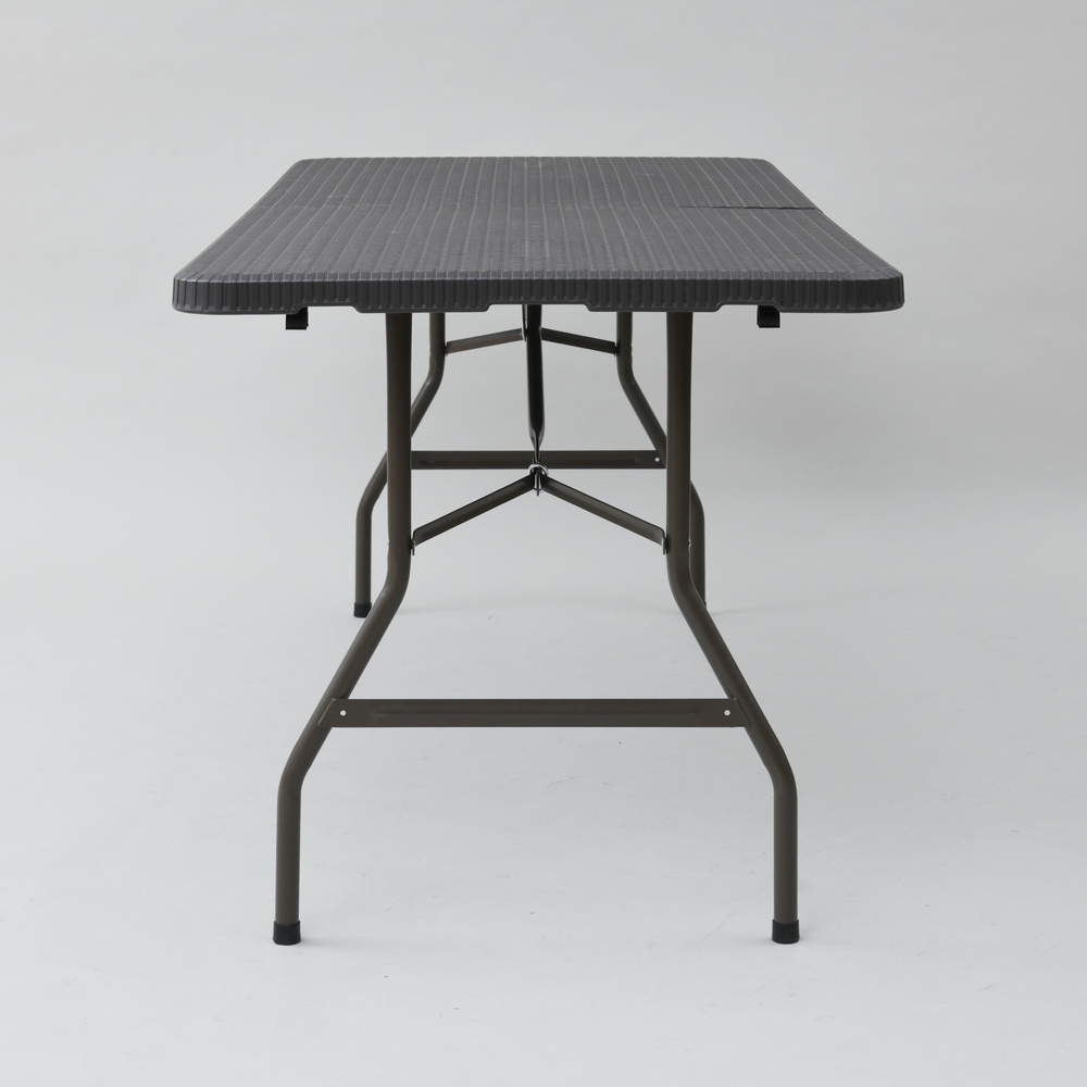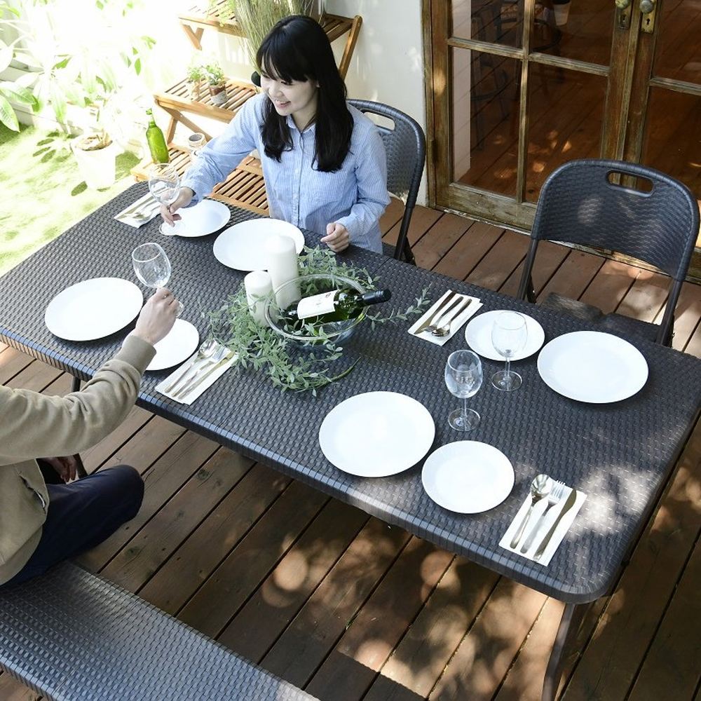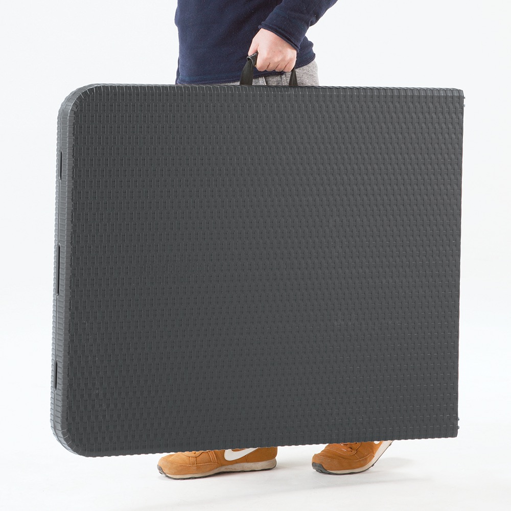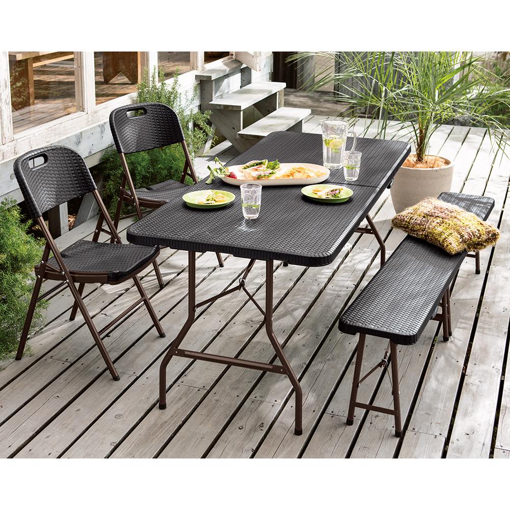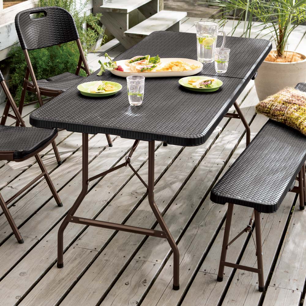 ※スチール製品は素材の特性上、経年変化でサビが発生致します。長くお使い頂くために、お届け直後の錆止め材の塗布をお薦めしております。 また、ご使用開始後も定期的なお手入れをお薦めします。(お手入れ方法&取り付け方法)特大ワイドサイズで作業がしやすく、使わない時には折りたたんでコンパクトに収納できる屋外用テーブル。ラタンのような高級感があり、樹脂製なので汚れても水洗いができてお手入れも簡単。寄せ植えづくりから、BBQのサブテーブルや立食パーティ、フリマにもとっても便利な折り畳みテーブル。幅180cmのワイドサイズは何をするにも広々ゆったり使うことができます。ラタン調折りたたみファイチャーシリーズは他に折りたたみチェアやベンチもご用意。折り畳んでコンパクトに収納可能なので、車のトランクにも入り、レジャーにぴったり。持ち手が付いているので持ち運びも簡単です。BBQやピクニック時に最適。ラタンの風合いを再現した樹脂製のウィッカー調ガーデンテーブル。樹脂製なので、汚れても水洗いができてお手入れも簡単。