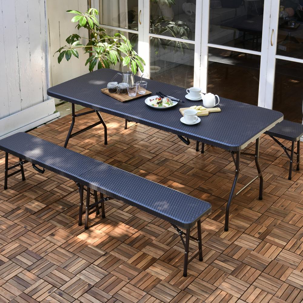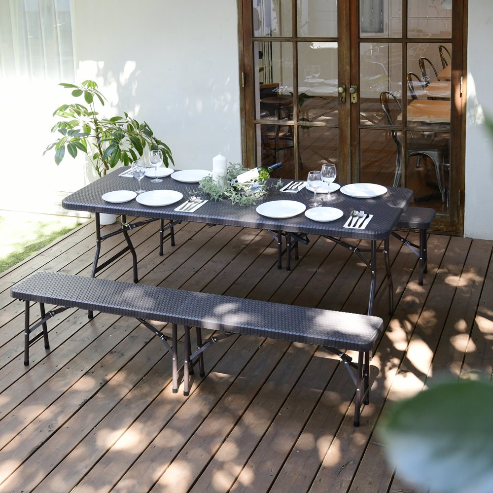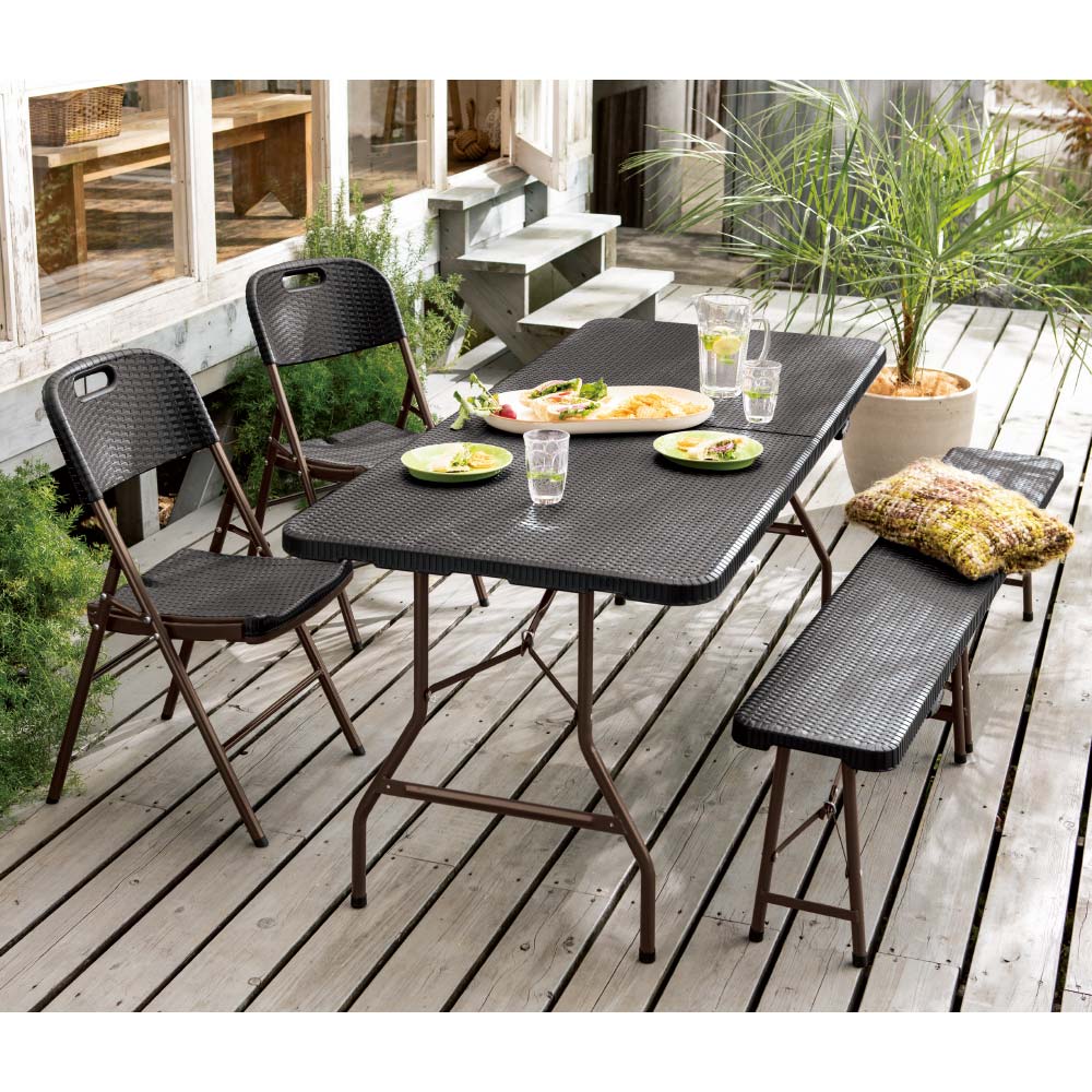 ※スチール製品は素材の特性上、経年変化でサビが発生致します。長くお使い頂くために、お届け直後の錆止め材の塗布をお薦めしております。 また、ご使用開始後も定期的なお手入れをお薦めします。(お手入れ方法&取り付け方法)折りたたみ式で使わない時には折りたたんでコンパクトに収納できる屋外用ベンチ。ラタンのような高級感があり、樹脂製なので汚れても水洗いができてお手入れも簡単。バーベキューや屋外パーティ、イベントなど使い勝手の良いウィッカー調ベンチ。同シリーズのテーブルやチェアと合わせて使っても。使いたい時に広げて、使わない時には折り畳んでコンパクトに収納可能なので、車のトランクにも入り、レジャーにぴったり。ラタンの風合いを再現した樹脂製のウィッカー調ガーデンベンチ。樹脂製なので、汚れても水洗いができてお手入れも簡単。