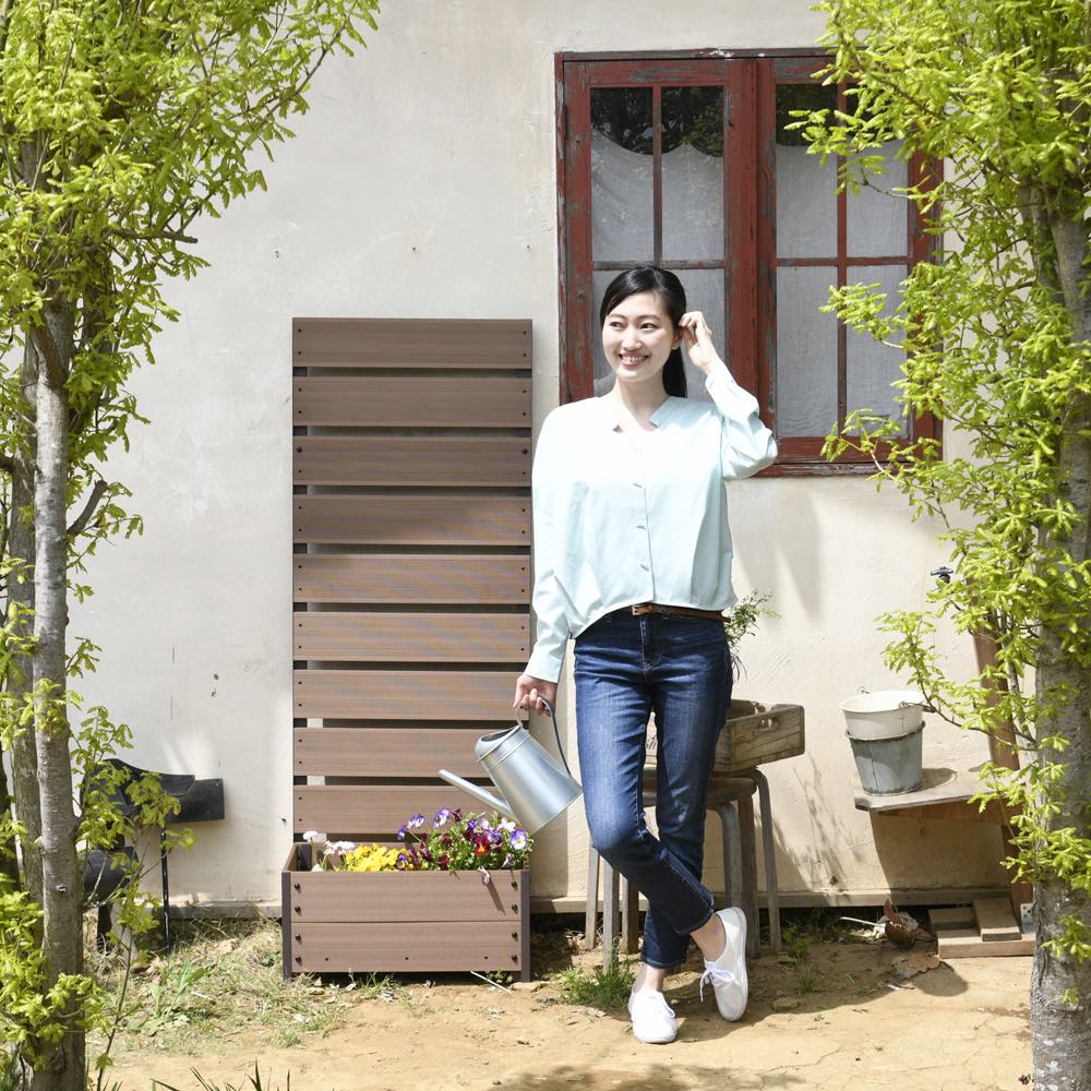 人工木でハンギングOK、土のない場所でも設置できて視線カット。植栽とハンギングのダブルで季節の花々をあしらえば、目隠し効果の高いデザインながら威圧感を和らげられます。天然の風合いそのままの人工木は腐食に強く、美しさを永く保ちます。外構に合わせて選べる2色展開。