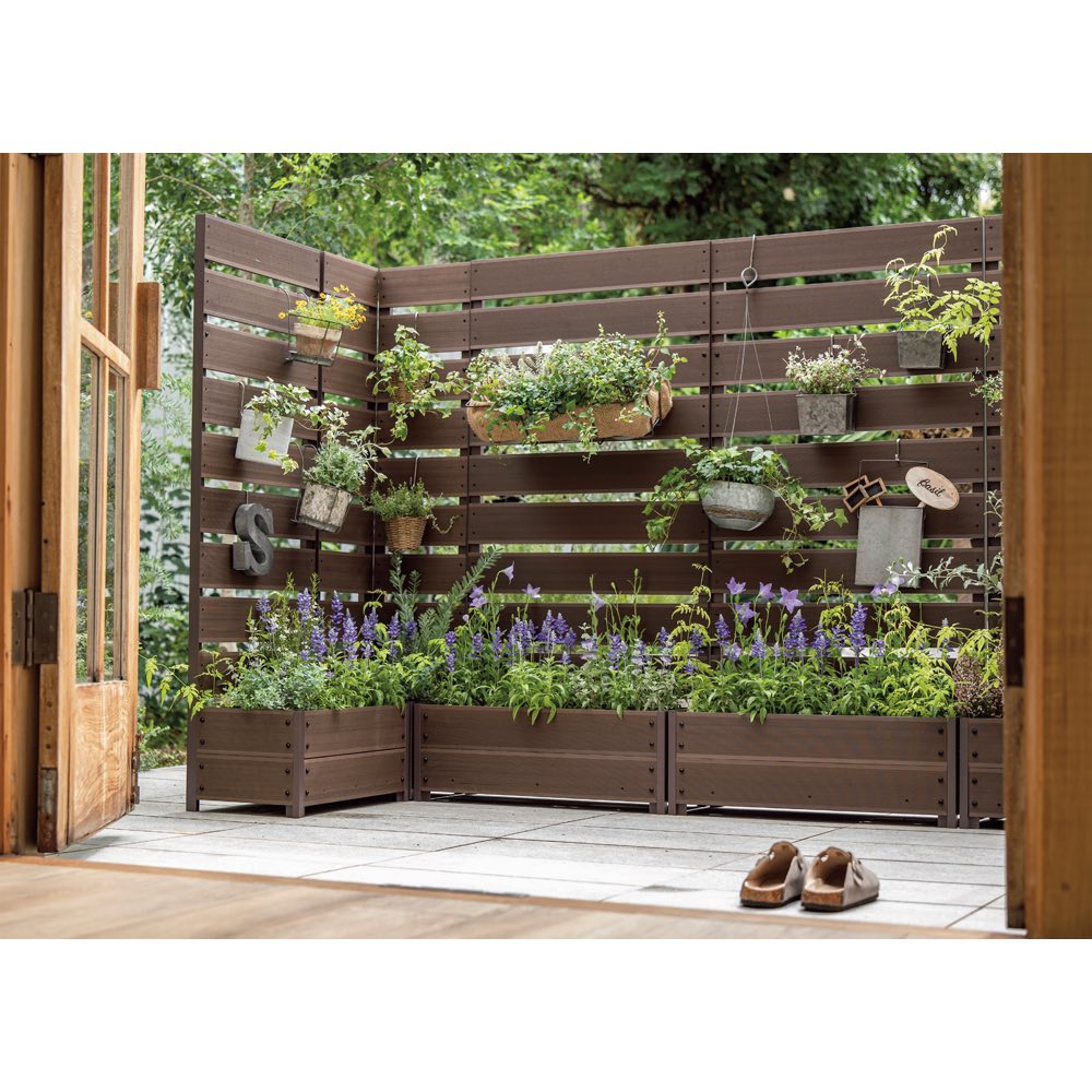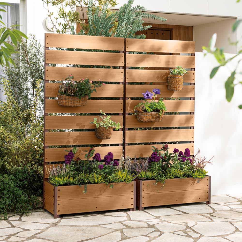 人工木でハンギングOK、土のない場所でも設置できて視線カット。植栽とハンギングのダブルで季節の花々をあしらえば、目隠し効果の高いデザインながら威圧感を和らげられます。天然の風合いそのままの人工木は腐食に強く、美しさを永く保ちます。外構に合わせて選べる2色展開。