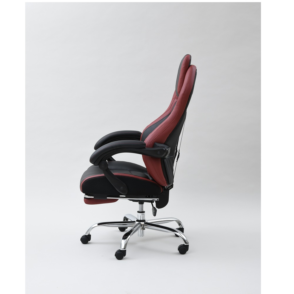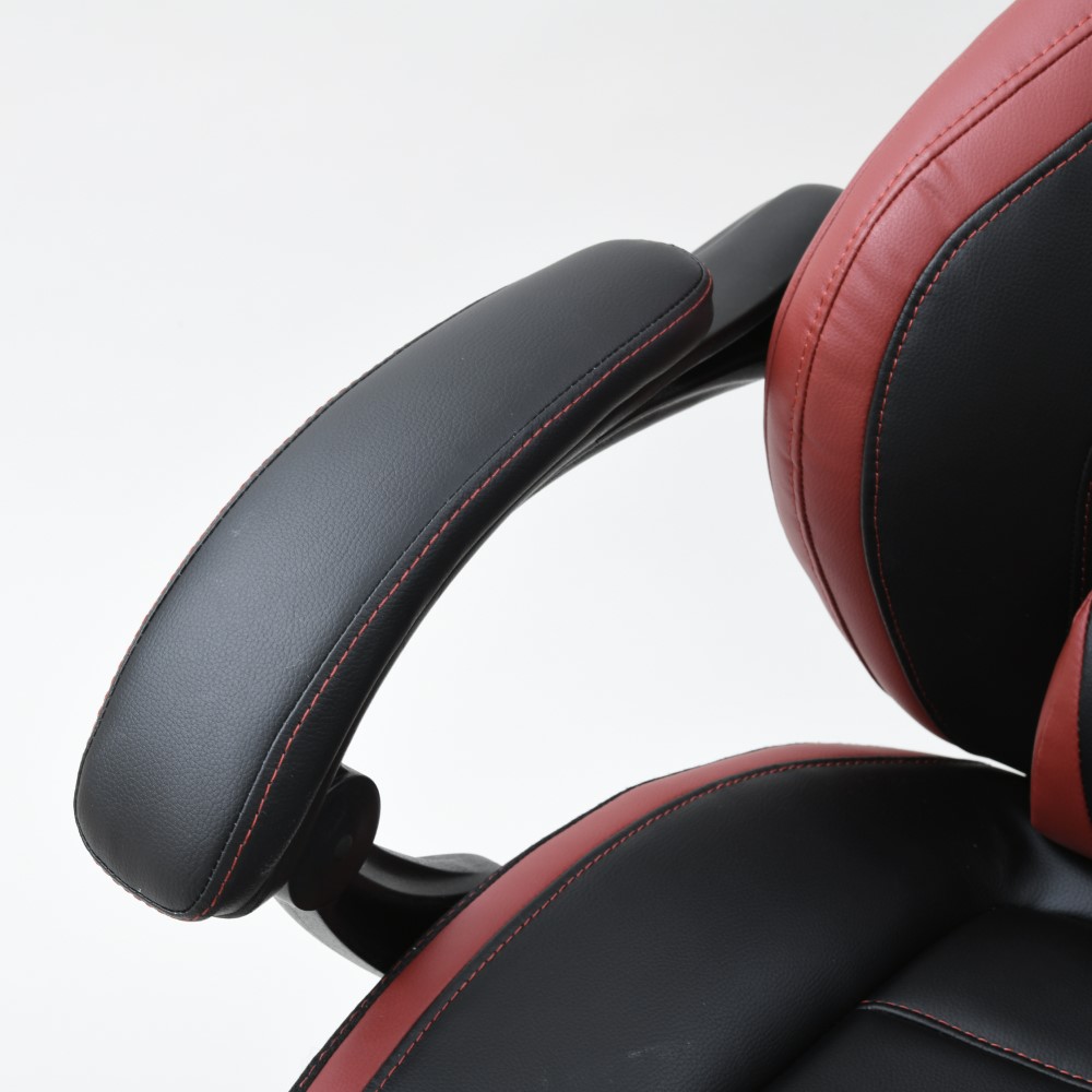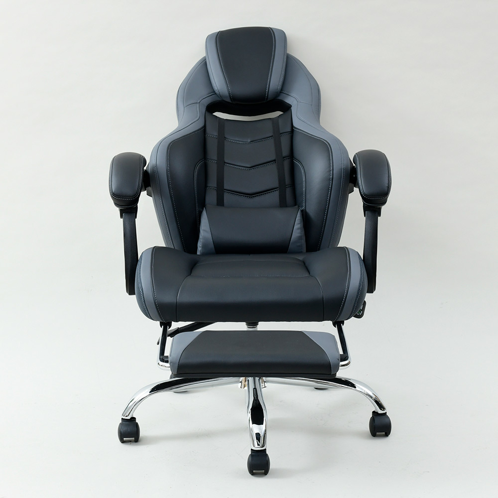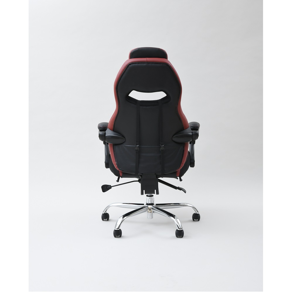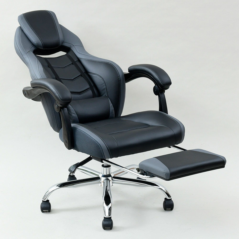 なんとオットマン付き&170度リクライニング!プレイもリラックスも、もちろん自宅でのお仕事もお任せ。憧れのゲーミングチェアをお手頃価格で。ゲームも、勉強も、リラックスも ●臀部から腰・頭まで、しっかりホールド。長時間のゲームも疲れにくい仕様です。●座面昇降や回転の機能付きで、在宅勤務や受験勉強にもおすすめ。●最大170度の無段階リクライニングに加え、なんとオットマン付き。まるで漫画喫茶にいるようにリラックスできます。一番の推しポイント!無段階リクライニング&オットマン●なんと最大170度リクライニング。●しかも無段階調節可能!自分にとって心地よい角度で固定できます。●座部下に収納できるオットマン付き。●170度にリクライニング&オットマンを引き出せば、まるでマンガ喫茶にいるような気持ち。ふわーっとリラックスできます。そのほかにも欲しい機能がいっぱい!●座面昇降式。体やデスクに合わせて高さ調整できます。●座面は回転します。●可動腰当て付き。腰当てがあるとないとで、座ったときのフィット感&疲れ具合が違います。●ヘッドにもクッションが。頭をしっかり支え、ゲームも仕事も安定した姿勢で行うことが可能に。インテリアになじみやすいデザイン●ゲーミングチェアーは、見た目が鮮やかなものが多いですが、本品は色味のトーンを抑えめに仕上げています。●書斎にもマッチしやすい、合わせやすいデザインです。スタッフのチェア評価(5段階評価)●おしゃれ度 … 2.9●腰のらくちん度 … 3.8●設置時の圧迫感のなさ度(数字が高ければ高いほど圧迫感を与えません。)… 2.0●背もたれの通気度 … 2.5●座面の硬さ度(数字が大きいほどしっかり硬め、小さいほどふんわりやわらかです。) … 3.6〇170度リクライニング&オットマンのW使いの至福感は、本当に気持ちよくたまらないものでした。ゲーミングチェアらしい大きめのサイズ感ではありますが、その分ほどよい柔らかさで包み込んでくれます。ゲーム以外にも、リモートワークや、読書や動画鑑賞などのリラックスタイムにもおすすめです(温泉施設の休憩所や漫画喫茶にいるような、リラックス感が得られると思います!)。ゲーミングチェアとしてはお求めやすい価格も魅力です。ぜひお試し下さい。