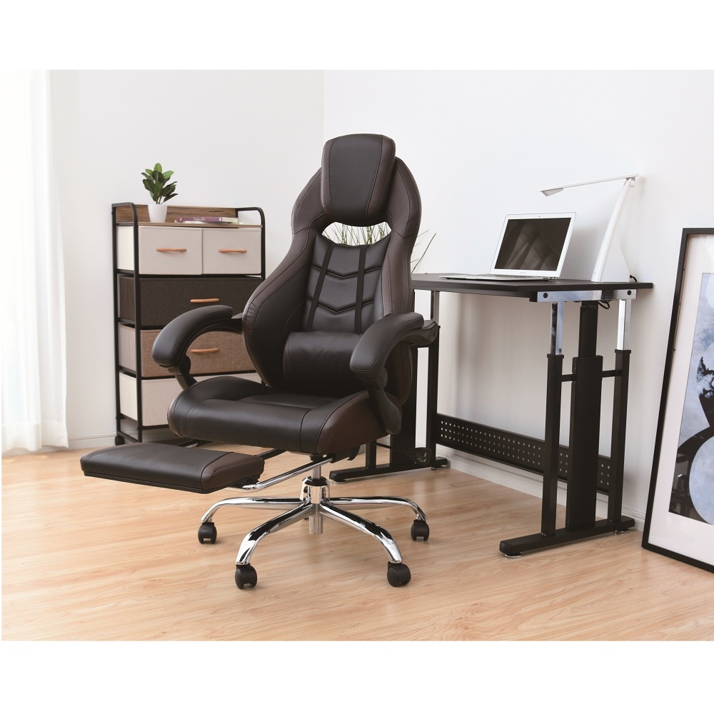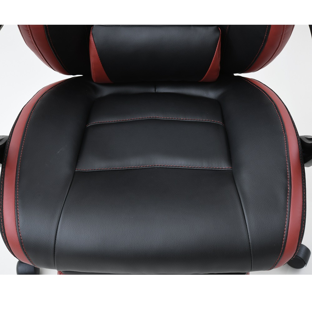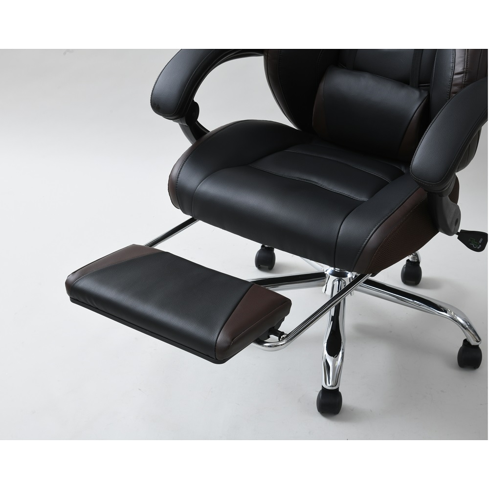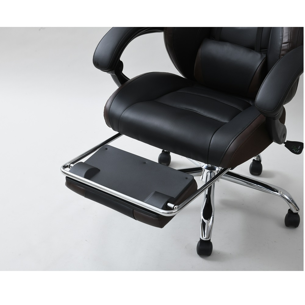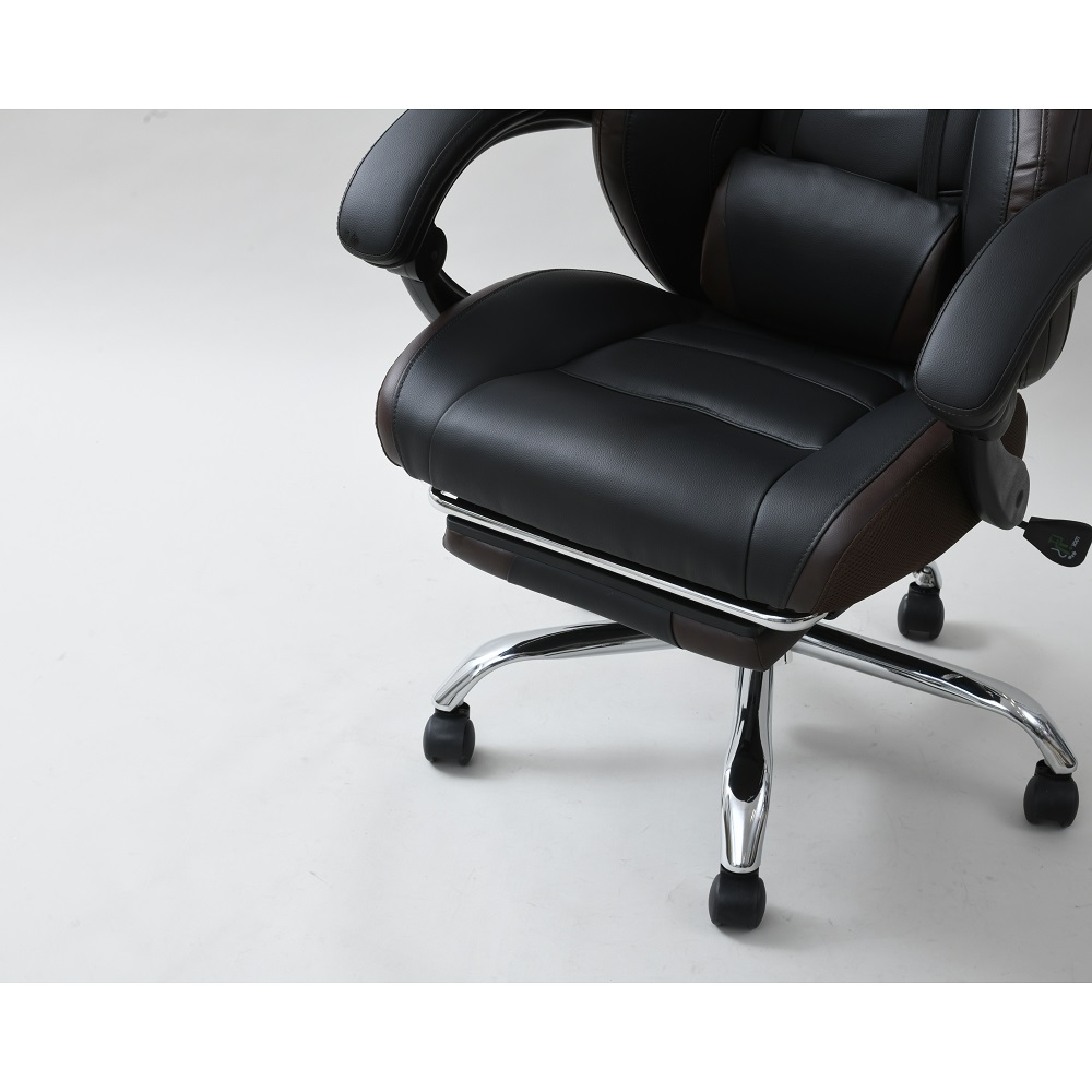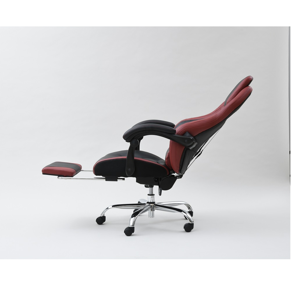 なんとオットマン付き&170度リクライニング!プレイもリラックスも、もちろん自宅でのお仕事もお任せ。憧れのゲーミングチェアをお手頃価格で。ゲームも、勉強も、リラックスも ●臀部から腰・頭まで、しっかりホールド。長時間のゲームも疲れにくい仕様です。●座面昇降や回転の機能付きで、在宅勤務や受験勉強にもおすすめ。●最大170度の無段階リクライニングに加え、なんとオットマン付き。まるで漫画喫茶にいるようにリラックスできます。一番の推しポイント!無段階リクライニング&オットマン●なんと最大170度リクライニング。●しかも無段階調節可能!自分にとって心地よい角度で固定できます。●座部下に収納できるオットマン付き。●170度にリクライニング&オットマンを引き出せば、まるでマンガ喫茶にいるような気持ち。ふわーっとリラックスできます。そのほかにも欲しい機能がいっぱい!●座面昇降式。体やデスクに合わせて高さ調整できます。●座面は回転します。●可動腰当て付き。腰当てがあるとないとで、座ったときのフィット感&疲れ具合が違います。●ヘッドにもクッションが。頭をしっかり支え、ゲームも仕事も安定した姿勢で行うことが可能に。インテリアになじみやすいデザイン●ゲーミングチェアーは、見た目が鮮やかなものが多いですが、本品は色味のトーンを抑えめに仕上げています。●書斎にもマッチしやすい、合わせやすいデザインです。スタッフのチェア評価(5段階評価)●おしゃれ度 … 2.9●腰のらくちん度 … 3.8●設置時の圧迫感のなさ度(数字が高ければ高いほど圧迫感を与えません。)… 2.0●背もたれの通気度 … 2.5●座面の硬さ度(数字が大きいほどしっかり硬め、小さいほどふんわりやわらかです。) … 3.6〇170度リクライニング&オットマンのW使いの至福感は、本当に気持ちよくたまらないものでした。ゲーミングチェアらしい大きめのサイズ感ではありますが、その分ほどよい柔らかさで包み込んでくれます。ゲーム以外にも、リモートワークや、読書や動画鑑賞などのリラックスタイムにもおすすめです(温泉施設の休憩所や漫画喫茶にいるような、リラックス感が得られると思います!)。ゲーミングチェアとしてはお求めやすい価格も魅力です。ぜひお試し下さい。
