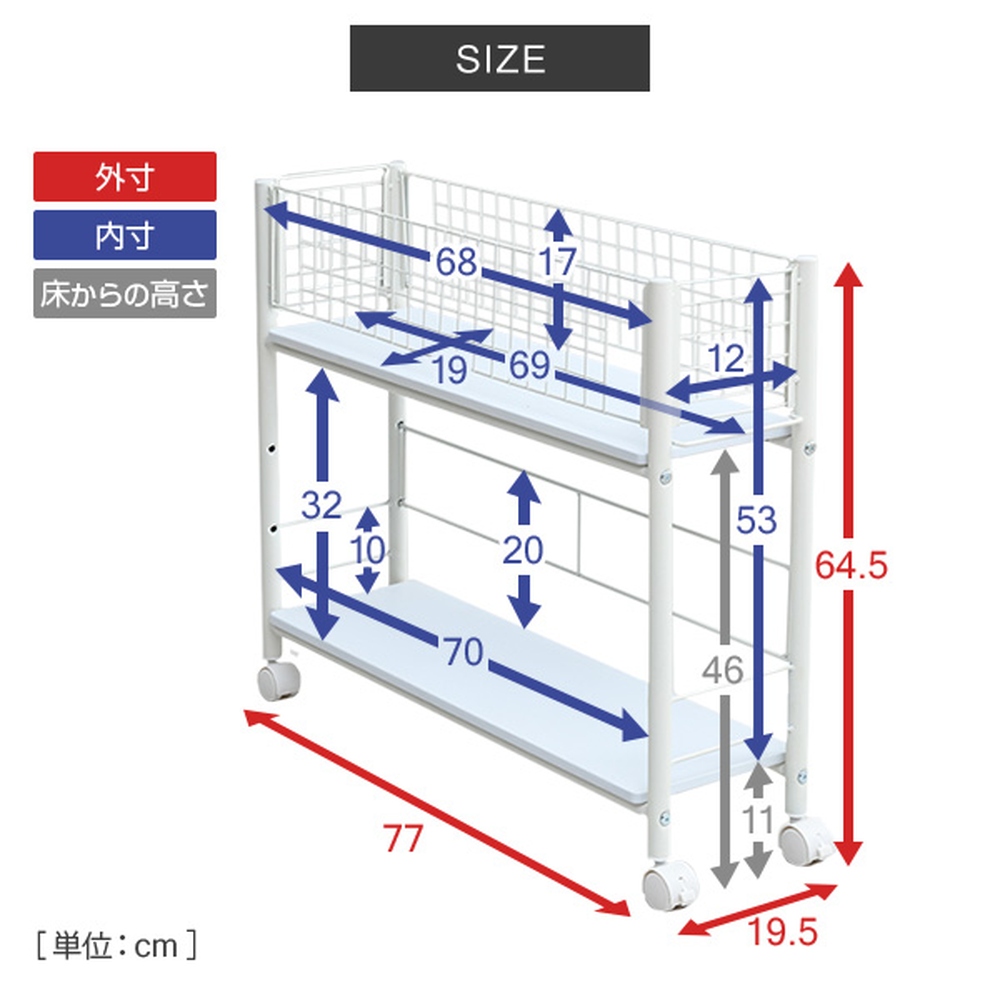 押し入れの奥行を無駄にすることなく収納スペースに出来る収納ラック。キャスター付きなので、押し入れからの出し入れもラクラクです。すっきりな押し入れをお手伝いする収納ラック●奥行が深くて使いづらい押し入れは、ラックを使って分類収納。●奥行77cmの押し入れラックを使えばスペースをフルに使える収納空間に。●押し入れ下段はかがまないと物が取り出せないので、キャスター付きのラックがおすすめ。●前後に出し入れできるので、たくさん収納しても楽に物を取り出せます。収納物に応じてサイズや使い方が選べます●サイズは幅20cm・26cm・38cm・44cmの4サイズをご用意。●収納物やスペースに応じてお選びください。◇幅20cm:スリムな幅20cmは漫画やDVDの収納にピッタリなサイズです◇幅26cm:箱ティッシュにピッタリなサイズで日用品のストック収納におすすめ。◇幅38cm:A4サイズのファイルボックスがピッタリ。おもちゃの収納等にも。◇幅44cm:ミシンや家電のしまえる大型サイズです。●棚板は取り外しが出来るので、背の高い家電等の収納にも対応。●上段のサイドネットも取り外しが可能なので、用途に応じてお試しください。