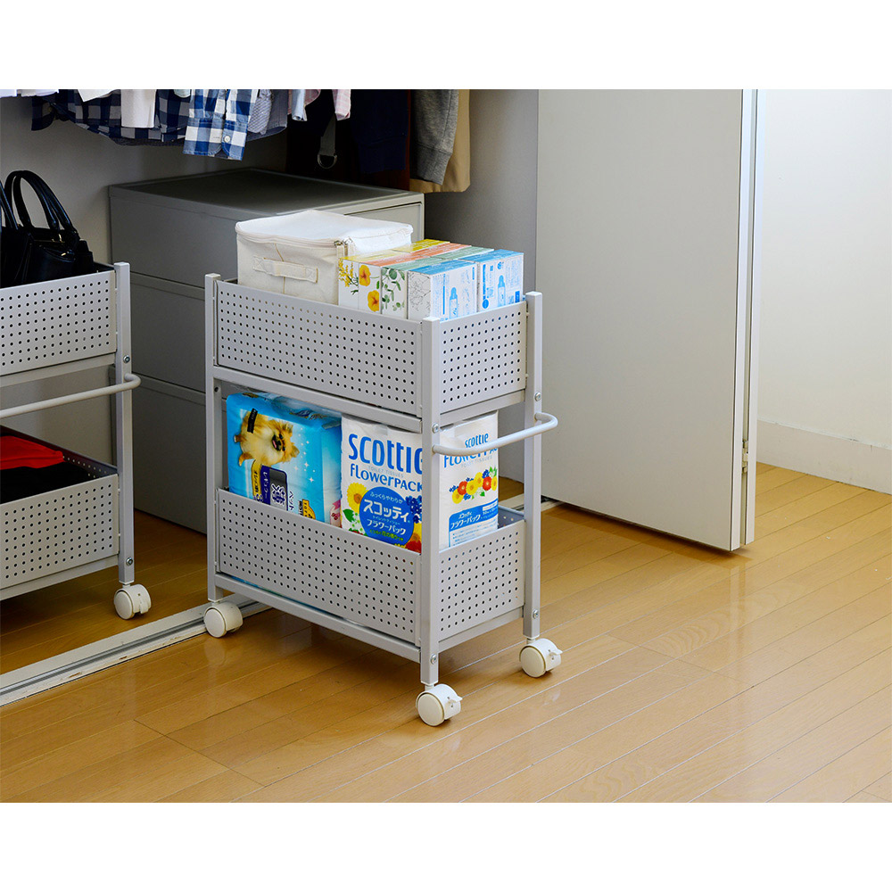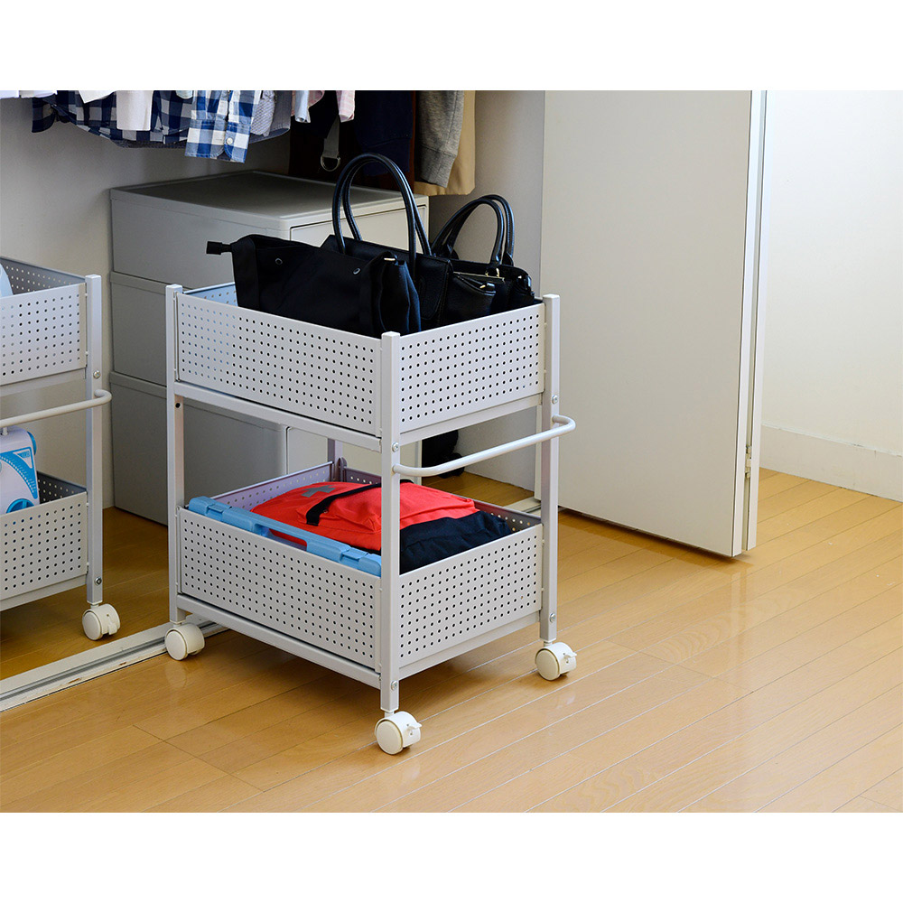 総耐荷重40キロの頑丈クローゼット収納ワゴン。奥行があって使いづらいクローゼット下のスペースを、効率的な収納空間に変えられます。スッキリしたクローゼットの実現をお手伝いする。出し入れ楽々な頑丈クローゼット収納ラック。日用品の収納から、食材のストックまで対応可能です。奥行が深く、クローゼットのハンガー下を有効活用するのは中々使い勝手が難しいもの。そんなお悩みを解決してくれる、整理整頓に便利な収納ラックです。●クローゼットの奥行を無駄なく使うことが出来るキャスター付き収納ラック。●洋服下のスペースをスッキリ区切って有効活用出来る商品です。●総耐荷重40キロ(棚1段あたり20キロ)で、ガンガンものが収納出来ます。●サイドのパネルは着脱可能なので、アレンジも自在。●片側オープンにすれば、こぼれ落ちを防ぎながら出し入れも楽になります。●大きいハンドルとキャスターで、ものを入れても出し入れ楽々。●日用品や食材のストックからアイロンや季節家電まで収納出来ます。