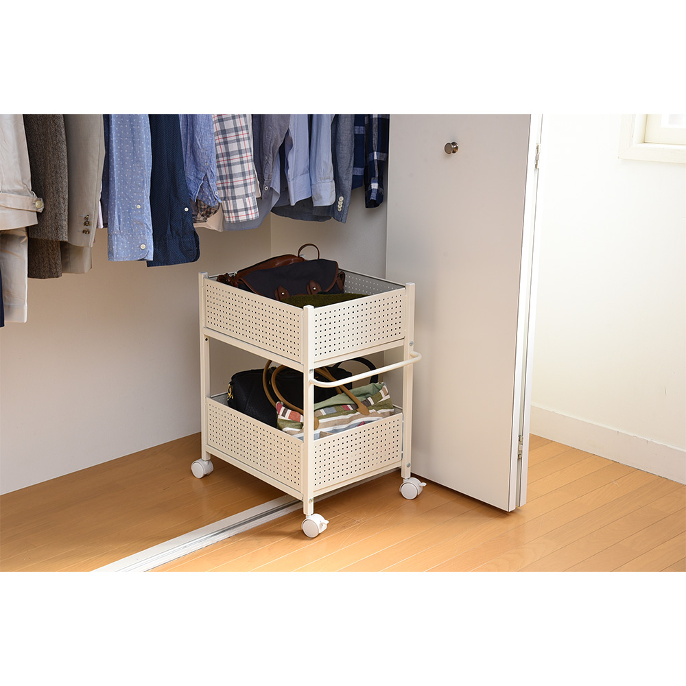総耐荷重40キロの頑丈クローゼット収納ワゴン。奥行があって使いづらいクローゼット下のスペースを、効率的な収納空間に変えられます。スッキリしたクローゼットの実現をお手伝いする。出し入れ楽々な頑丈クローゼット収納ラック。日用品の収納から、食材のストックまで対応可能です。奥行が深く、クローゼットのハンガー下を有効活用するのは中々使い勝手が難しいもの。そんなお悩みを解決してくれる、整理整頓に便利な収納ラックです。●クローゼットの奥行を無駄なく使うことが出来るキャスター付き収納ラック。●洋服下のスペースをスッキリ区切って有効活用出来る商品です。●幅展開は26・38・44の3サイズ。収納物やスペースに応じてお選びください。●総耐荷重40キロ(棚1段あたり20キロ)で、ガンガンものが収納出来ます。●サイドのパネルは着脱可能なので、アレンジも自在。●片側オープンにすれば、こぼれ落ちを防ぎながら出し入れも楽になります。●大きいハンドルとキャスターで、ものを入れても出し入れ楽々。●日用品や食材のストックからアイロンや季節家電まで収納出来ます。