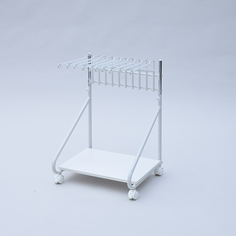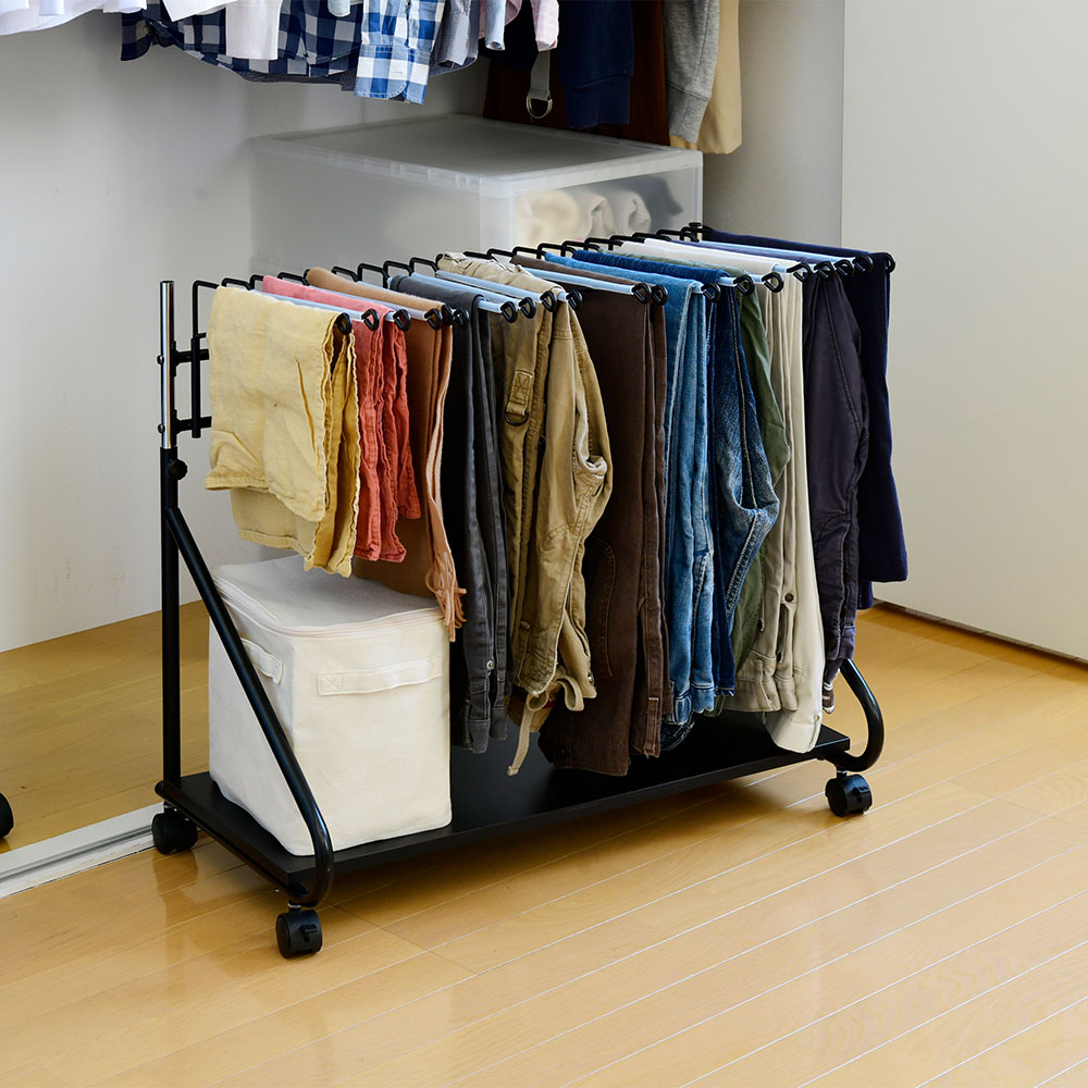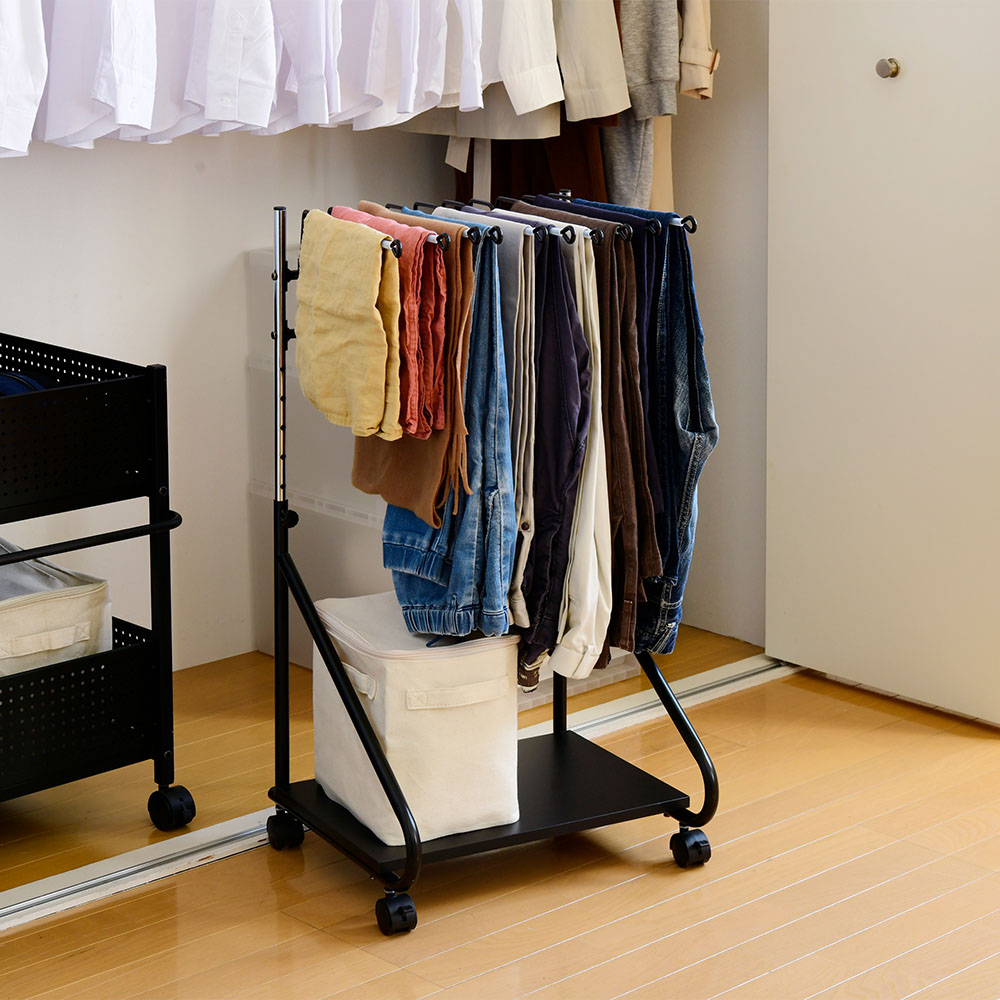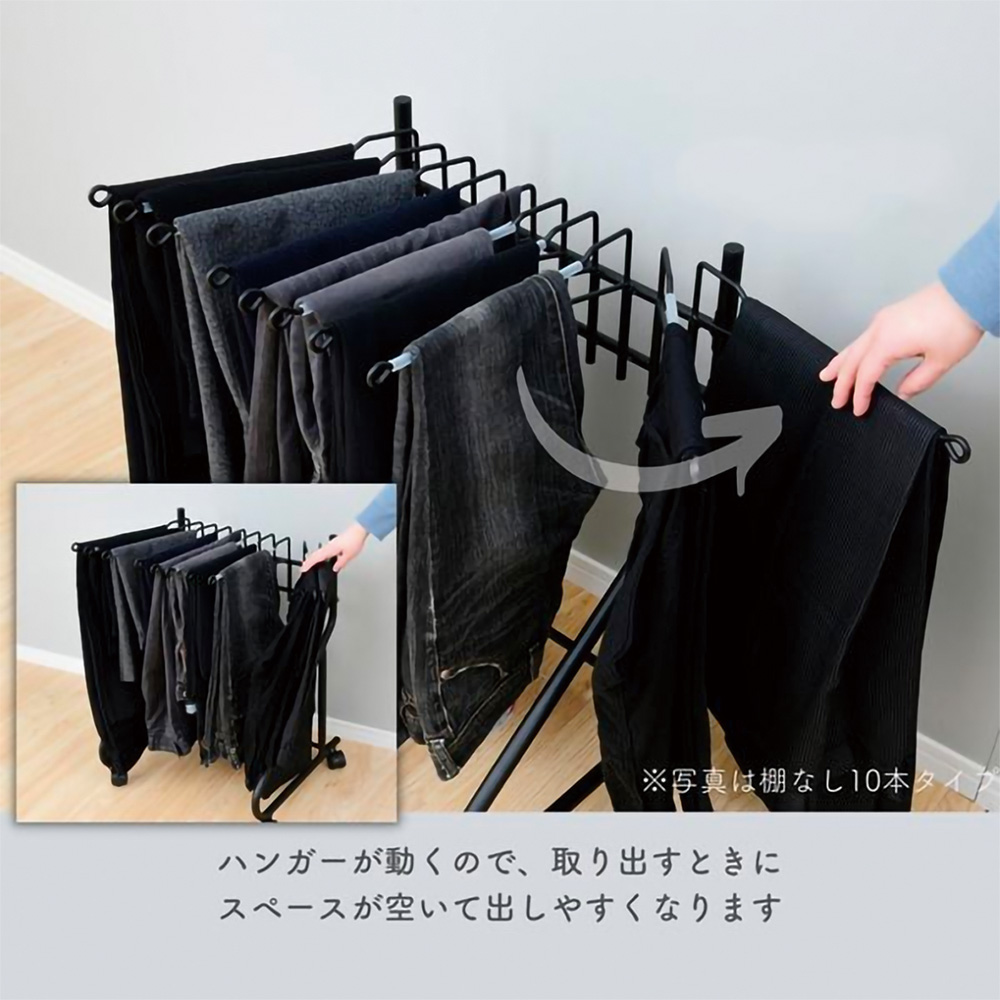 クローゼット下のデッドスペースを有効活用。ボトムス類をたたまずスッキリ収納出来るパンツハンガー。たっぷりかけても出し入れ楽々なパンツハンガー●収納に困るボトムス類は、たたまずにサッと掛けるだけ。●クローゼット下のスペースを有効活用して、ボトムス類をスッキリ収納。●上から掛けて上から出せるので、出し入れも楽な設計。●ハンガーは左右にスイングして動くので、取り出しやすくなります。●掛けたパンツがずれ落ちにくいよう、ハンガーにはシリコン製の滑り止め付き。●ハンガーの高さは調節できるので、服の下を有効活用出来ます。●高さを最小の69cmに設定すれば、押し入れの下段にも収まります。●ハンガーの下には棚板付きで、バッグや小物などを収納することが出来ます。●収納量やスペースに合わせて、3サイズの中からお選びください。【収納目安】■レギュラー:幅46.5cm ハンガー10本■ワイド:幅74cm ハンガー20本
