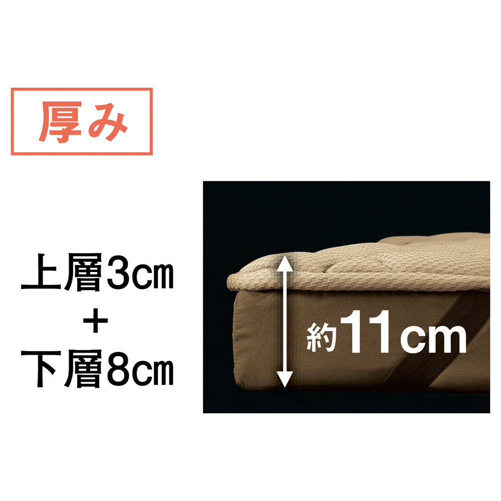 中わた入りの上層パッドで全身をふんわり受け止め、下層マットレスでしっかりサポート。腰部分はさらに硬めのウレタンを使用し、安心の寝心地です。