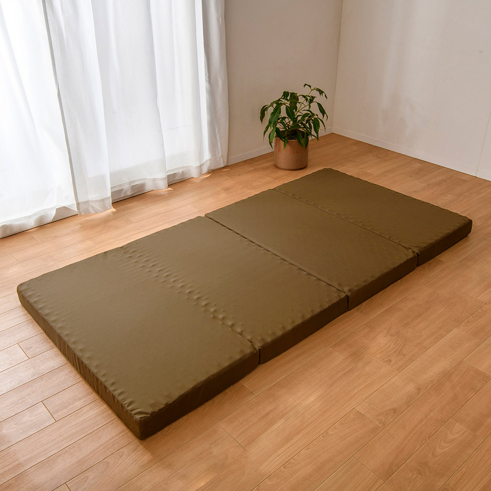 床にたまりやすい湿気をサラッと放湿してくれます。また、4つ折りタイプなので、横にして立てかけることもできます。