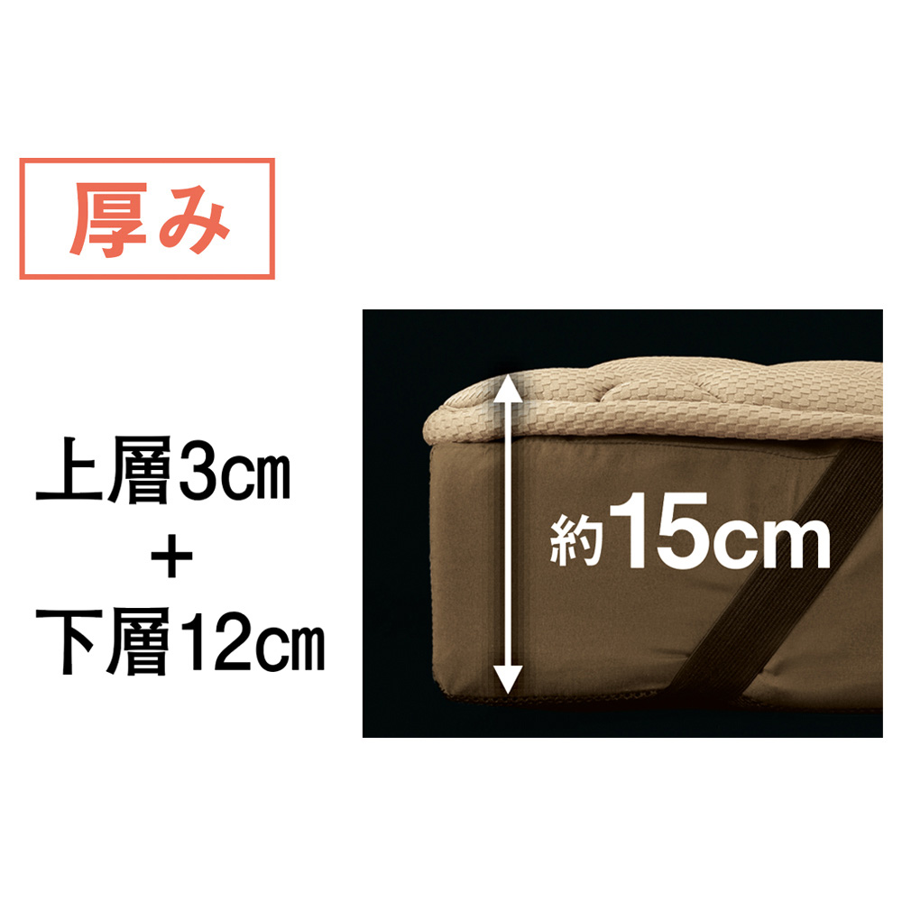 中わた入りの上層パッドで全身をふんわり受け止め、下層マットレスでしっかりサポート。腰部分はさらに硬めのウレタンを使用し、安心の寝心地です。