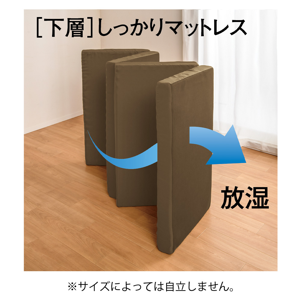 ”収納のディノス”が考えた大人気の敷き寝具!寝心地にはこだわりたいけど、敷布団の収納スペースがなくて…というお悩みありませんか?上層パッド+下層マットレス(4つ折りタイプ)の2層式で、そのお悩みを解決。狭い場所でもコンパクトに収納出来ます。上層、下層分割式なのでお手入れもラクラクです。快適な寝心地と省スペースを両立したマットレスをお探しのあなたに!クローゼットにぴったりの収納上手&寝心地◎のよくばり敷布団。クローゼットにぴったり!収納上手&寝心地◎のよくばり敷布団寝心地にはこだわりたいけど、敷布団の収納スペースがなくて…というお悩みありませんか?上層パッド+下層マットレス(4つ折りタイプ)の2層式で、そのお悩みを解決。このクオリティでリーズナブルな価格も要注目です!【うれしさ盛りだくさん!充実の機能&仕様】●「上層+下層」の2層タイプでお手入れラクラク上層のパッドシーツは、4隅ゴムで取り外しラクラク!もちろん洗濯機OKなので、サッと洗えていつも清潔キープできます。下層のマットレスは、4つ折りタイプなので、クローゼットにもぴったり!立てかけることもできるので、湿気対策もバッチリ。お手入れラクラクです!●「ふかふか&しっかり」こだわりの寝心地【 ふかふか上層:パッドシーツ 】ふっくらボリューム!中わたのボリュームがたっぷり!表地のニットと組み合わせることで、さらにふかふか感をアップさせました。【 しっかり下層:マットレス 】硬質+高反発の2層構造!硬質ウレタン:床付きを感じさせない硬めなウレタンを、中央2枚をさらに硬めバランス設計にすることで、腰に優しい設計に。高反発ウレタン:寝返りをサポートする優れたクッション性の高反発ウレタンに、凸凹加工を加えることで、さらに心地よい寝心地に。ふかふか&しっかりの快適な寝心地を実現。優れた体圧分散データを実証しました。●いつでも清潔上層のパッドシーツの中わたには、「防ダニ」「抗菌・防臭」効果のある、テイジン・マイティトップ2を使用。さらに、側生地には、吸水・拡散・速乾性のあるニット生地を採用。寝汗が気になる時期でも、サラッと吸汗&快適です。もちろん洗濯機OK!いつでも清潔キープできます。●湿気のジメジメ対策下層マットレスの側生地の床面には、通気性抜群の立体メッシュ生地を採用。床にたまりやすい湿気をサラッと放湿してくれます。また、4つ折りタイプなので、横にして立てかけることもできます。※サイズによって自立しない場合があります。定期的に風通しのよい場所に立てかけてください。
