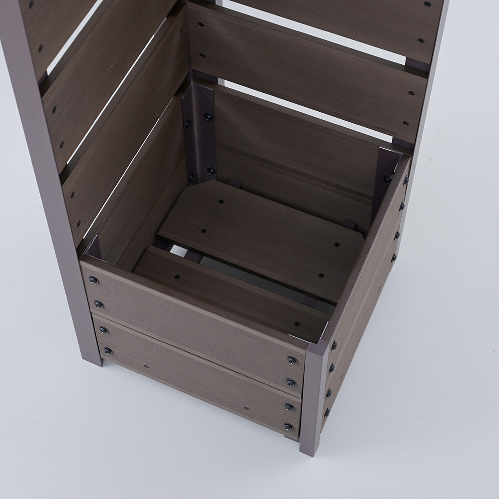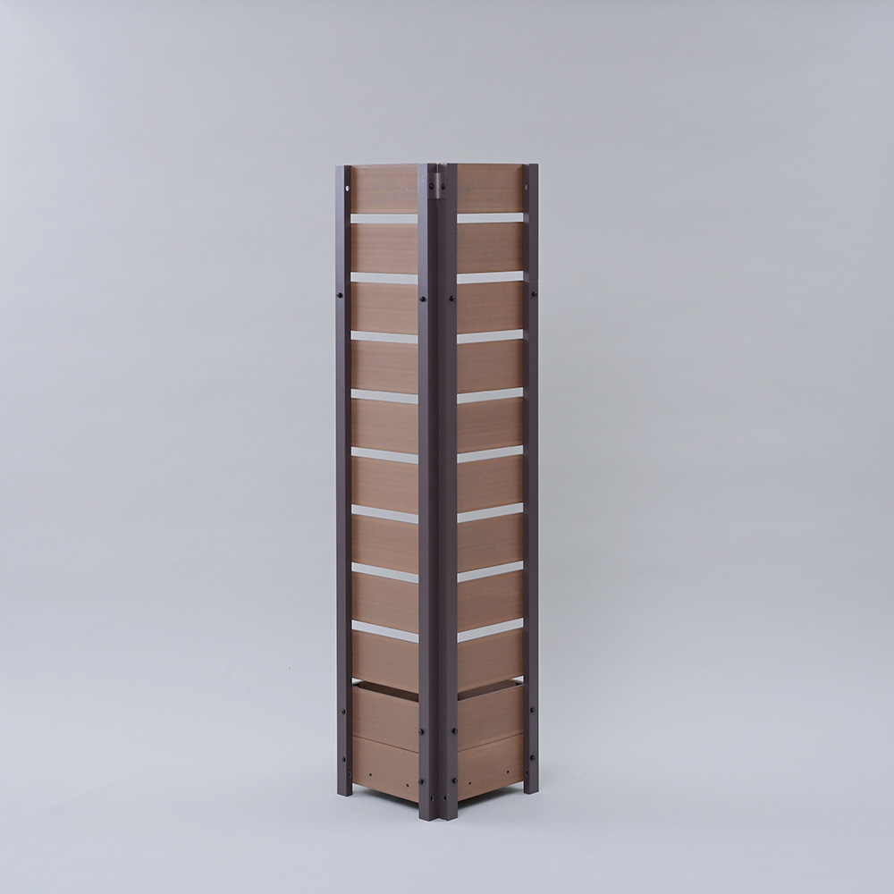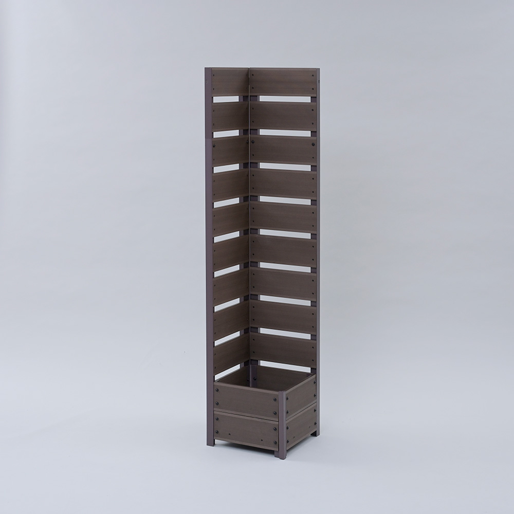 人工木でハンギングOK、土のない場所でも設置できて視線カット。植栽とハンギングのダブルで季節の花々をあしらえば、目隠し効果の高いデザインながら威圧感を和らげられます。天然の風合いそのままの人工木は腐食に強く、美しさを長く保ちます。外構に合わせて選べる2色展開。