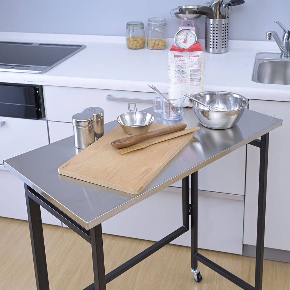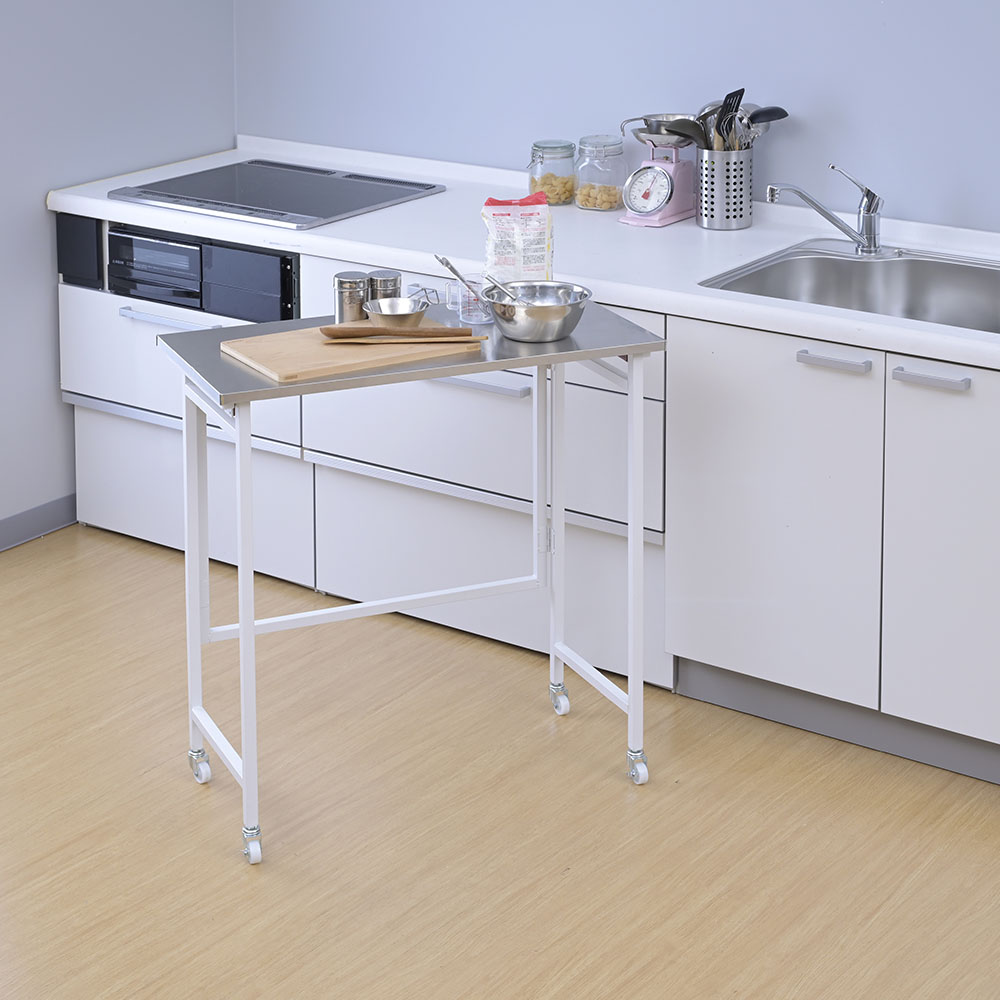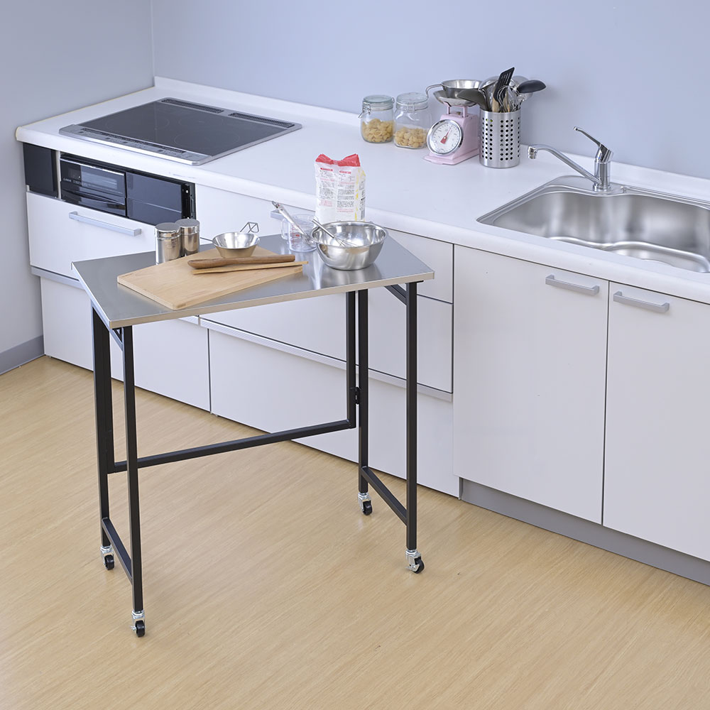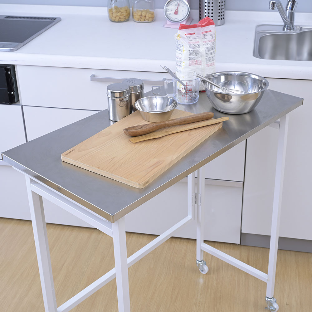 キャスターを取り付けるだけで使えるステンレス天板の折り畳みテーブル。一般的なキッチンカウンターと同じ高さなので、作業もしやすいのが魅力です。キッチンの作業スペースを増やせるシンプルなテーブルが登場です。●届いたらキャスターを付けるだけの簡単設置が可能●天板の高さは作業のしやすい高さに設計。●一般的なキッチンカウンターとほぼ同じ高さの仕様です。●天板は熱に強くてお手入れしやすいステンレス張り。●耐熱温度は約200℃です。●使わない時は折りたたんでしまっておくことも可能。●厚みは約7cmになるので、狭い隙間等にしまっておくことも可能です。●天板下にはゴミ箱を設置するのもおすすめ。●スペースを効率的に使うことが出来ます。