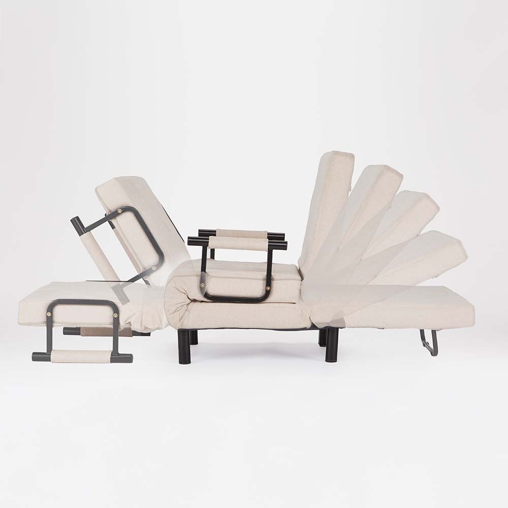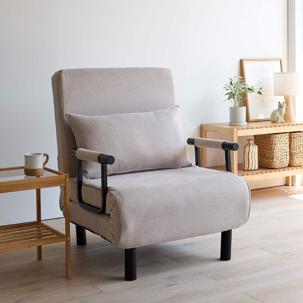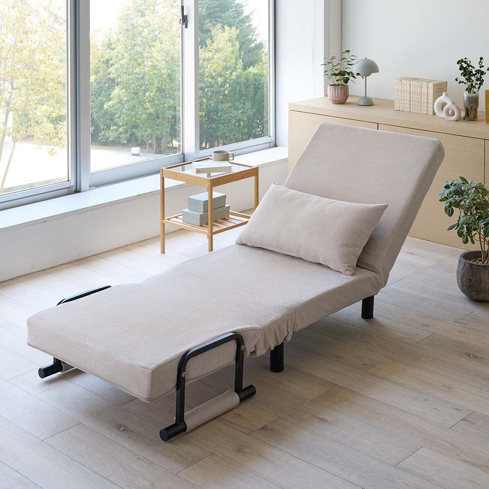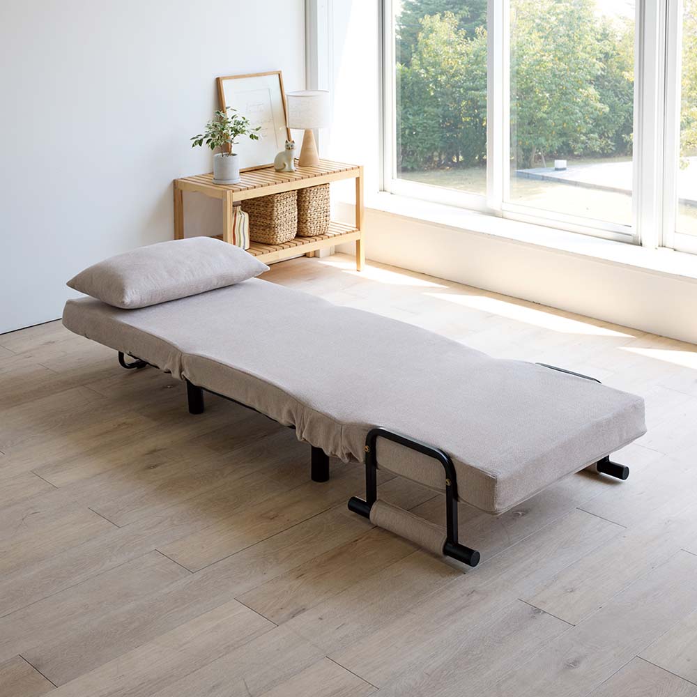 おうち時間の特等席に!普段使いのコンパクトな省スペースソファから、カウチ、ベッドへと変身自在、くつろぎ方はフリースタイル。ゆったりゆとりのあるサイズも自慢です。プライベートタイムの特等席!3WAYにくつろげるソファベッド!くつろぎ方に合わせて3WAYに変形するソファベッド。リビングにはもちろんですが、書斎や空き部屋などリビング以外でくつろぎ空間が欲しい方や、ワンルームにお住まいの方にもおすすめです。たまには脚を延ばしてくつろげる場所が欲しいけど置くスペースが…というお悩みにも、普段はコンパクトなソファとして置けるから大丈夫!あなたの求めるくつろぎ方に合わせてくれるこのソファベッドは、あなただけの特等席となること間違いなし!1.ソファスタイル省スペースでコンパクトなソファスタイル。とはいってもクッション部のサイズは1Pは幅66cm、2P106cmもあるから普段のくつろぎスペースとして申し分ないサイズ感。背もたれも高めで首元あたりまでしっかりサポートしてくれます。クッションを外して深く座ってくつろいだり、座りながら作業をしたい時は腰の後ろに置いて座るのもオススメ。適度にコシのある柔らかさで快適な座り心地です。2.カウチスタイルソファスタイルの座面を手前に伸ばしたスタイル。脚をぐーっとのばして、よりリラックスしたひとときを過ごすのにぴったり。本を読んだり、スマホでSNSやショッピングを楽しんだり、時間を忘れてくつろげます。背もたれは6段階にリクライニングでき、ハイバックで頭当たりまで背もたれが来るので、うたた寝するのにもいいですね。3.ベッドスタイルカウチスタイルの状態で背もたれの裏面に折り畳んである脚を取り出し、背もたれを最後まで倒したら、フルフラットのベッドの出来上がり!普段使いはもちろん、仮眠用や来客用のベッドとしてもお使いいただけます。クッション付きだからそのまま枕として使えるのも嬉しいポイント。カバーリング仕様でお手入れラクラク♪クッションも本体もカバーが取り外し可能です。肘を取りはずせば上から下まで全部剥がせます。(肘のカバーも外れます!)汚れが気になったり、汗をかいたりした時なんかは、カバーをまるっとはがして洗濯機へ!日常使いでも気を遣わずに、清潔感をキープできます。幅70cmと幅110cmの2サイズ展開幅70 …お一人使いで設置スペースや費用を少しでも抑えたい方にオススメです幅110 …お一人使いでよりゆったりくつろぎたい方にオススメ。大人二人でも無理なくぴったり座れるくらいのサイズ感です。